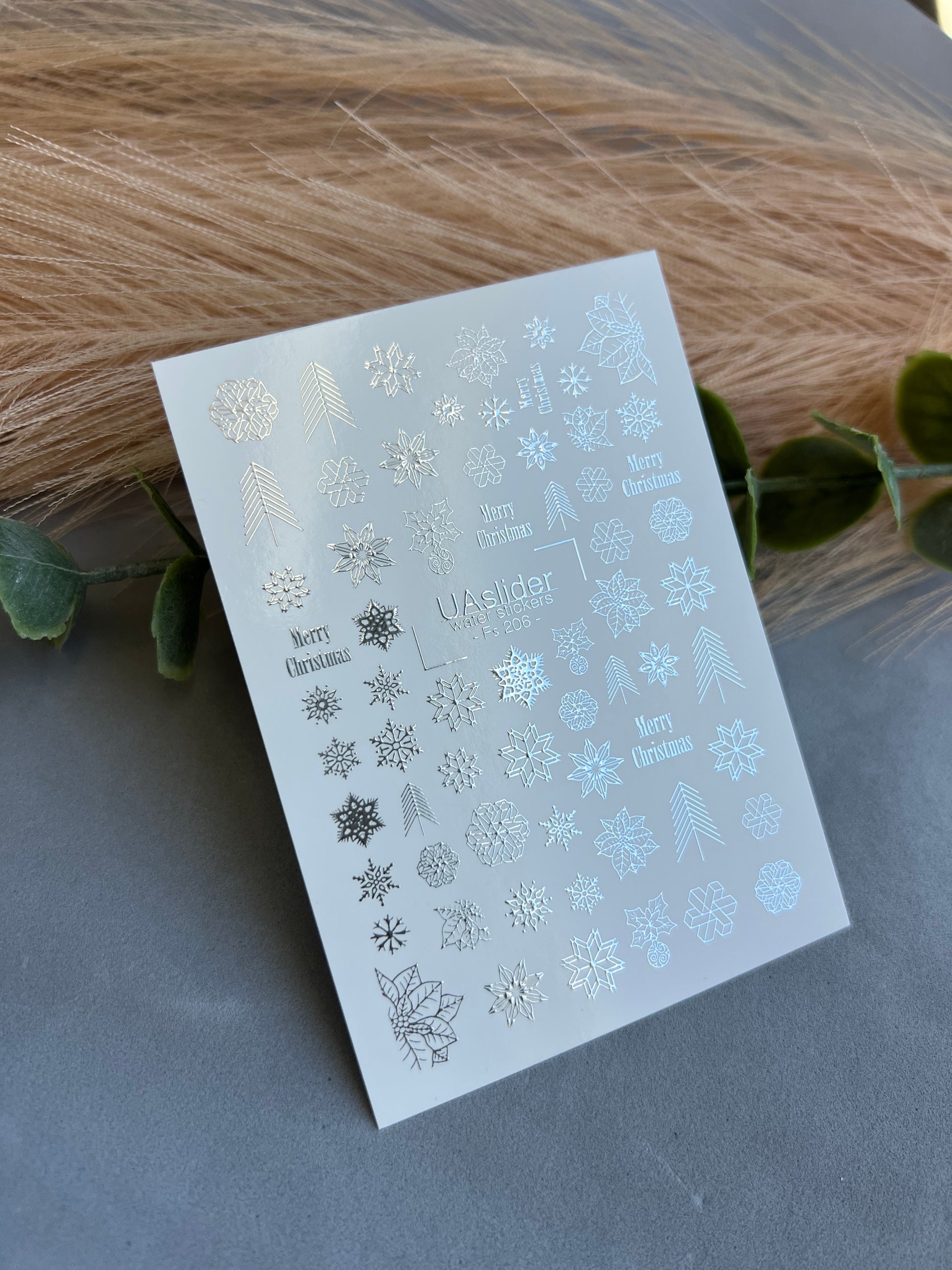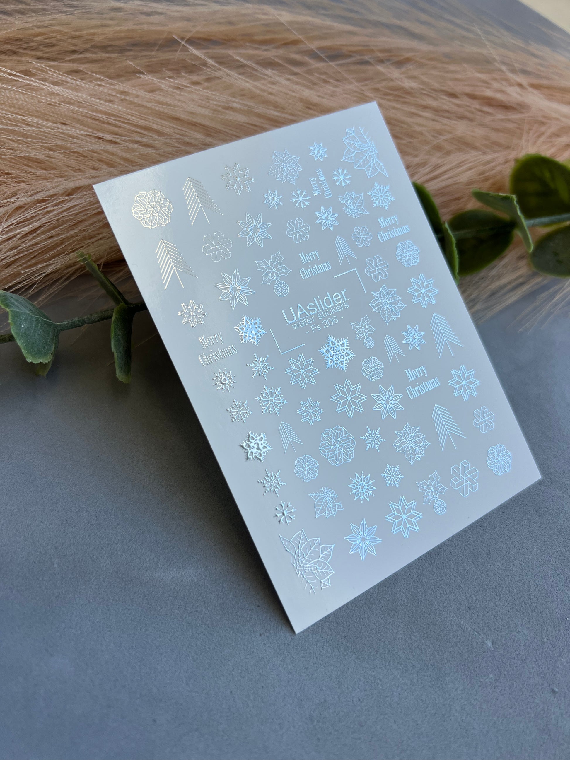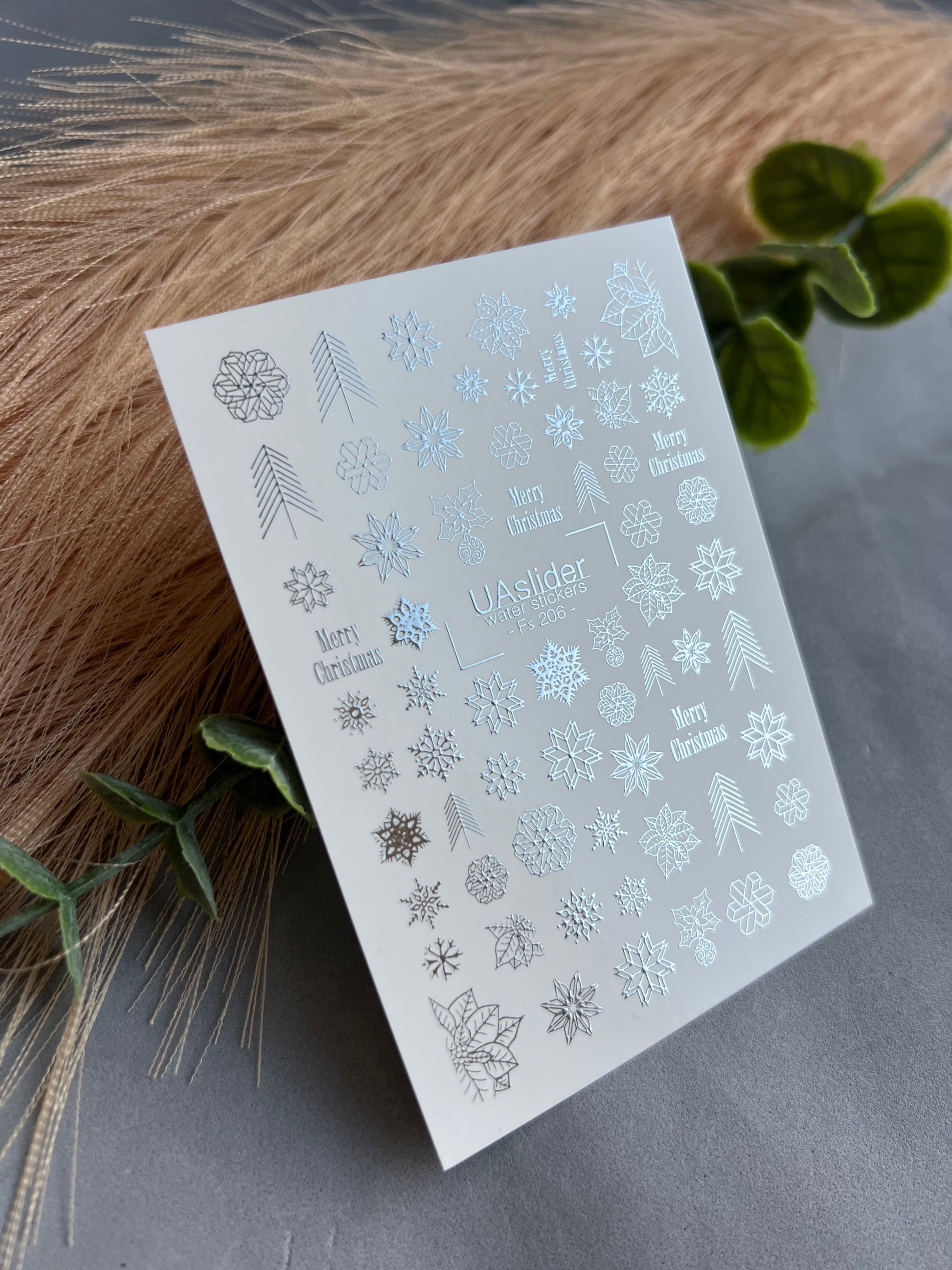 Naklejka wodna na paznokcie Fs-206 | Naklejki wodne na paznokcie z motywem świątecznych płatków śniegu | Gwiazda betlejemska i świąteczne napisy