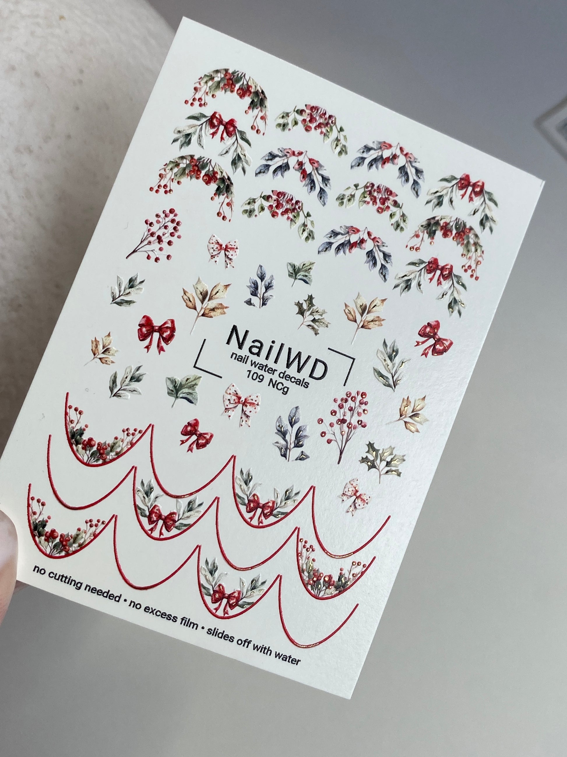 Water Slide Nail Decals with festive motifs — red berries, green branches, and delicate bows. A charming Christmas and winter design that adds a joyful touch to any manicure.