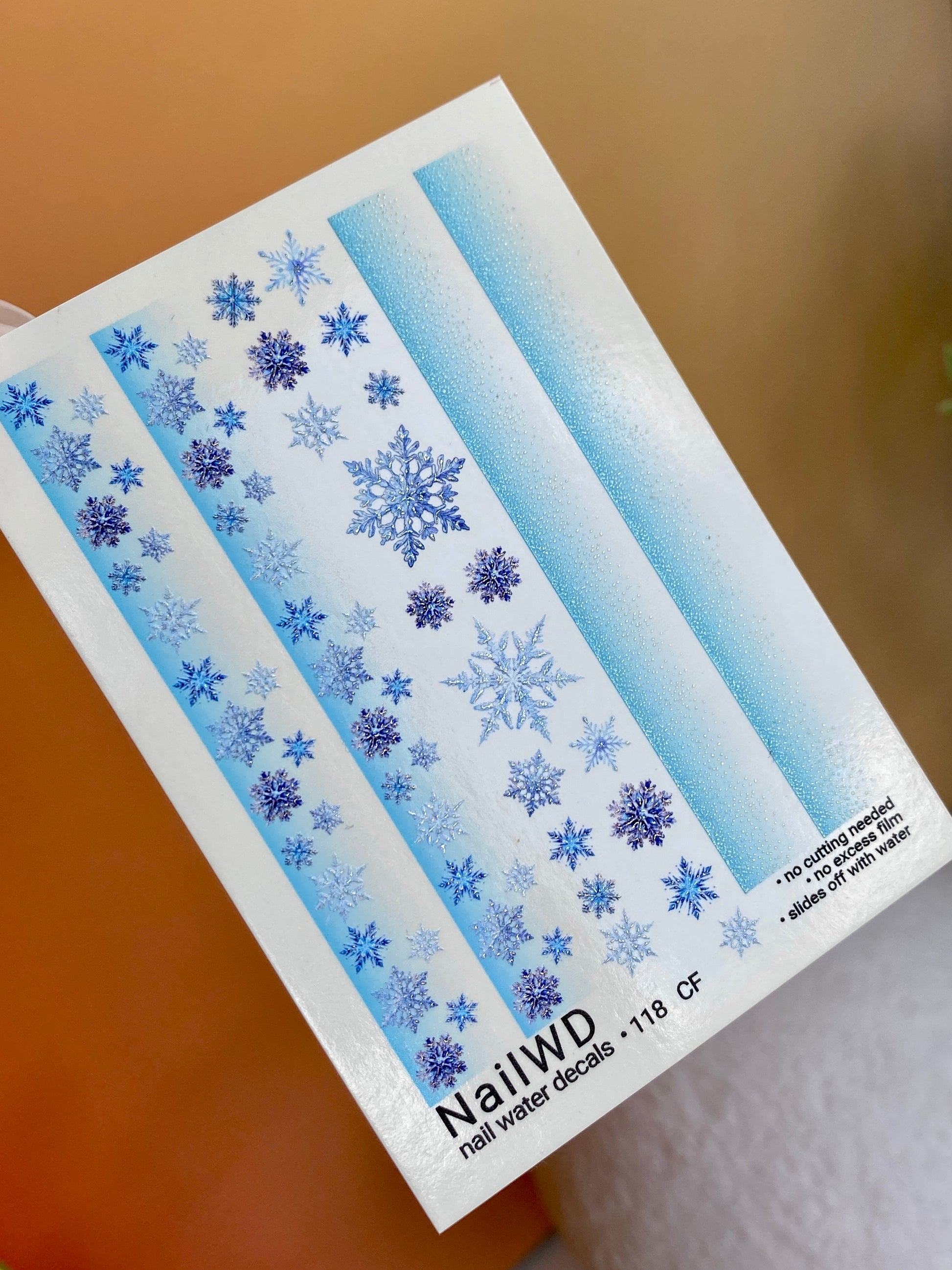 Winter-inspired Water Slide Nail Decals featuring delicate snowflakes on soft blue ombre backgrounds. These Nail Water Decals (also known as water transfer nail decals or nail tattoos) are applied with water — simply cut, soak, and slide.