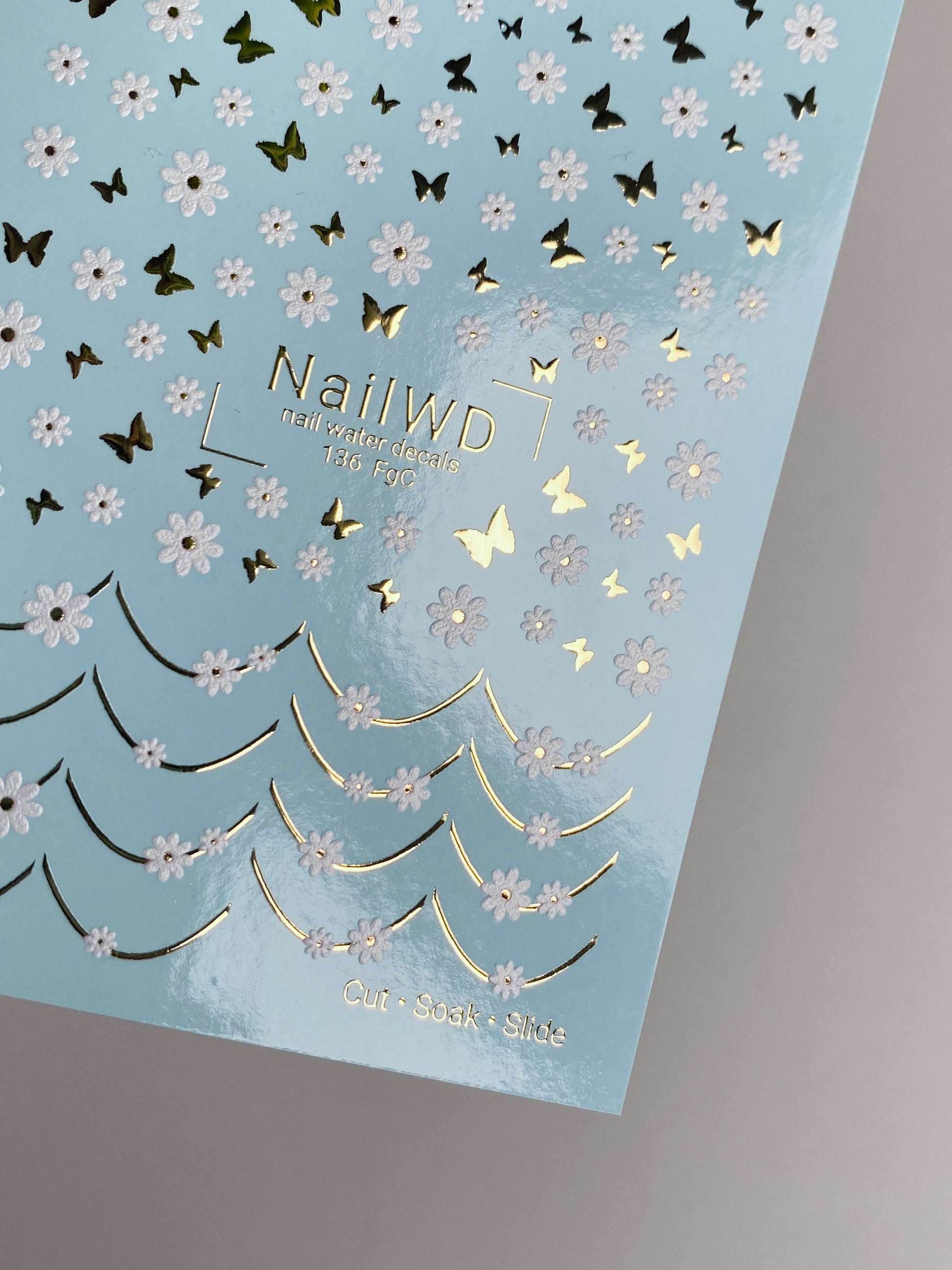 Charming water slide nail decals with tiny white daisies and golden butterflies, combined with French curves for a delicate manicure. These nail water decals are water-activated — soak to apply, and each design slides off with water for effortless transfer.
