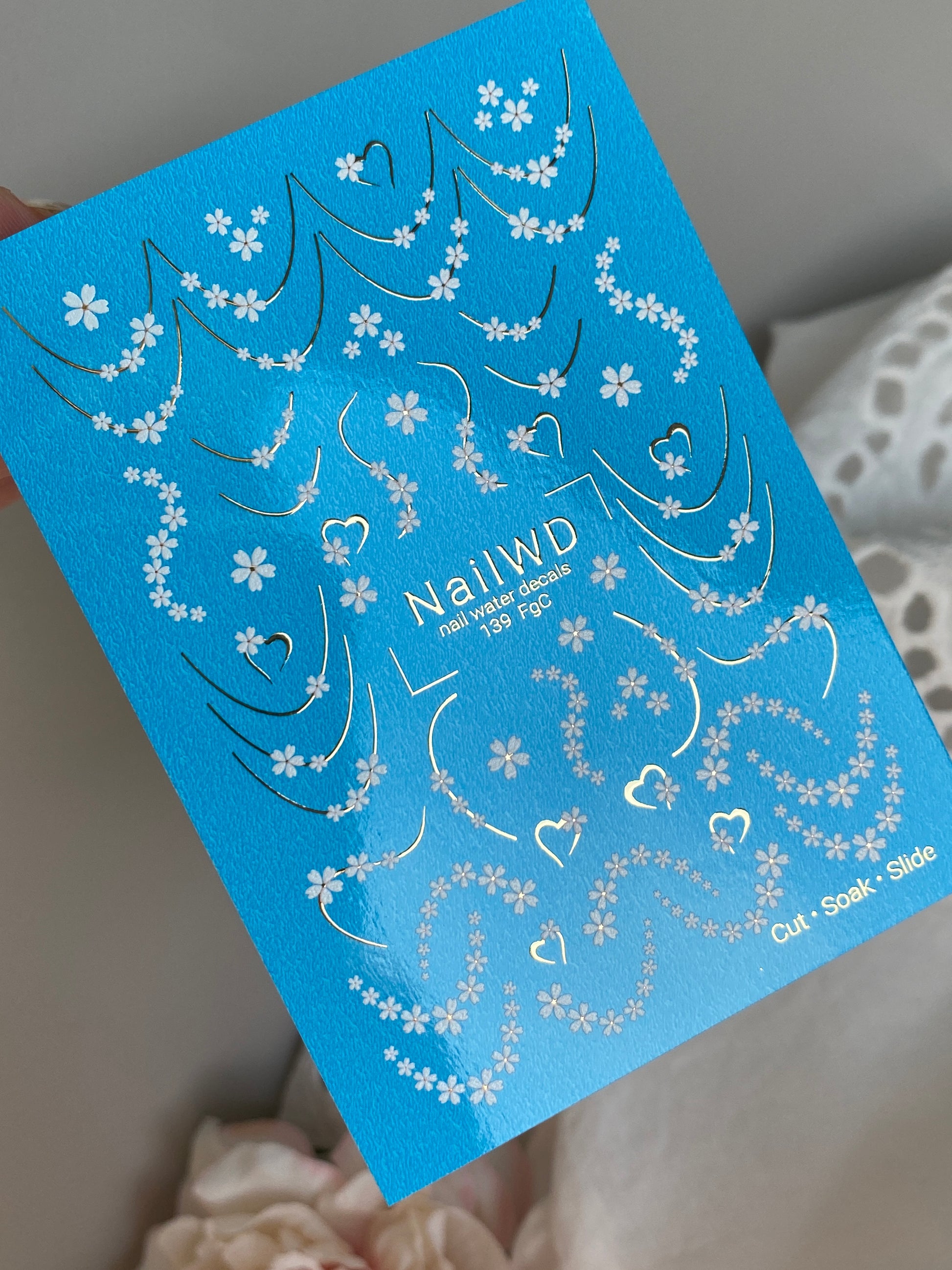 Delicate white floral water slide nail decals with French curves and daisy chain motifs for a soft, romantic manicure. These nail water decals are water-activated — soak to apply, and each piece slides off with water for a smooth transfer.