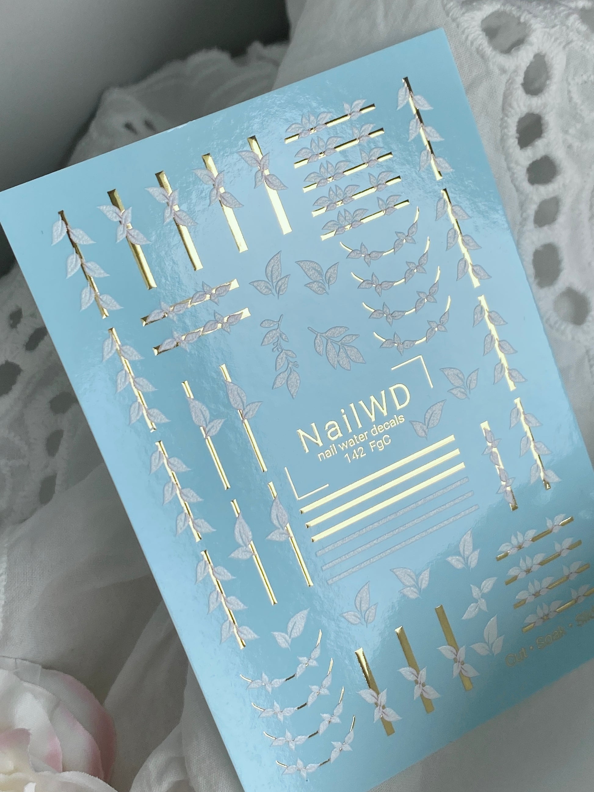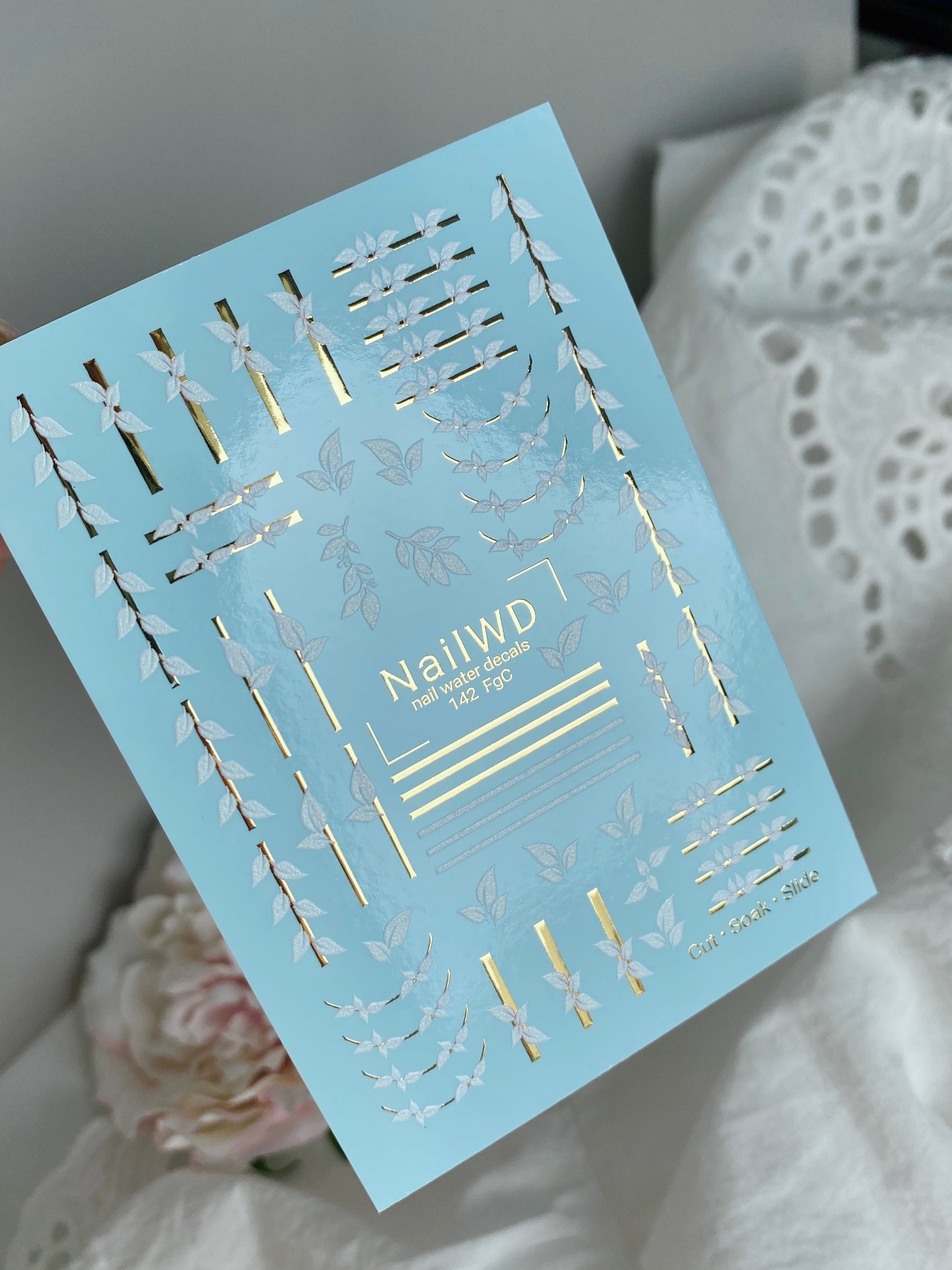 Nail Water Decal 142 NailWD | Water Slide Nail Decals White Leaves | Minimalist Botanical with Gold Stripes