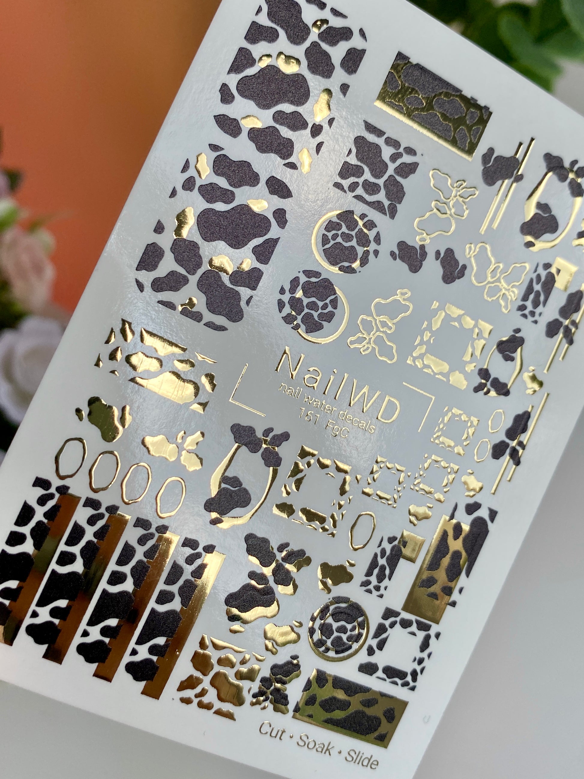 Trendy water slide nail decals with bold cow print and shiny golden accents for a fashionable animal print manicure. These nail water decals are water-activated — soak to apply, and each chosen design must be cut out before placing in water.