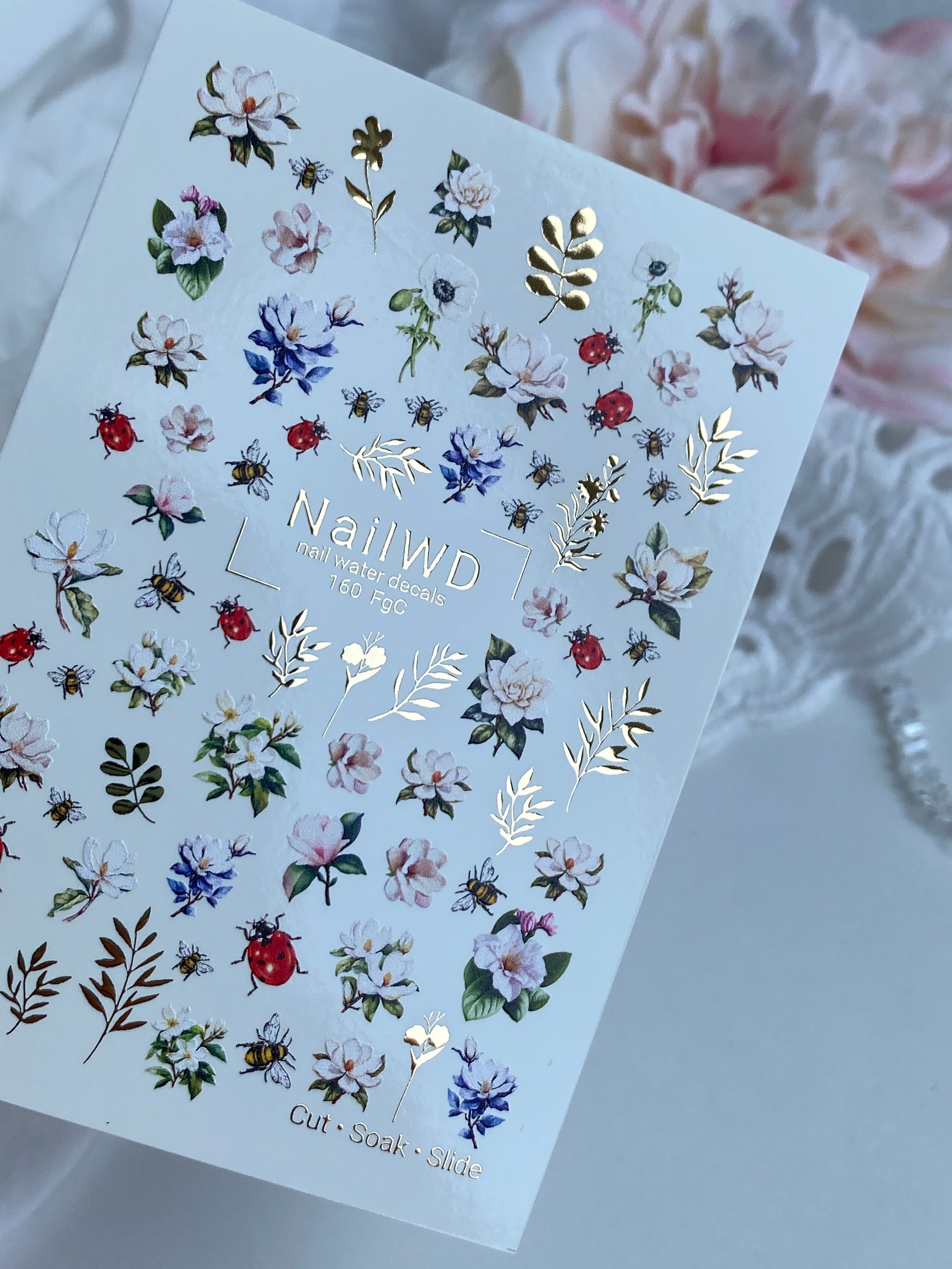 Nail Water Decal 160 Nail WD | Water Slide Nail Decals Floral Garden with Bees and Ladybugs | Nail Water Decals Spring Flowers Design