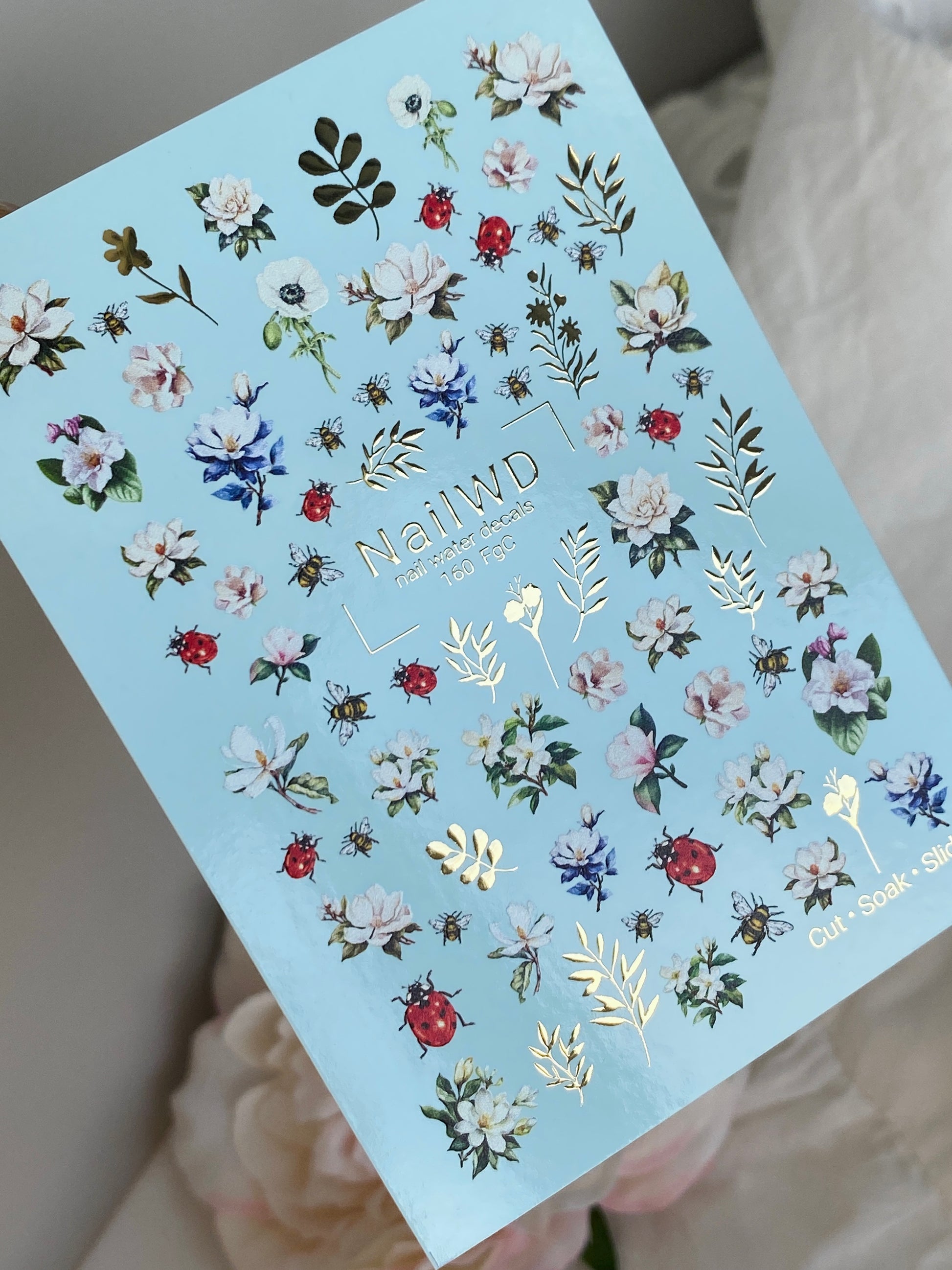Charming water slide nail decals featuring delicate spring flowers, buzzing bees, ladybugs, and golden leaves. These nail water decals (also known as water transfer nail decals or nail tattoos) are applied with water — cut, soak, and slide onto your nails.
