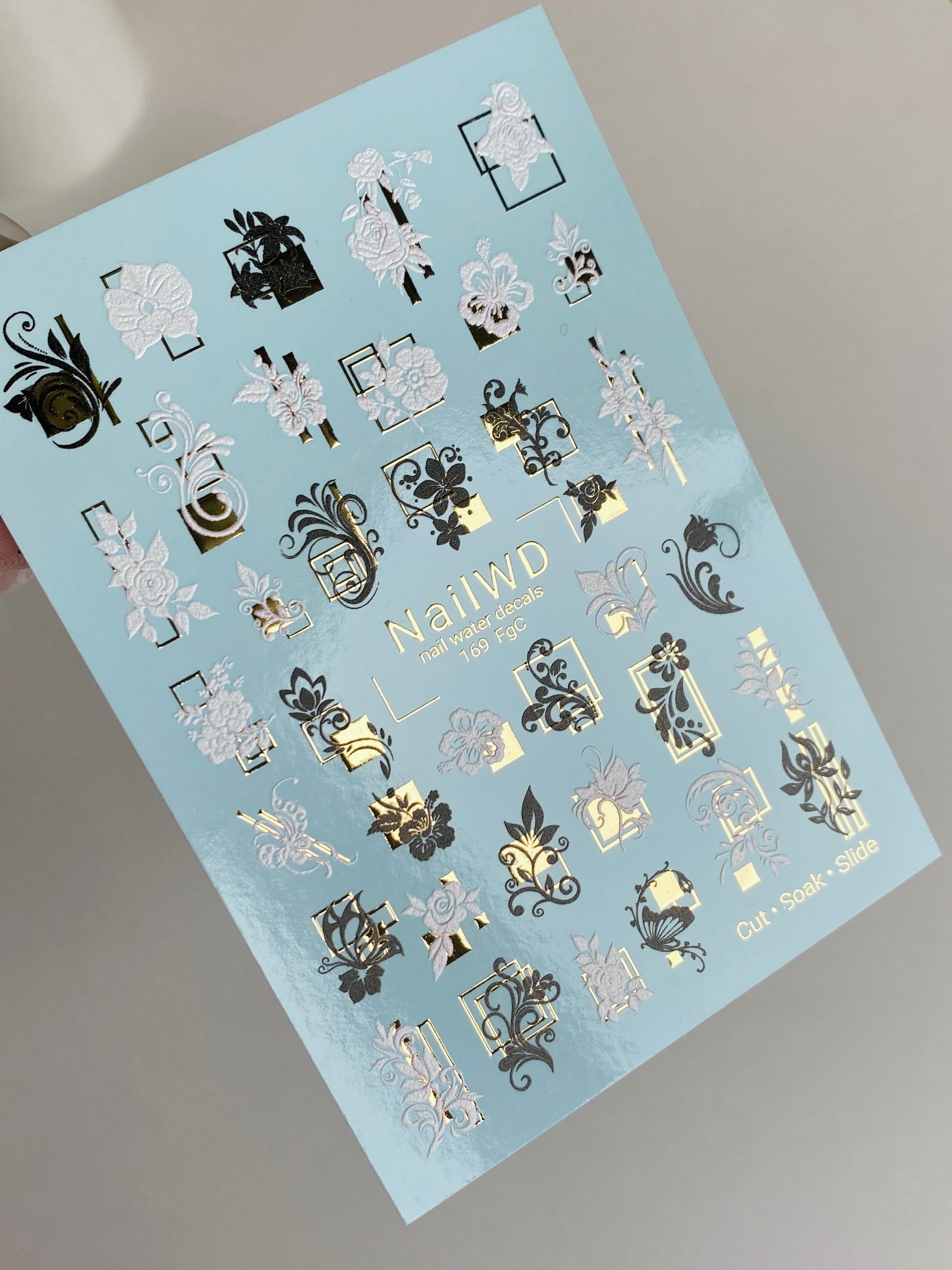 Nail Water Decal 169 Nail WD | Water Slide Nail Decals Baroque Flowers & Frames | Nail Water Decals Black White Gold Design