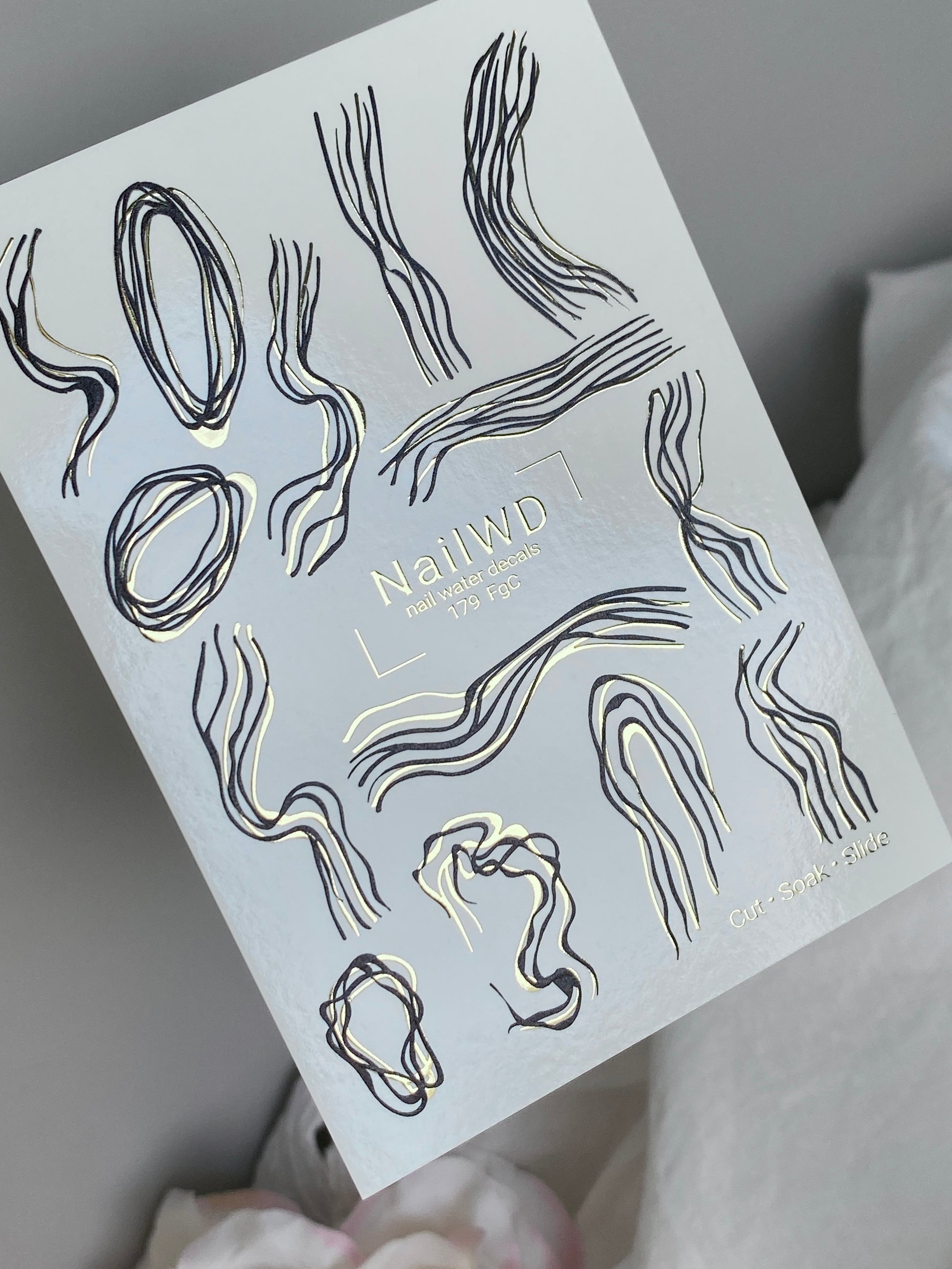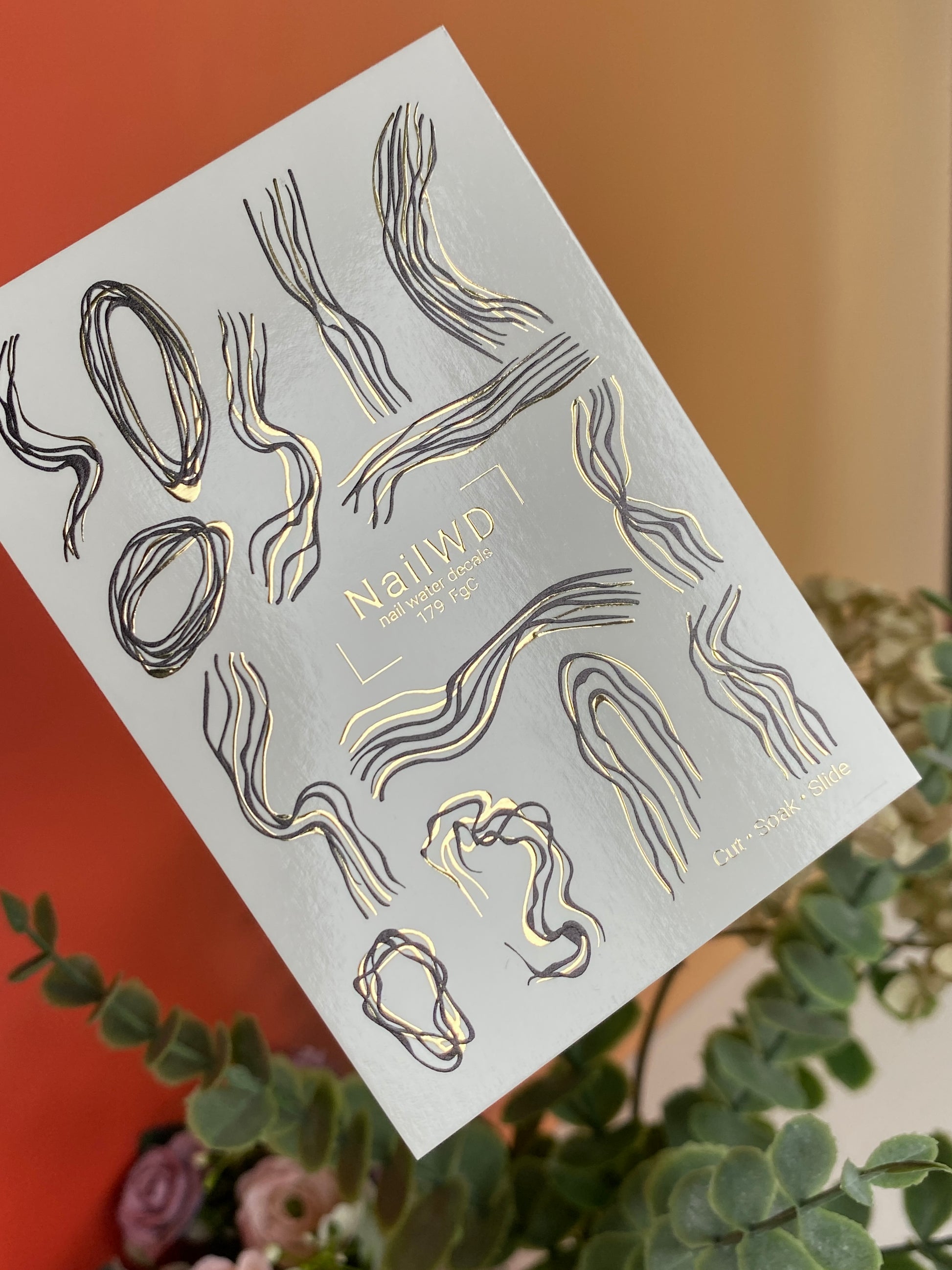 These water slide nail decals feature abstract black linework highlighted with touches of gold, creating a minimalist yet striking modern art effect. Perfect for sleek nail designs that stand out with elegance and simplicity.