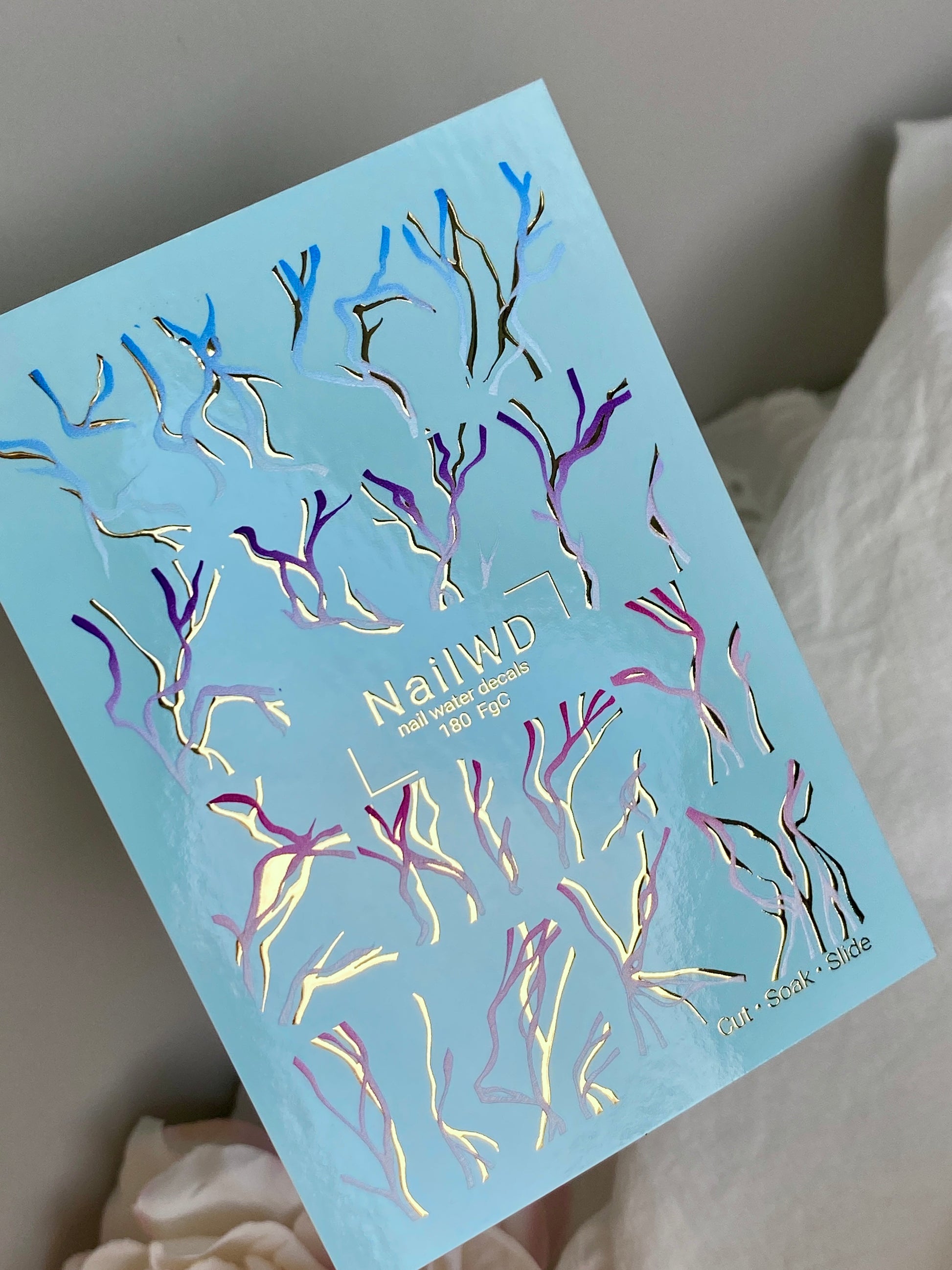 These water slide nail decals feature abstract branch-like lines in vibrant gradient tones of blue, pink, and purple with metallic accents. Their artistic and delicate look makes them perfect for creative, modern manicures that stand out.