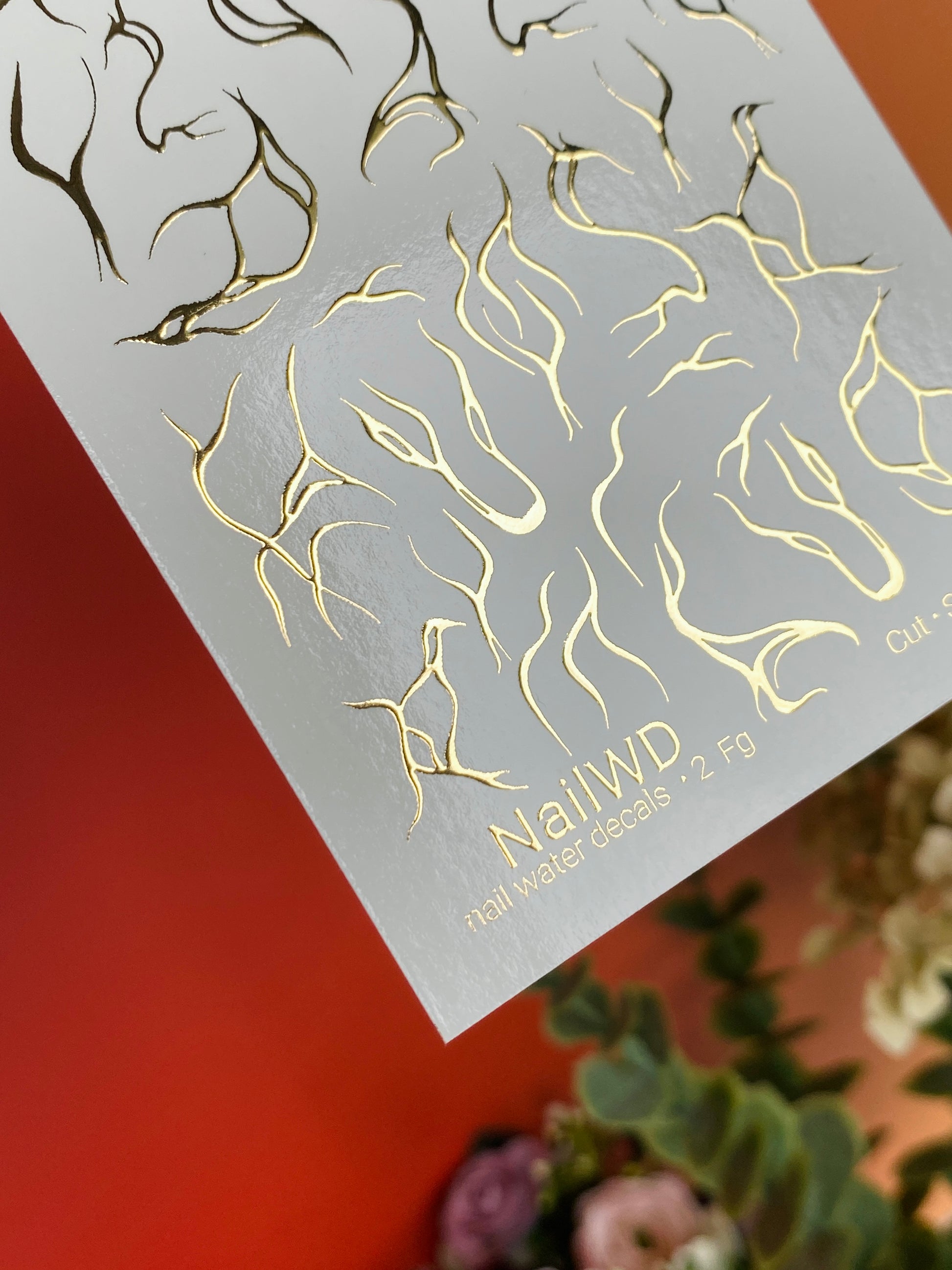 Bold Water Slide Nail Decals with abstract flame-inspired gold lines. These nail water decals are water-activated — soak to apply, and each design slides off smoothly for a flawless transfer onto the nail surface.