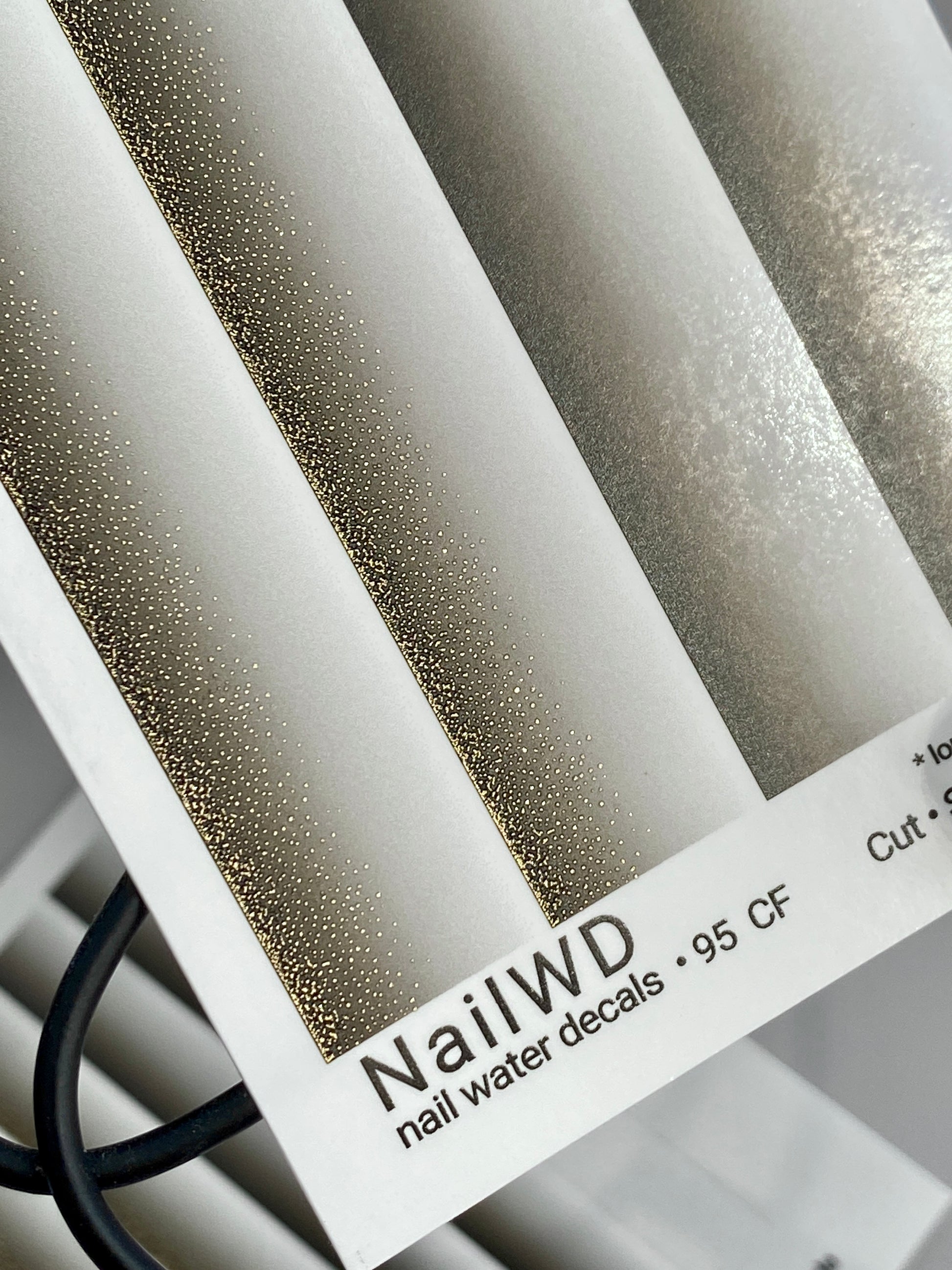 Luxury Water Slide Nail Decals with a white-to-black gradient decorated with golden shimmer. A glamorous design perfect for French fade or sophisticated ombre backgrounds.