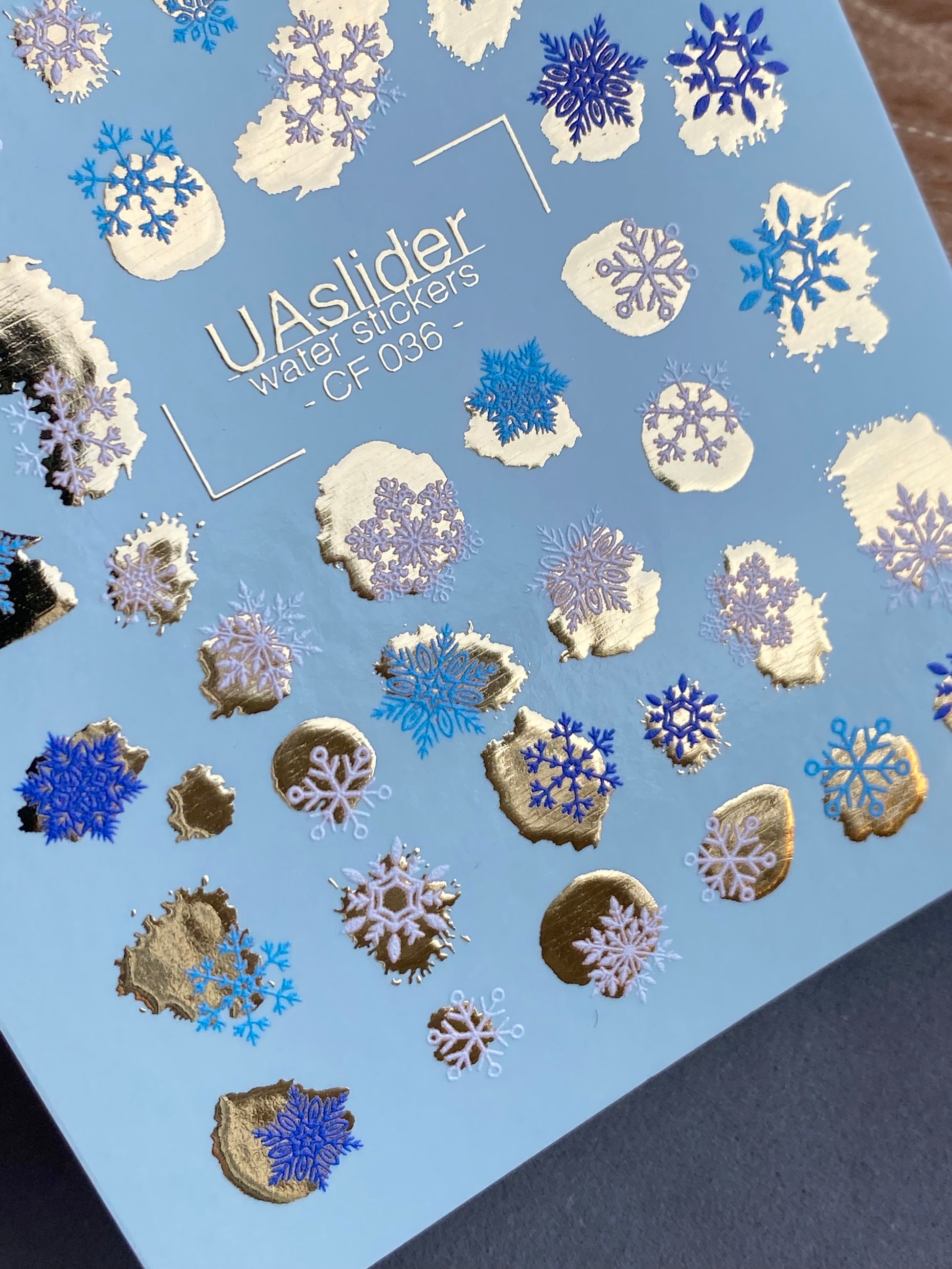 Winter snowflake water slide nail decals featuring delicate blue and white snowflakes with shimmering gold foil backgrounds. A festive design perfect for holiday and winter nail art.