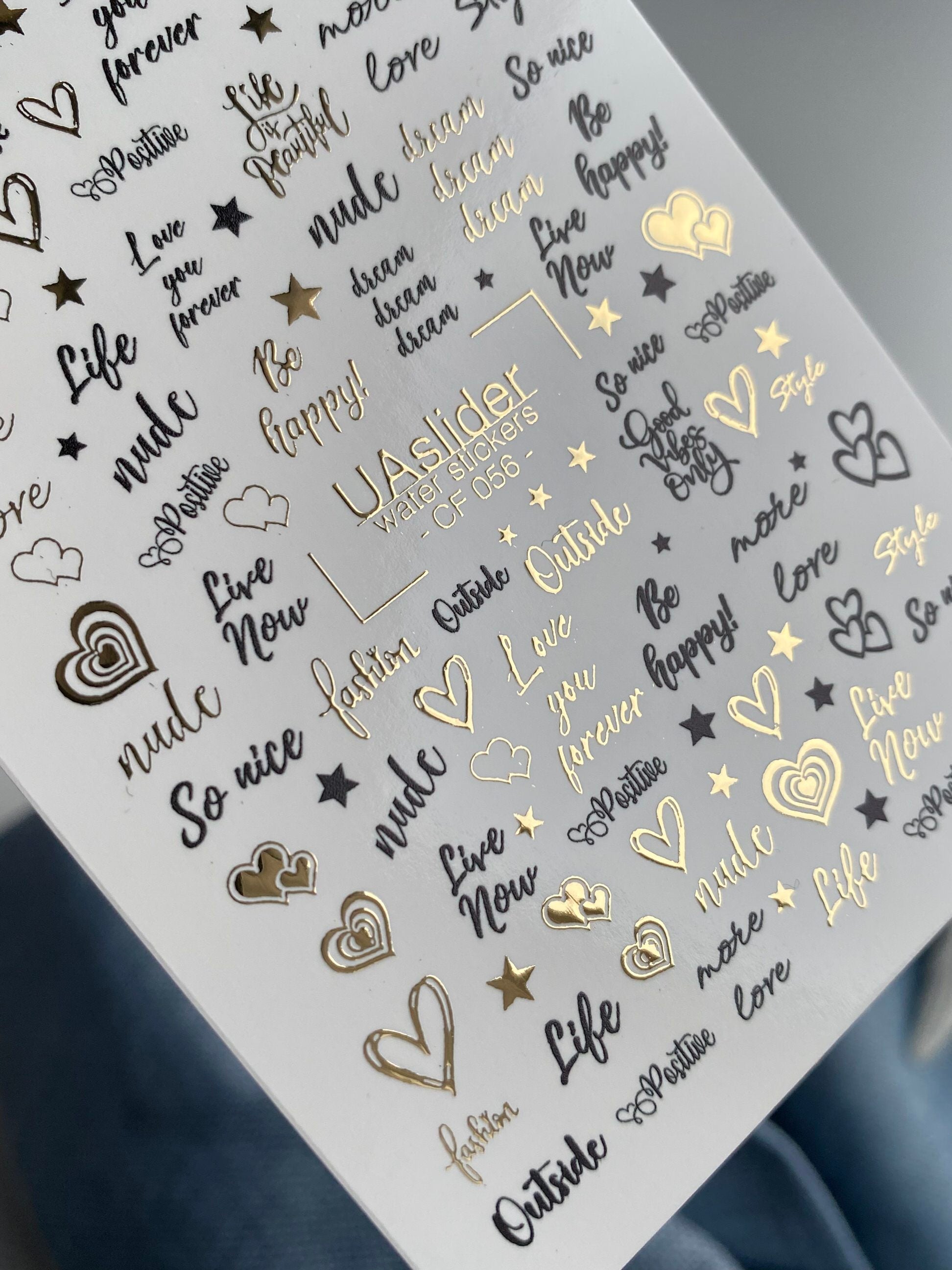 These water slide nail decals (also known as nail water decals or water transfer nail art) are water-activated — just soak to apply. Each element releases in water and transfers smoothly onto the nail.