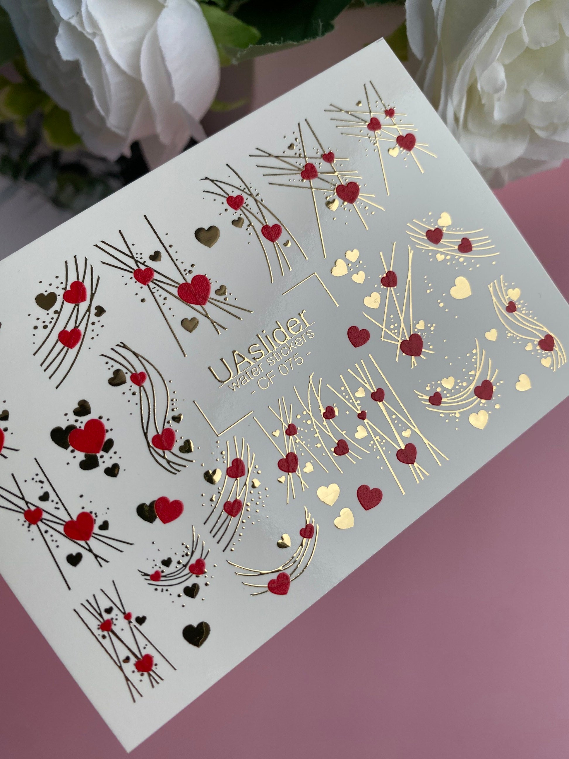 Nail Water Decal CF-075 | Valentine’s Day Nail Art Water Decals | Red and Gold Hearts with Elegant Lines