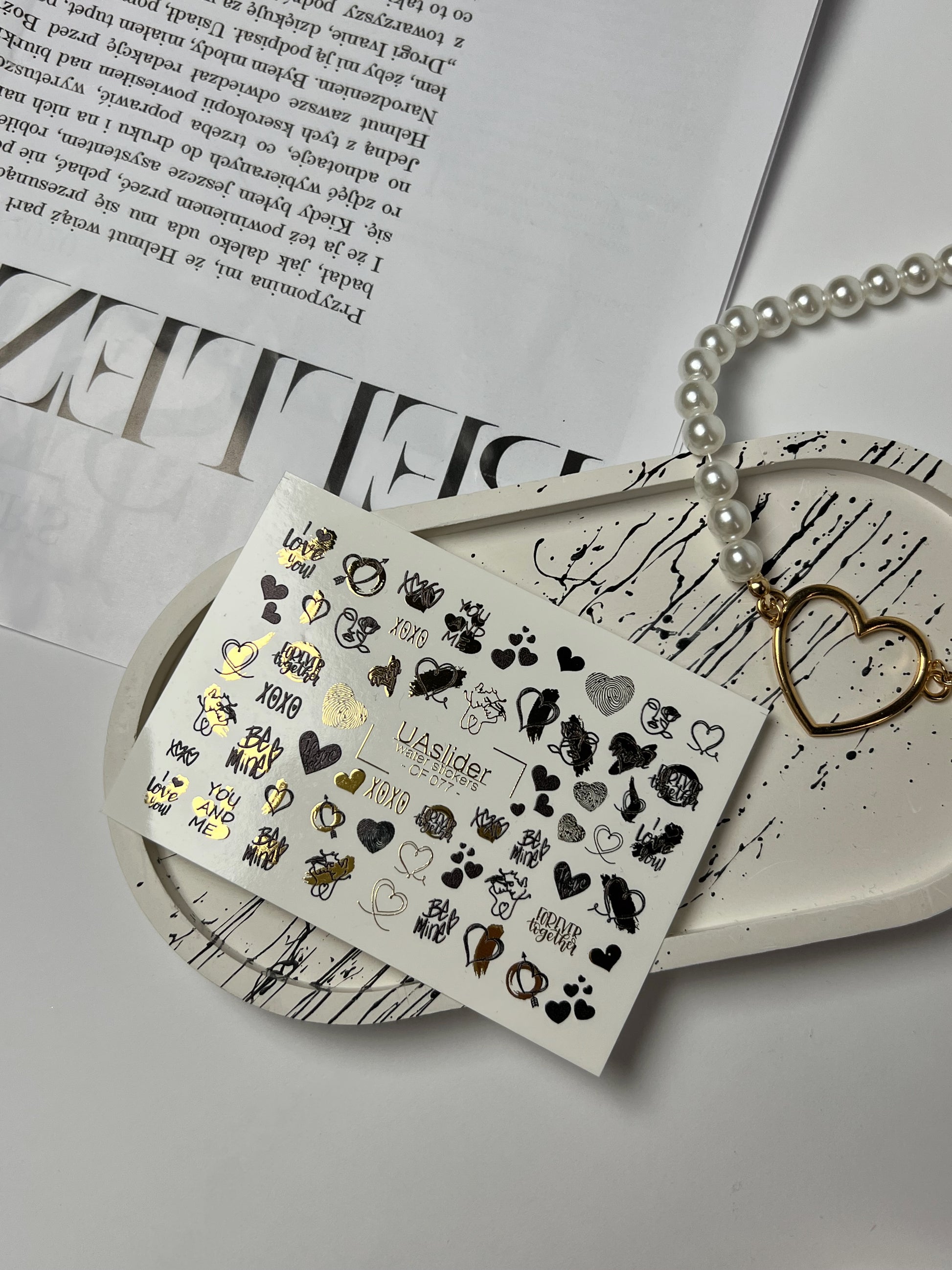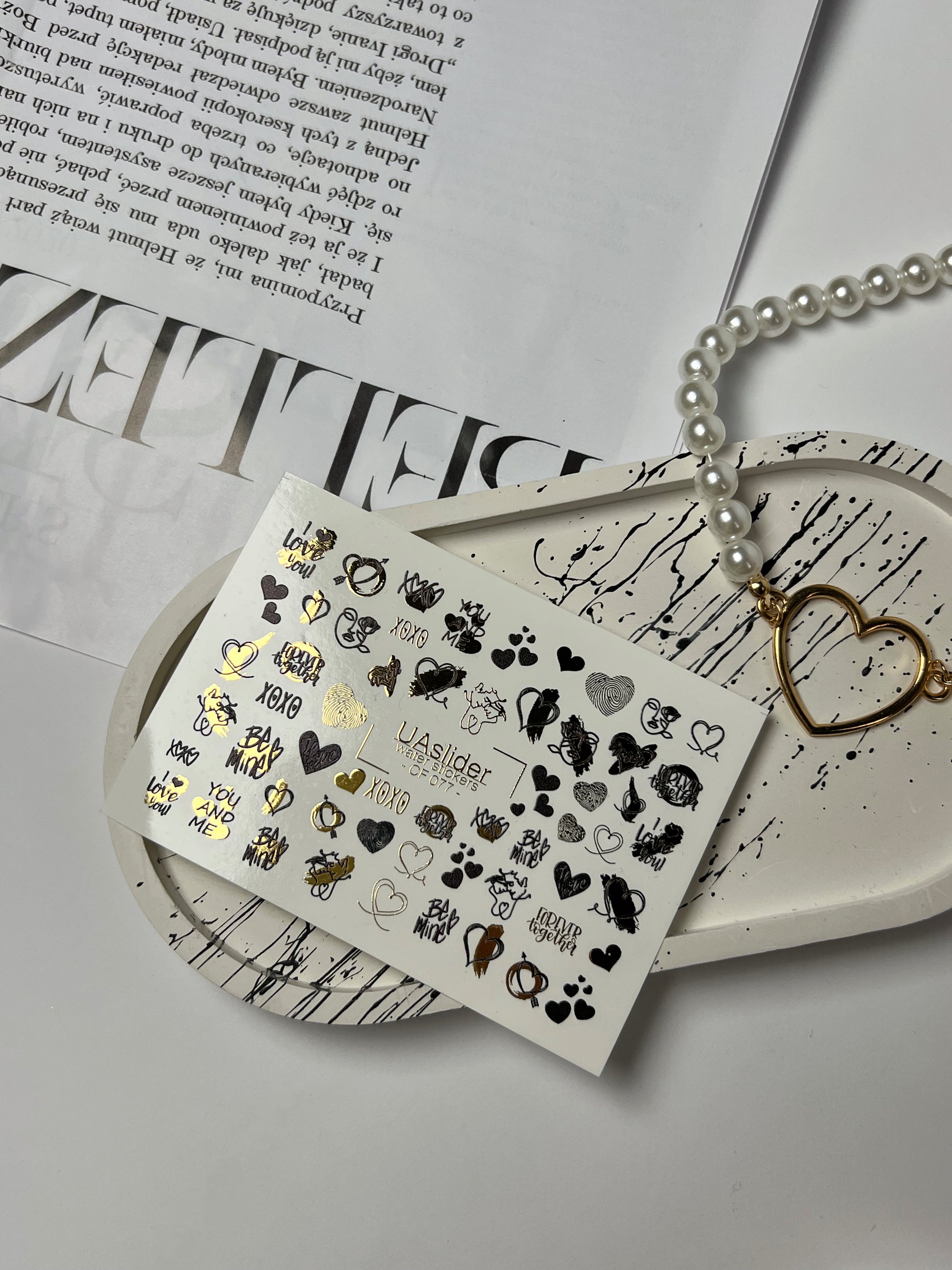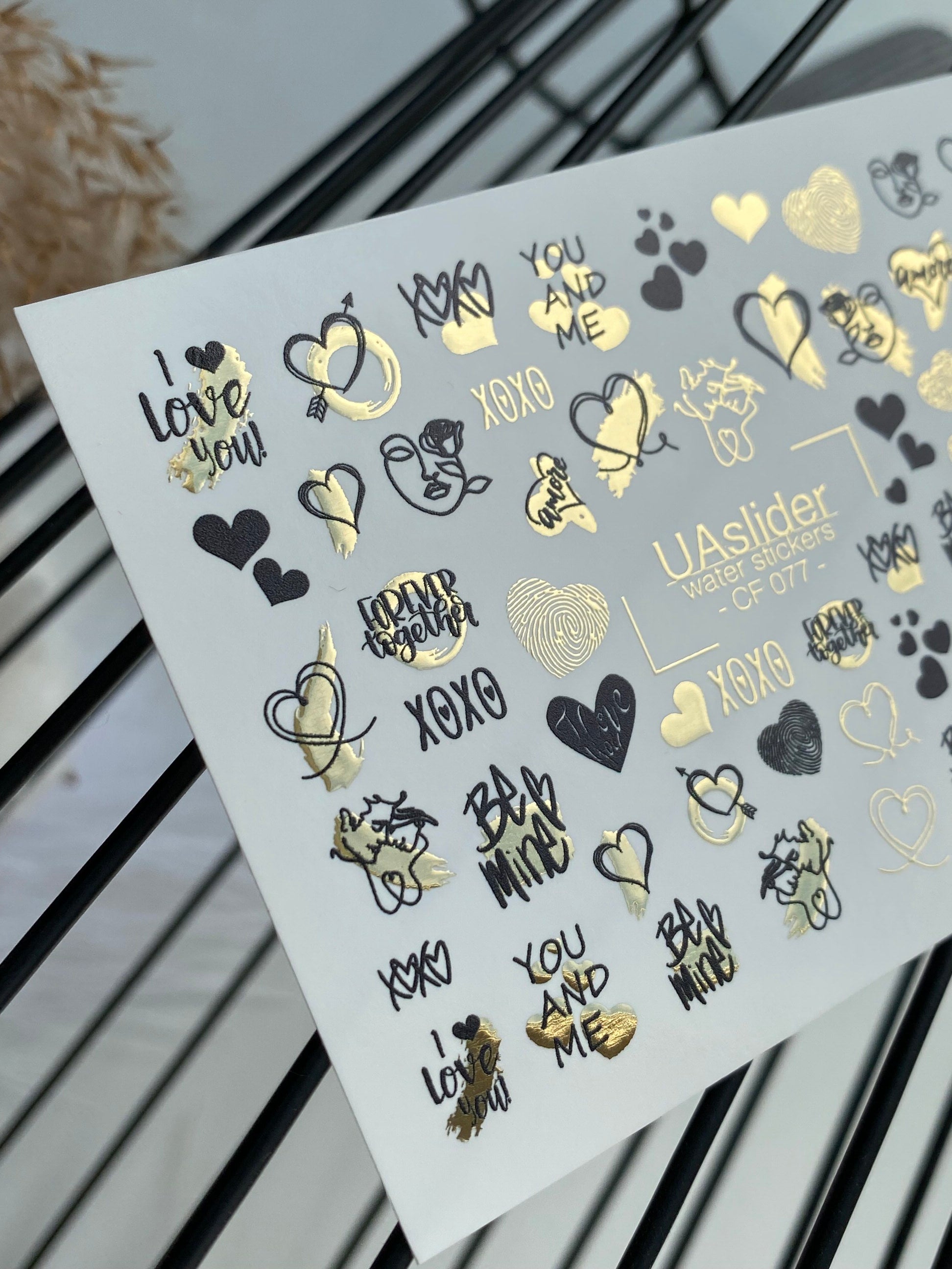 Romantic Valentine’s Day nail art water decals featuring abstract hearts, XOXO, faces, love notes, and fingerprint-style designs in black, gold, and brown accents. Perfect for trendy, love-inspired manicures, holiday nail art, or chic everyday looks.