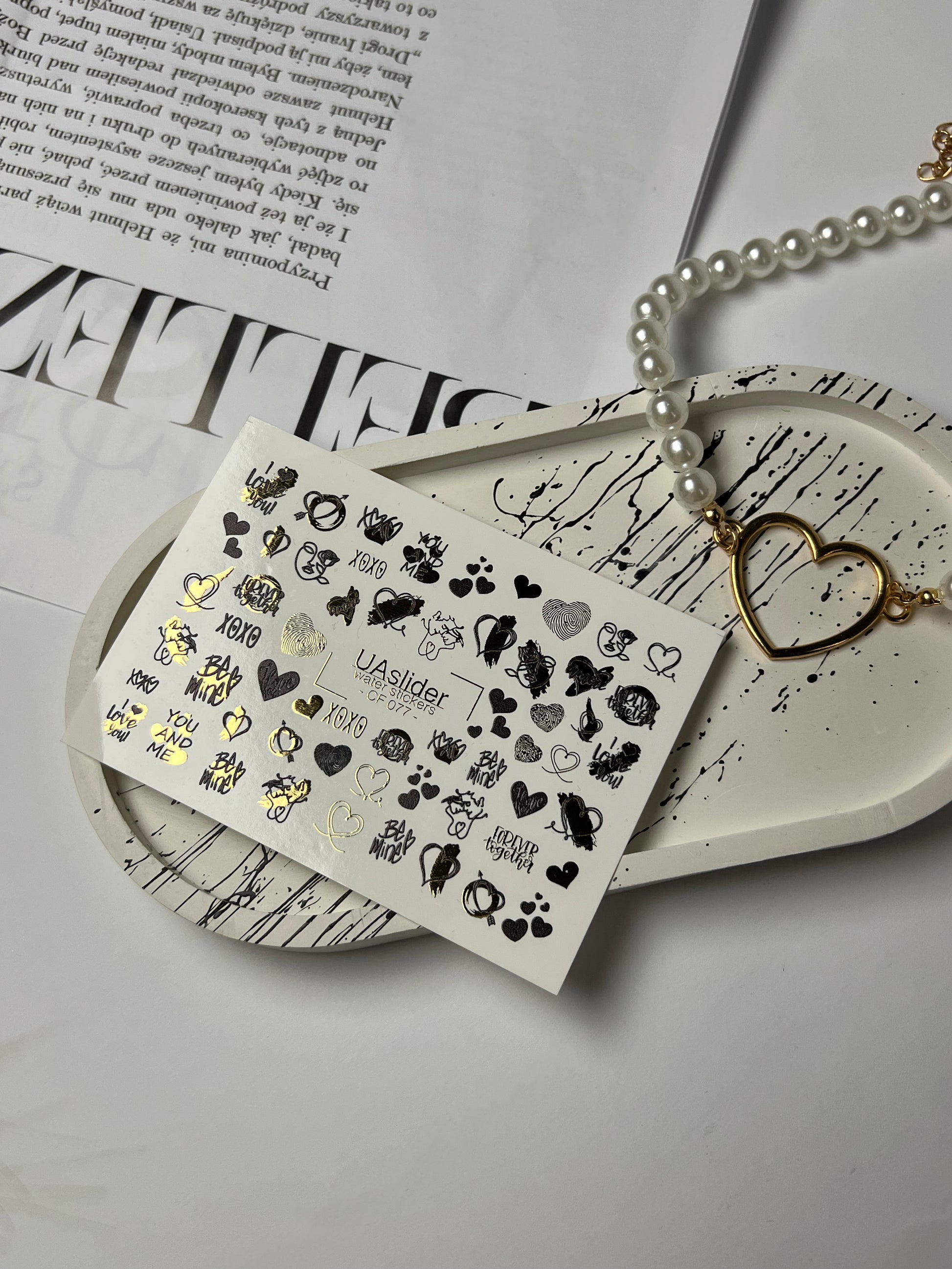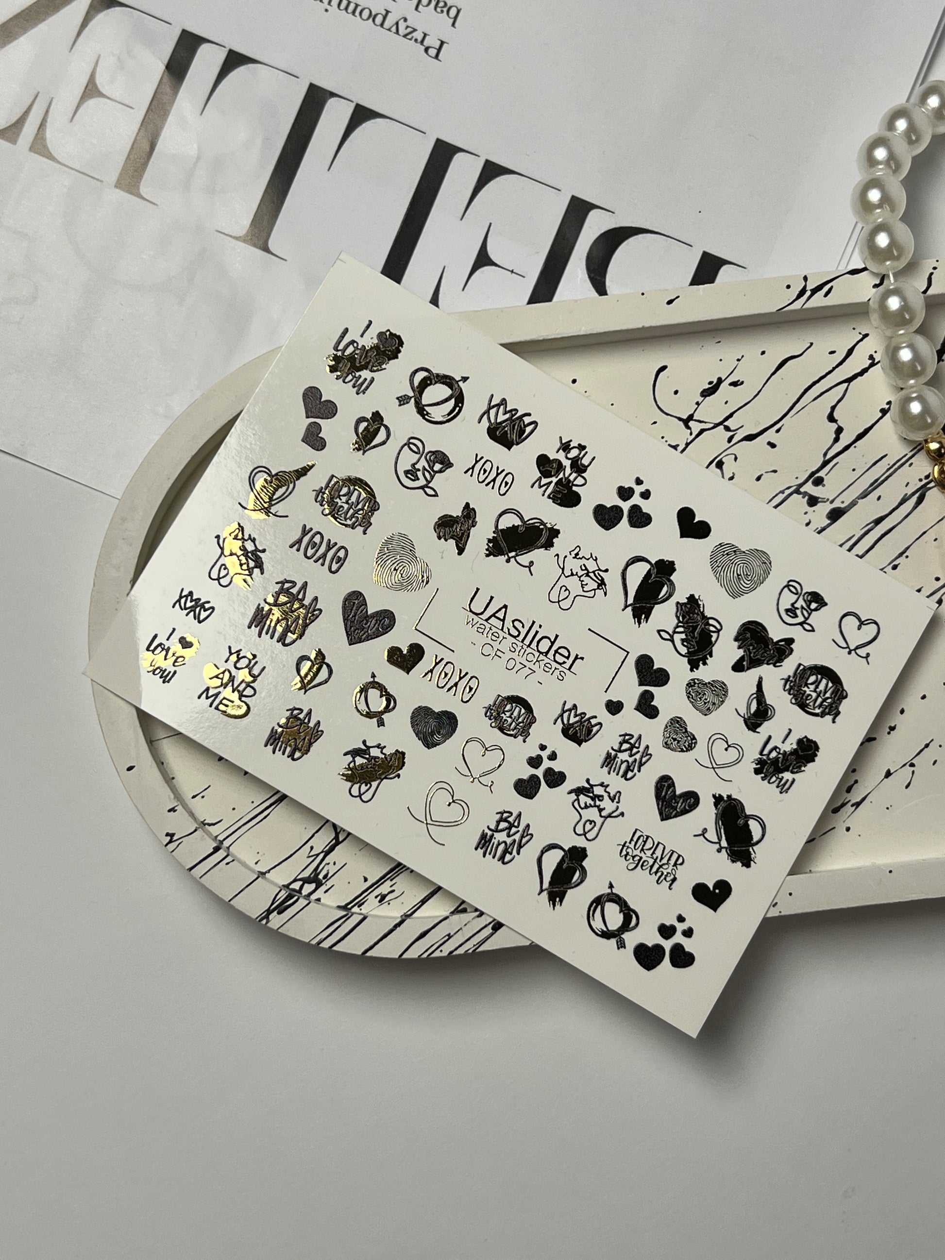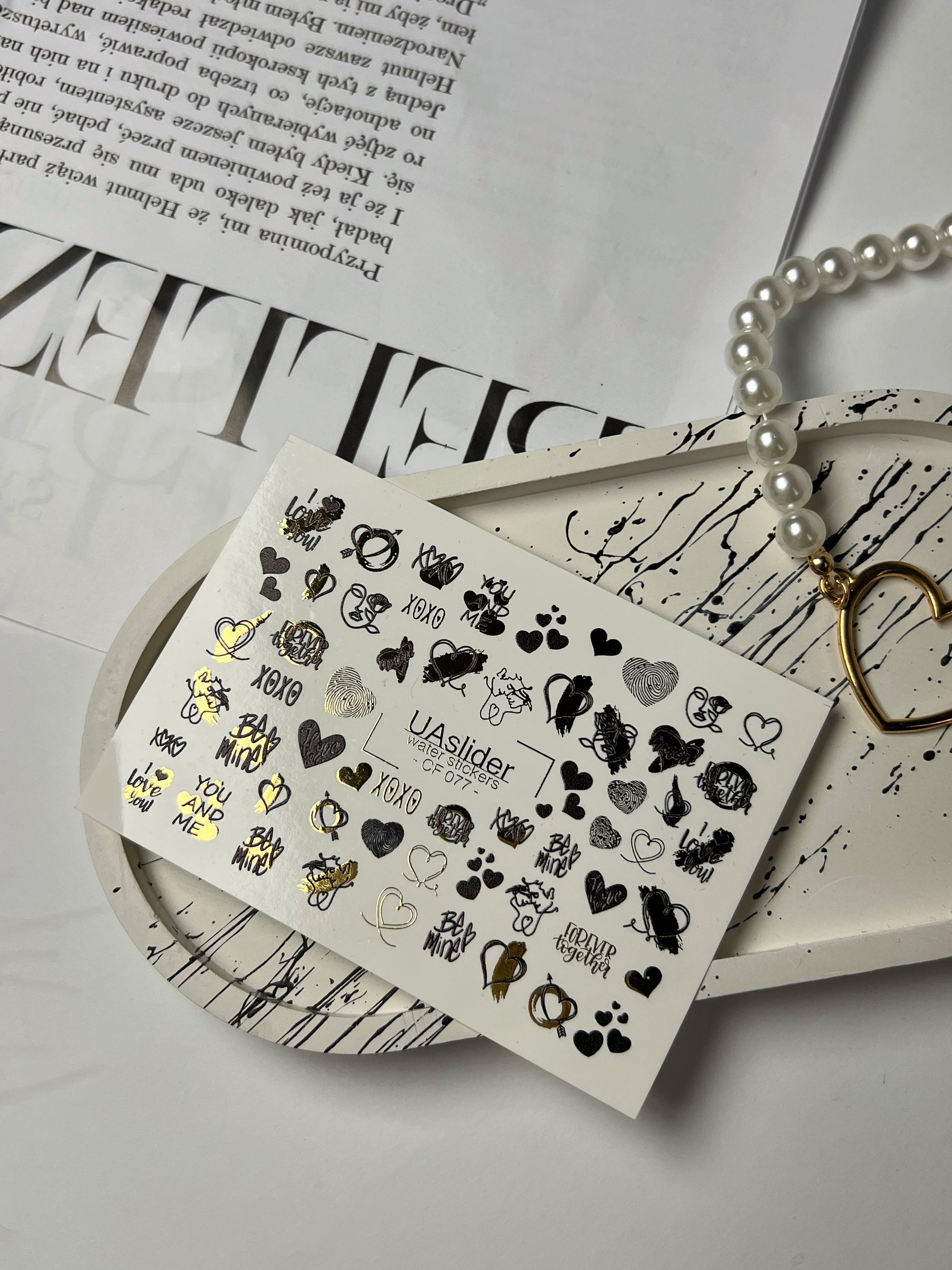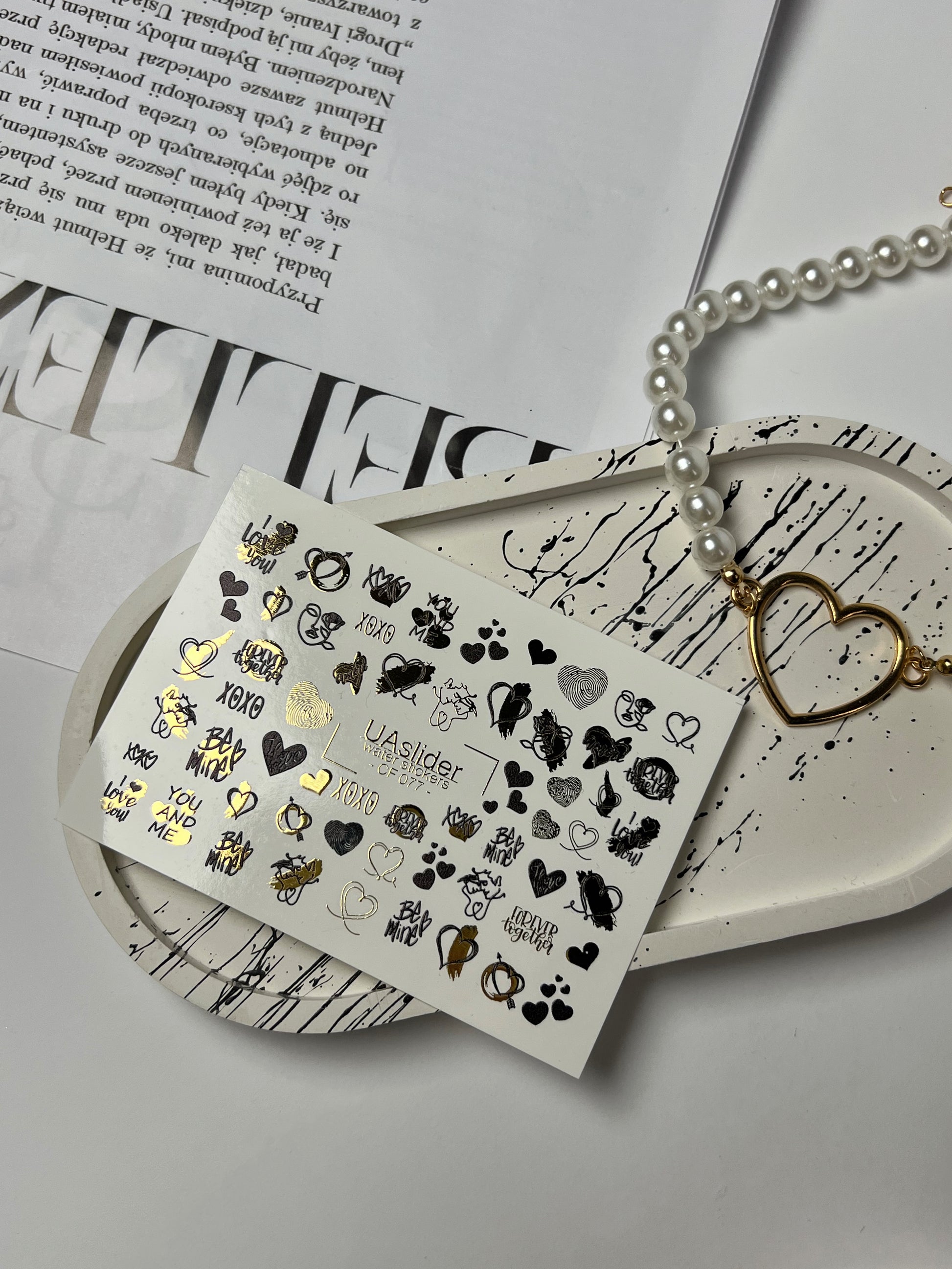 Romantic Valentine’s Day nail art water decals featuring abstract hearts, XOXO, faces, love notes, and fingerprint-style designs in black, gold, and brown accents. Perfect for trendy, love-inspired manicures, holiday nail art, or chic everyday looks.