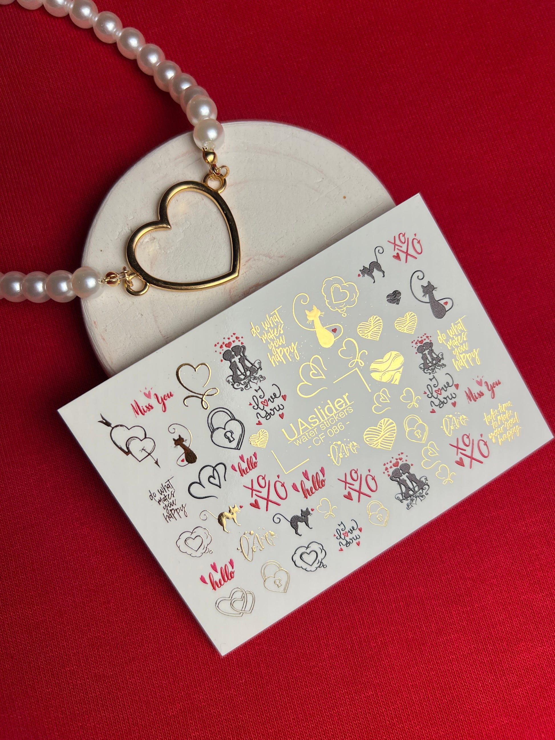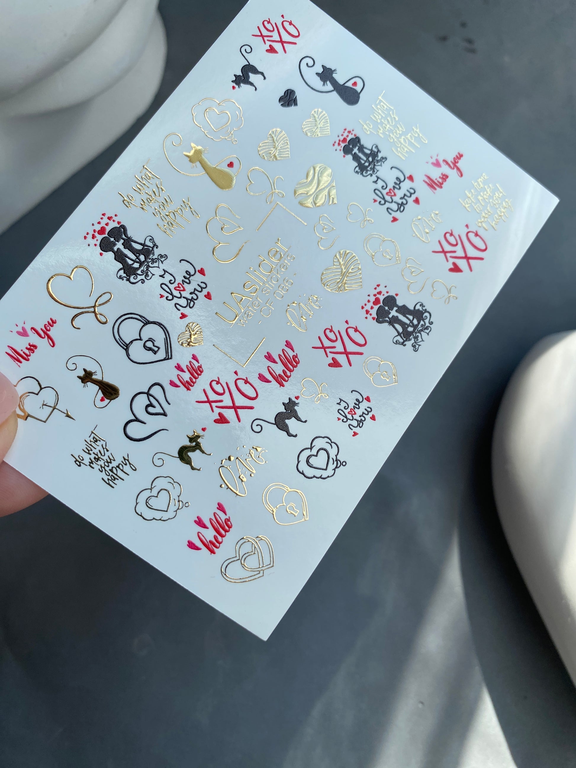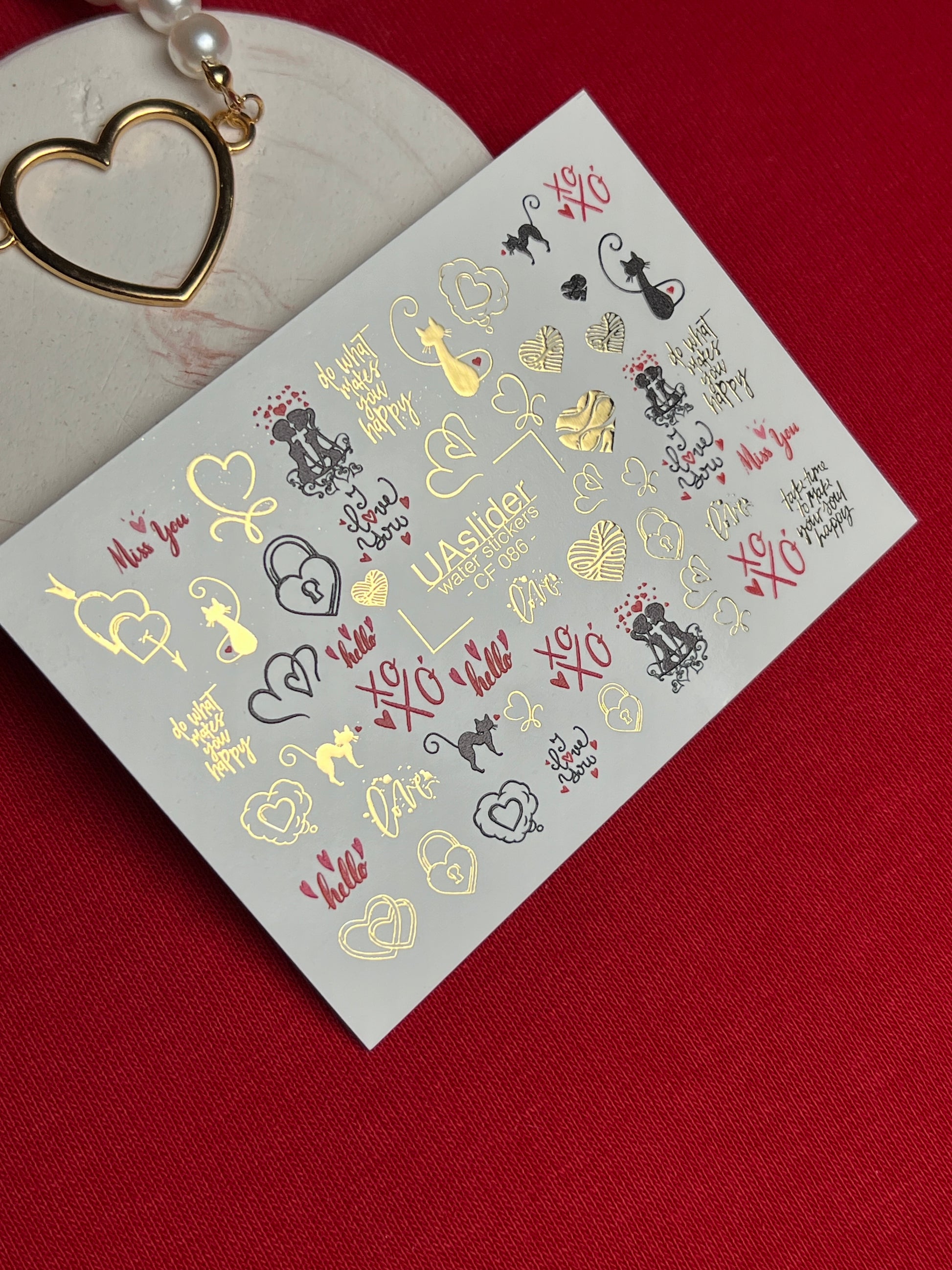 Charming water slide nail decals with romantic cats, hearts, padlocks, XO letters, and love-themed quotes in black, red, and gold foil. Cute and stylish for Valentine’s Day manicures, romantic nail art, or everyday wear.