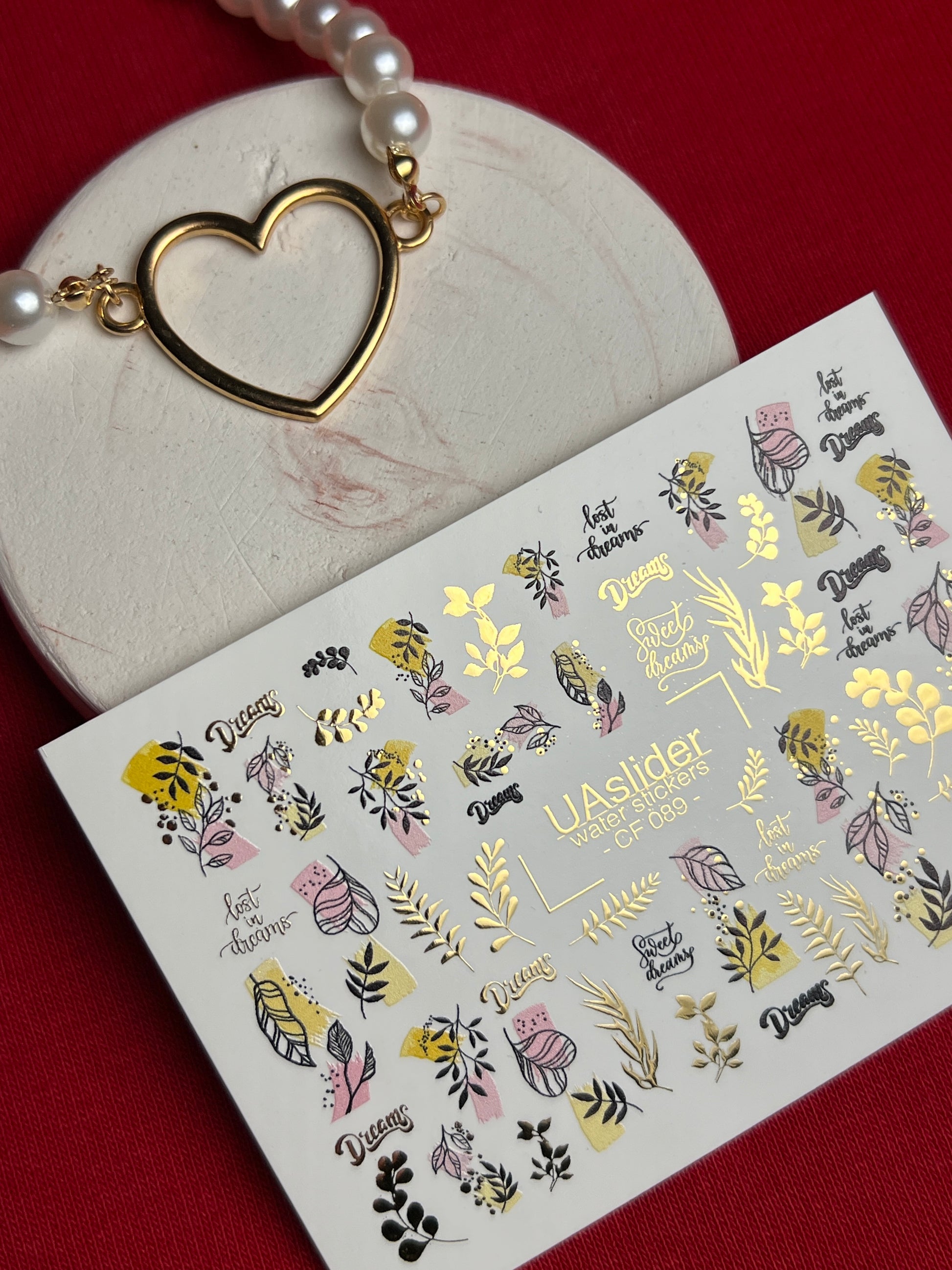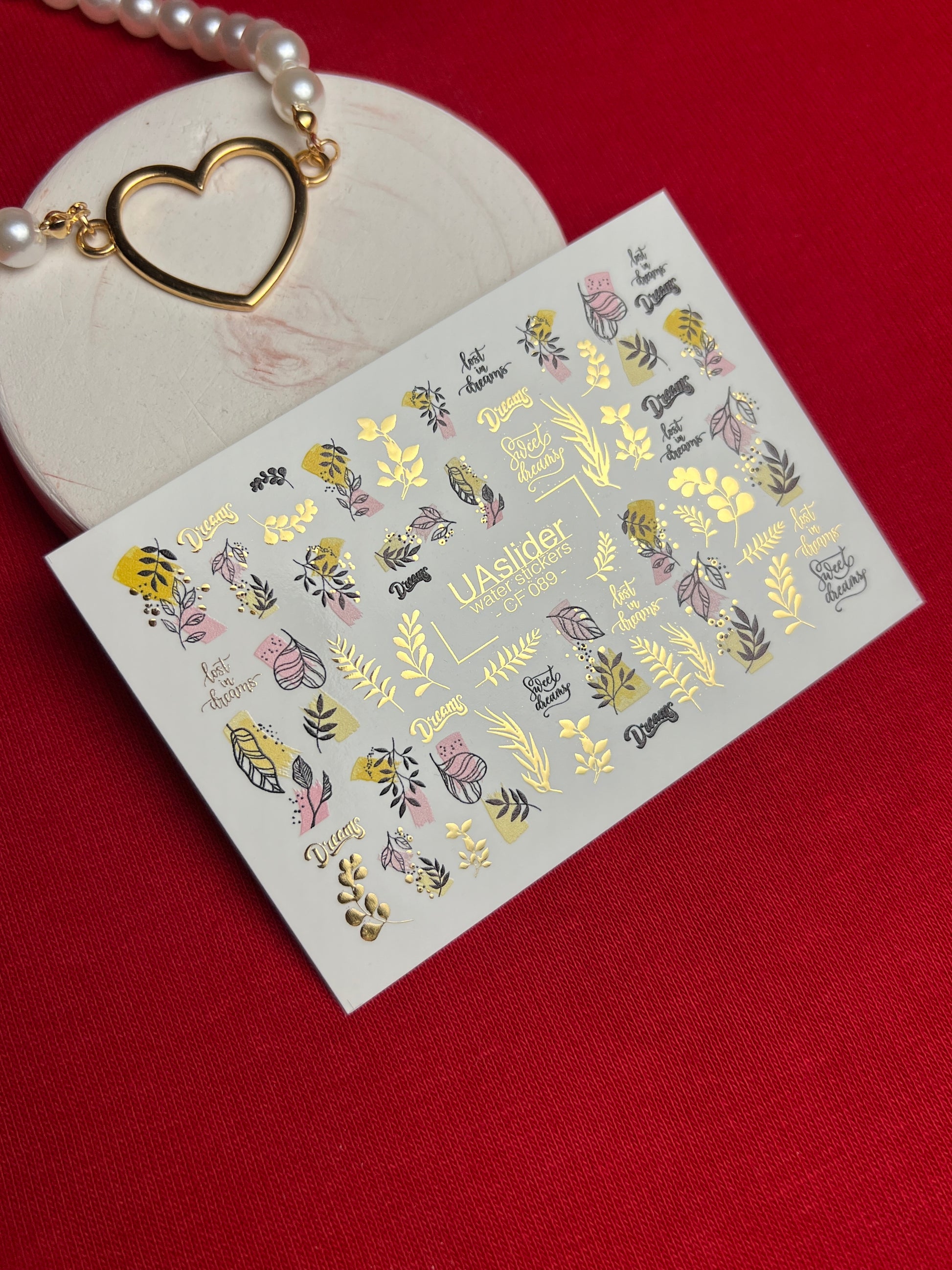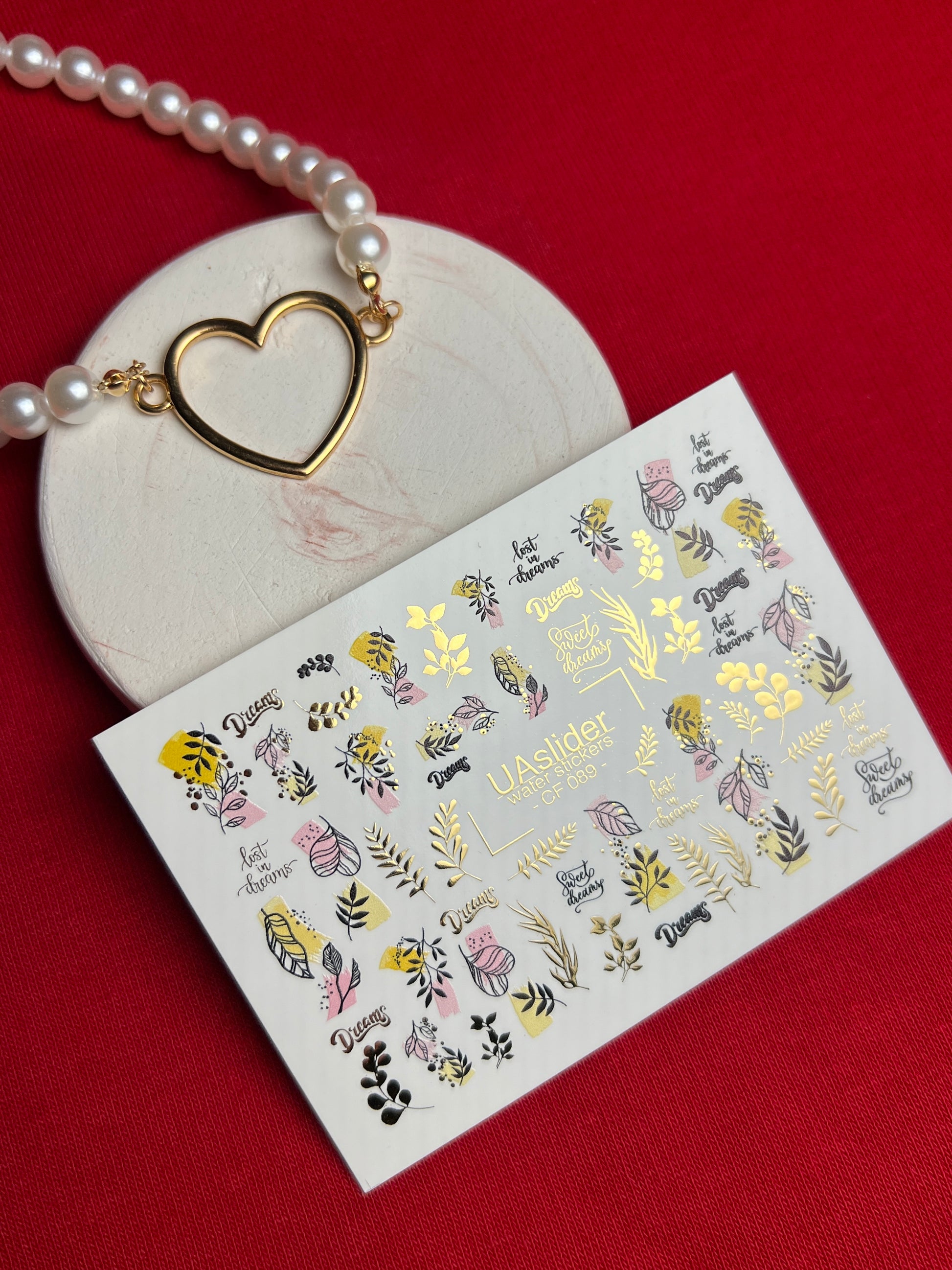 Nail Water Decal CF-089 | Dreamy Botanical Water Slide Nail Decals | Abstract Leaves & Gold Accents