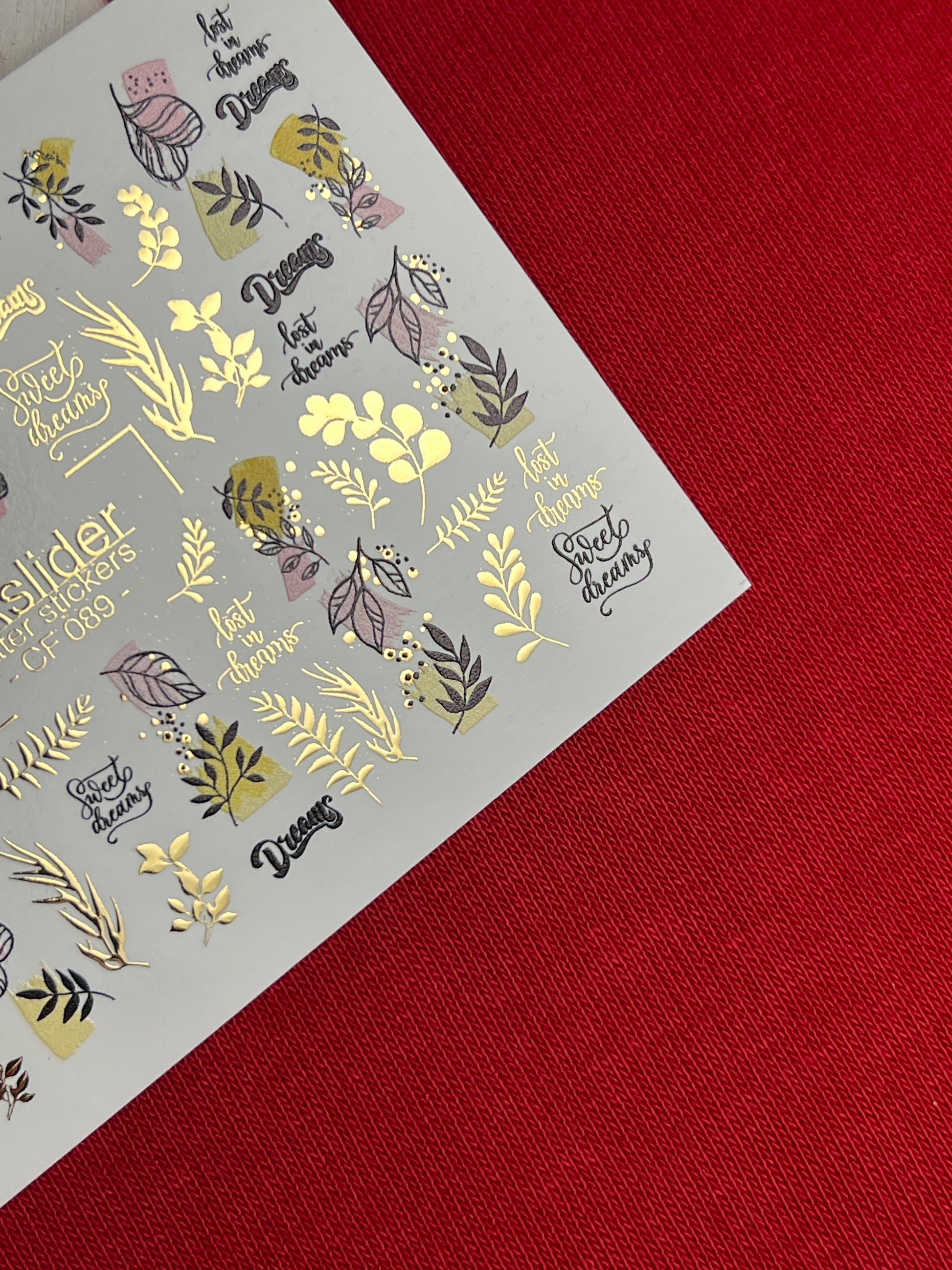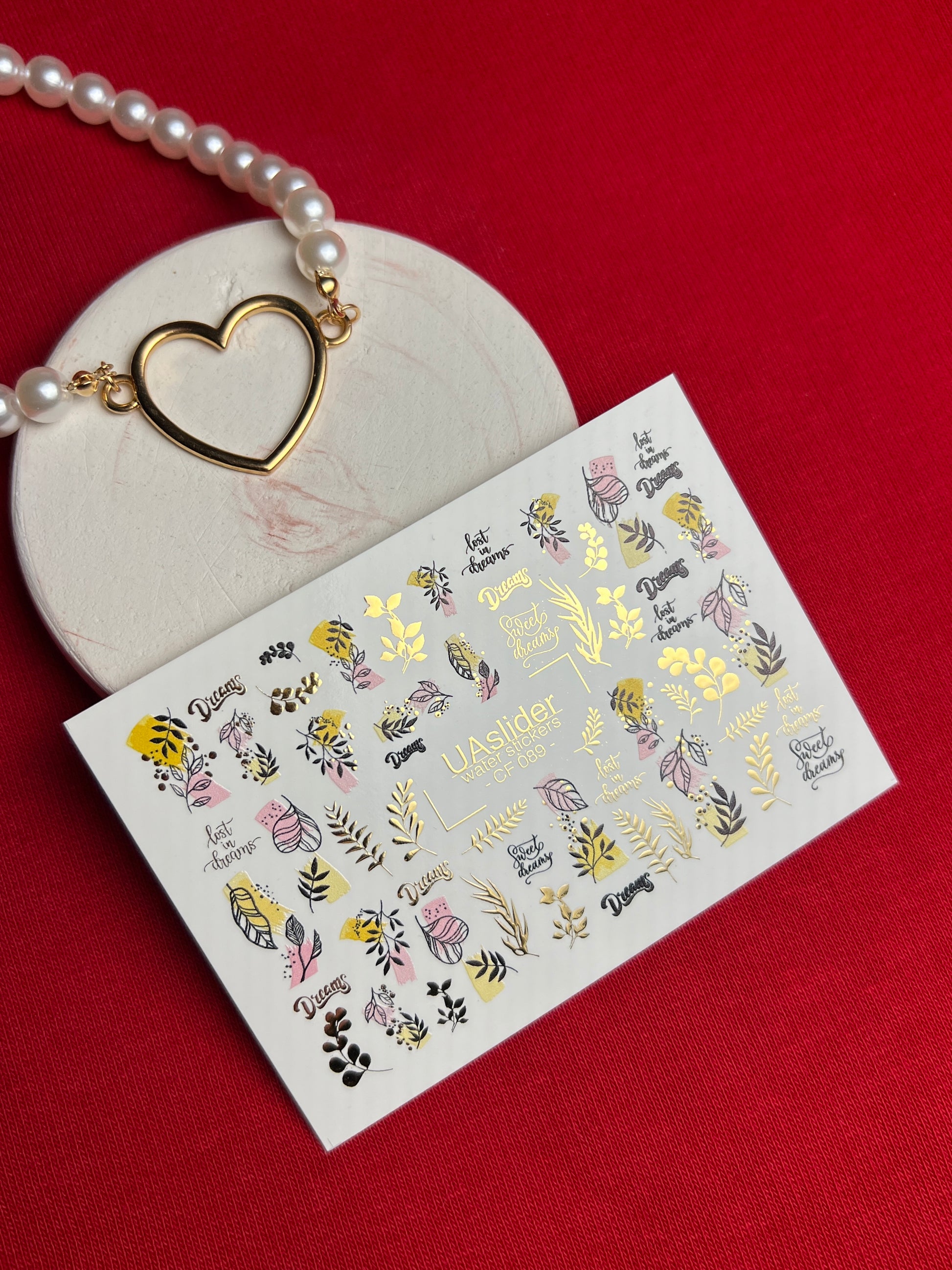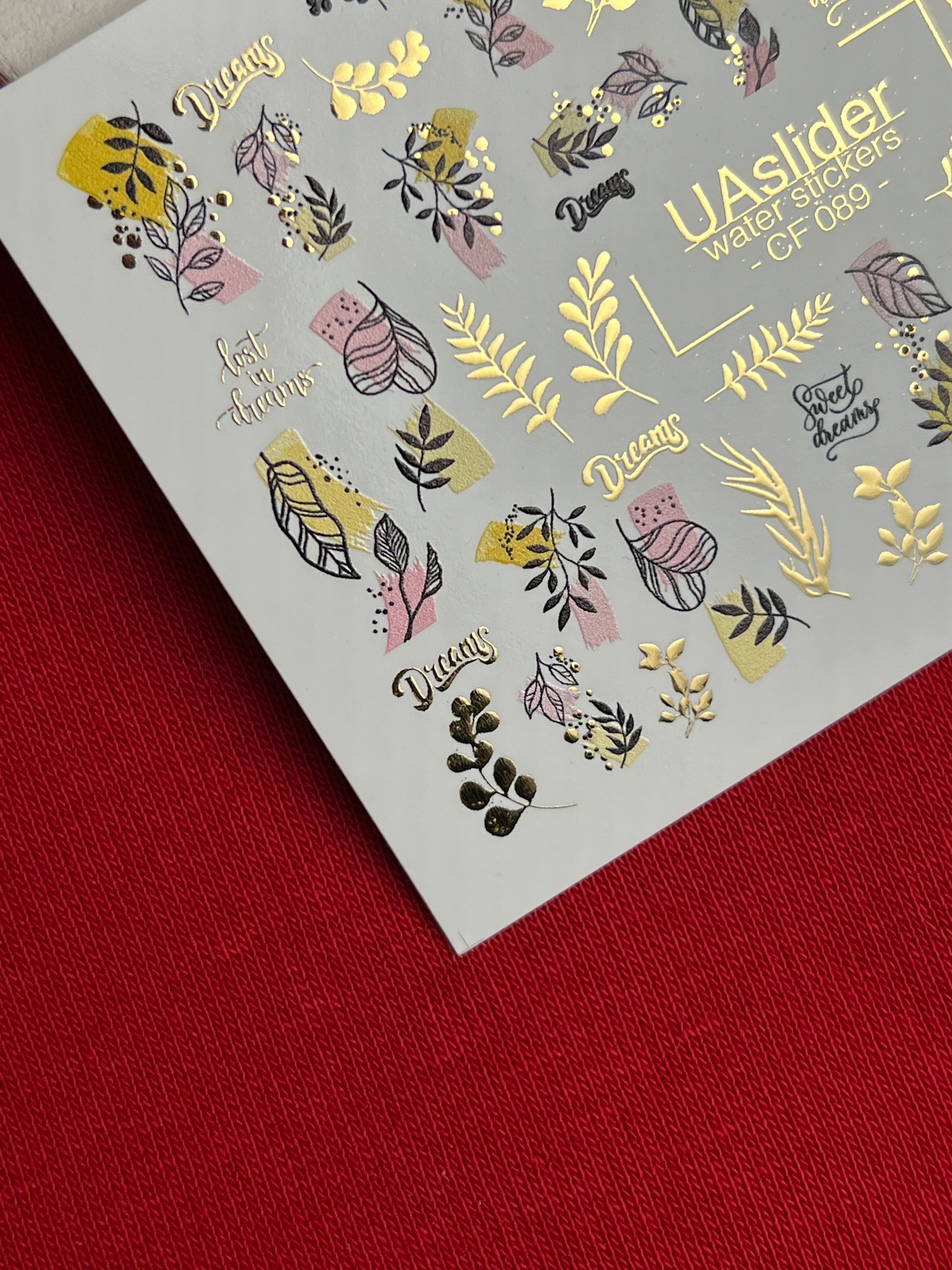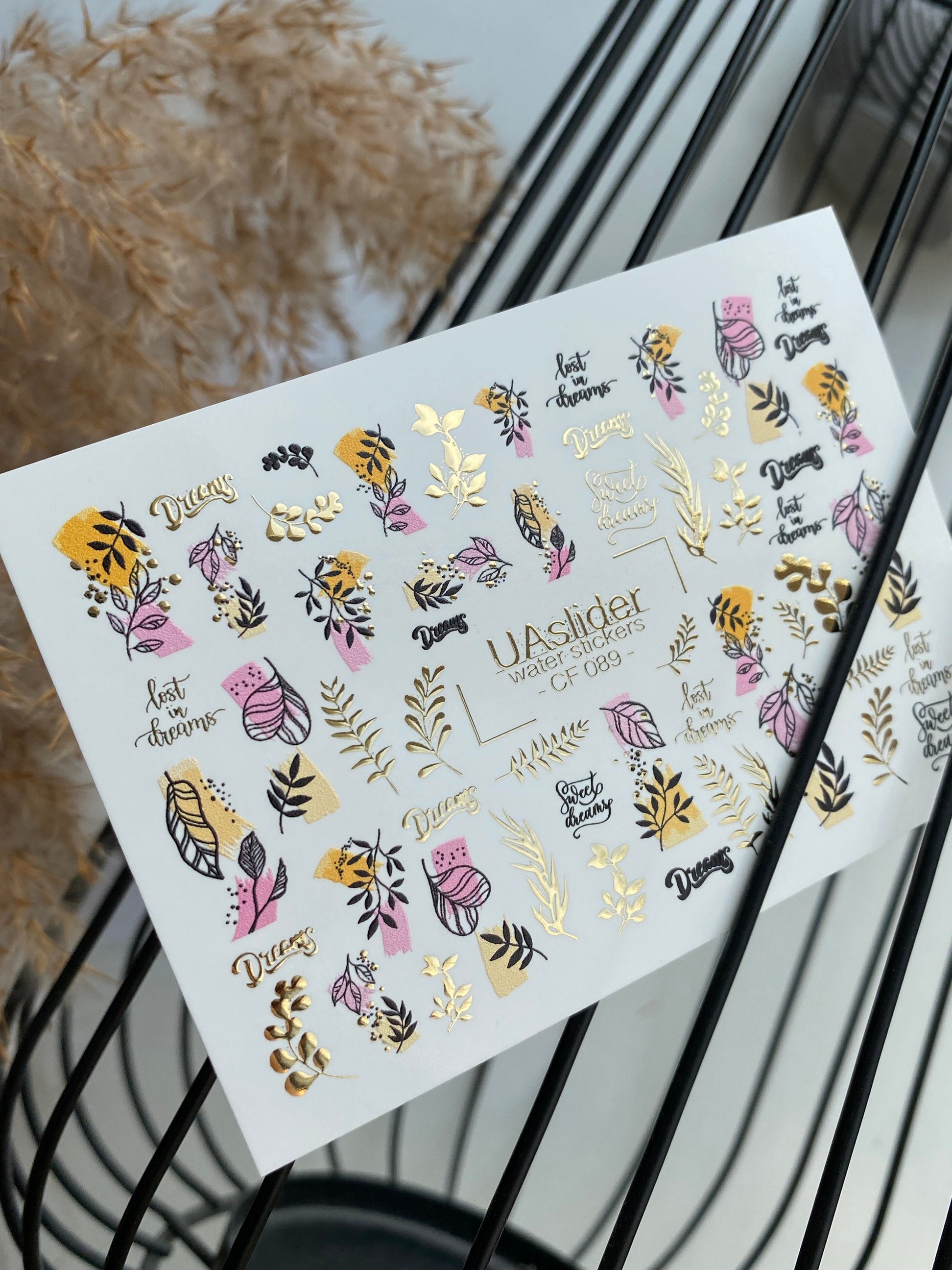 Nail Water Decal CF-089 | Dreamy Botanical Water Slide Nail Decals | Abstract Leaves & Gold Accents