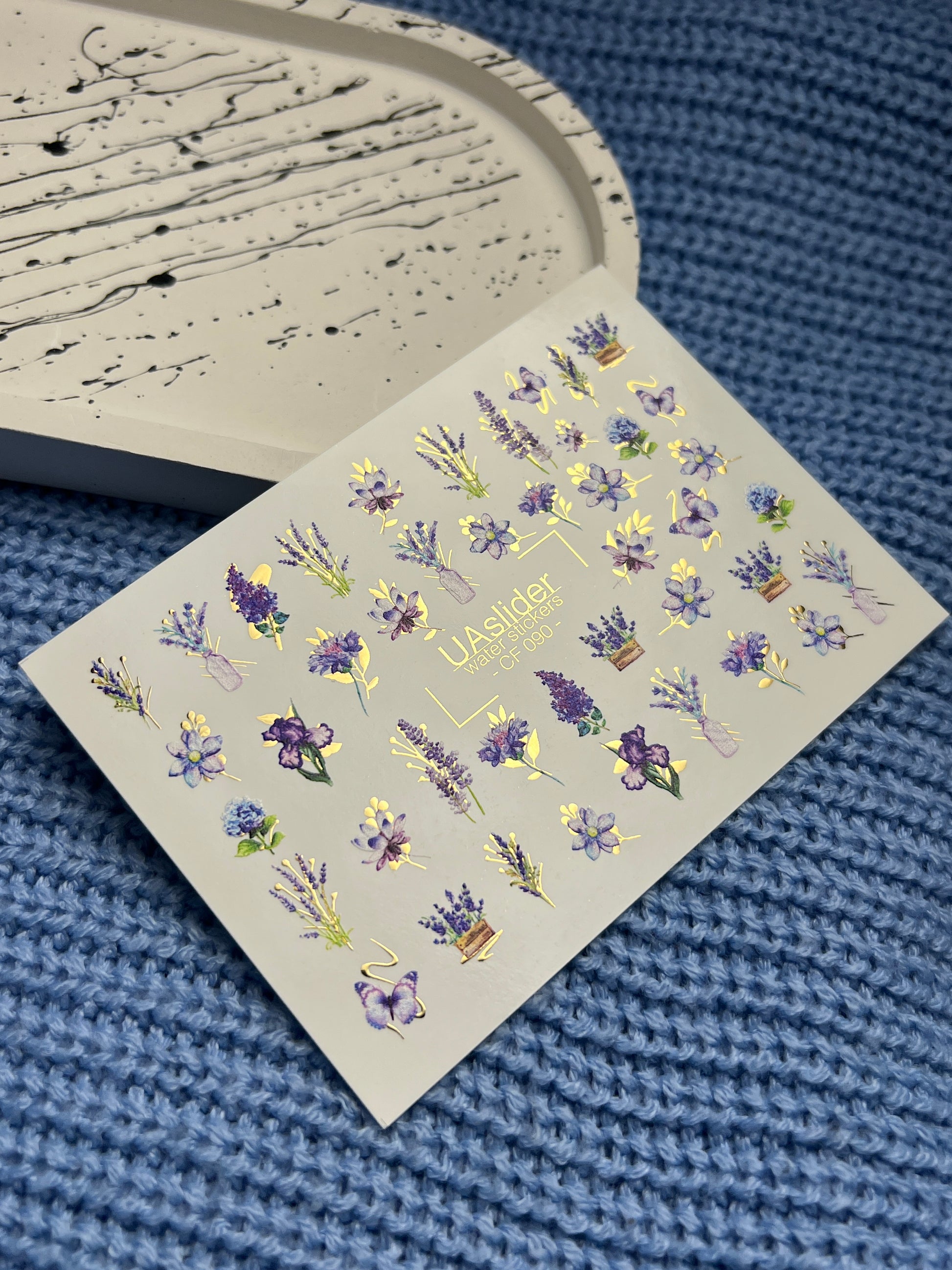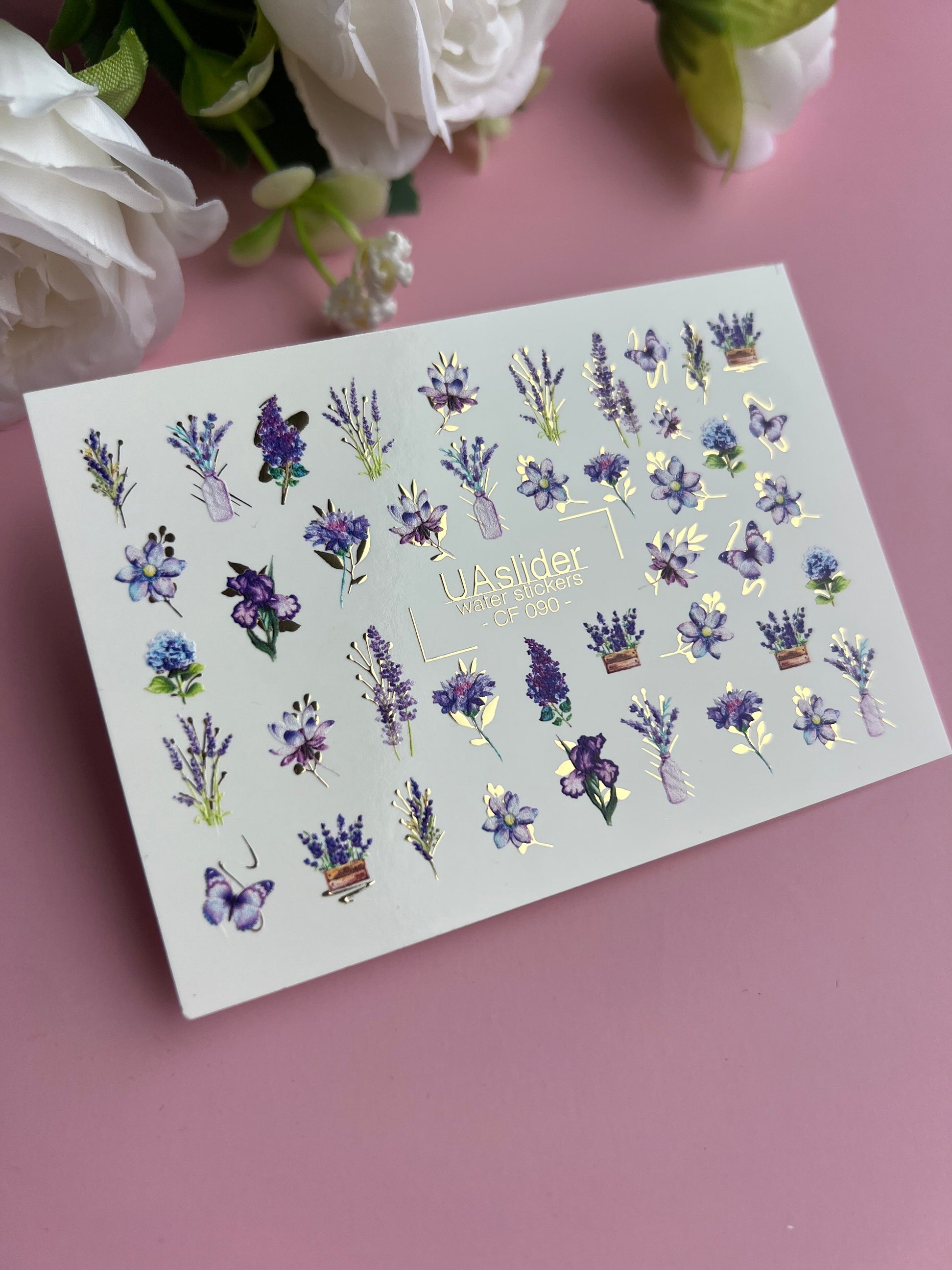 Elegant lavender and violet floral water slide nail decals with delicate bouquets, potted lavender, hydrangea blossoms, and butterflies. Featuring purple and blue flowers with subtle gold foil accents, this set brings a romantic and fresh touch to your manicure. Perfect for spring, summer, or botanical-inspired nail art.