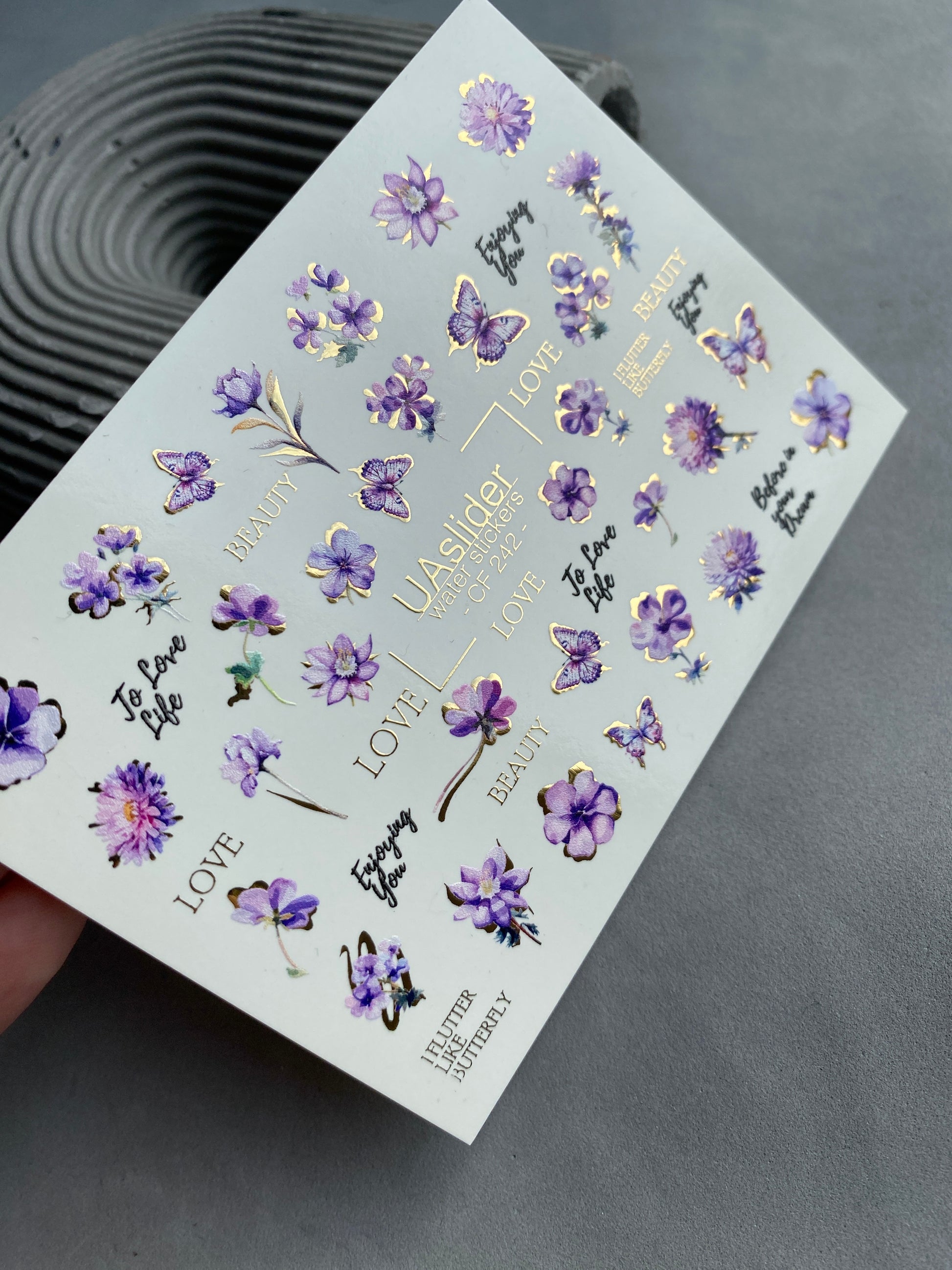 Nail Water Decal CF-090 | Lavender & Violet Floral Water Slide Nail Decals | Purple Flowers & Butterflies