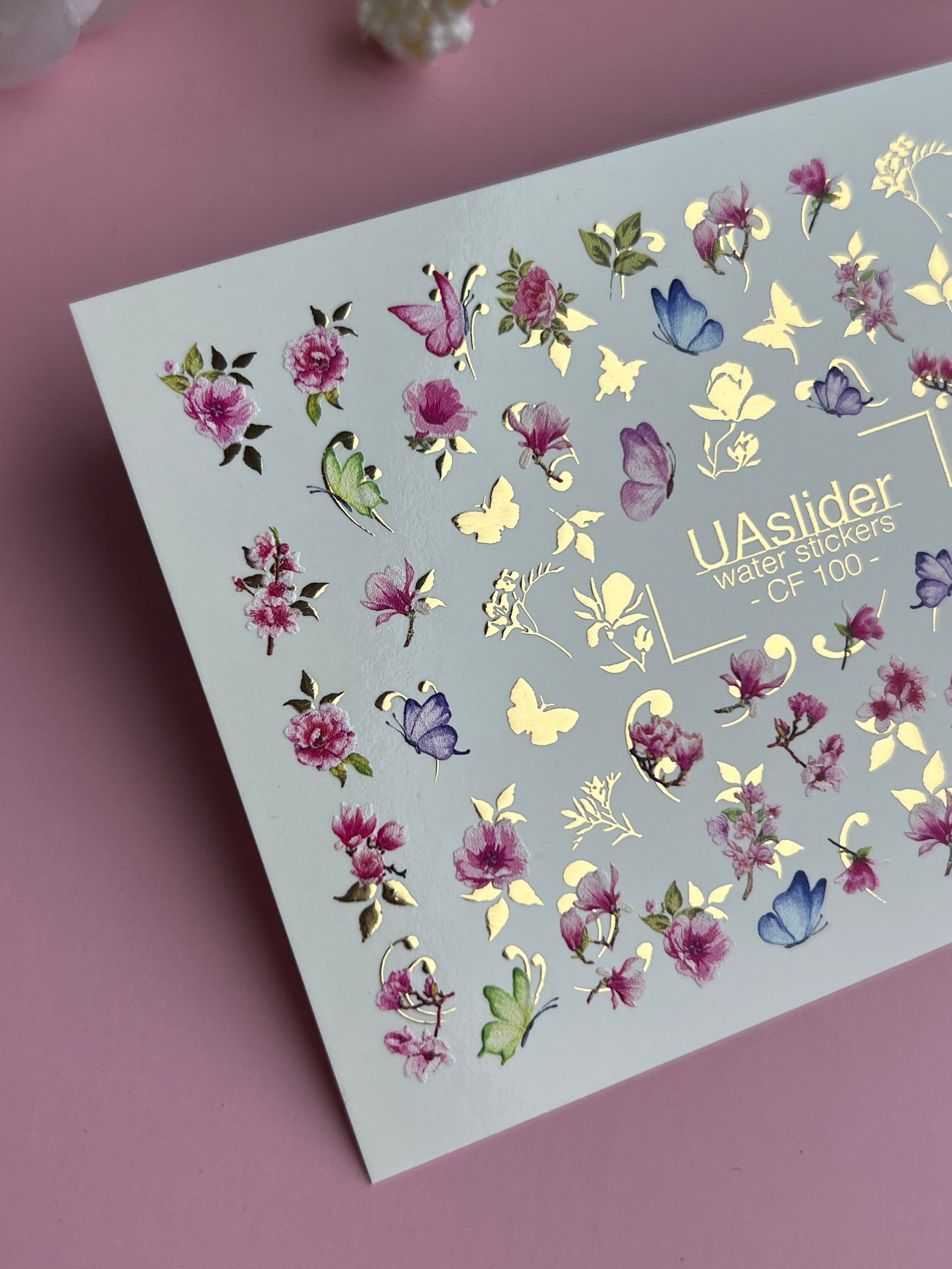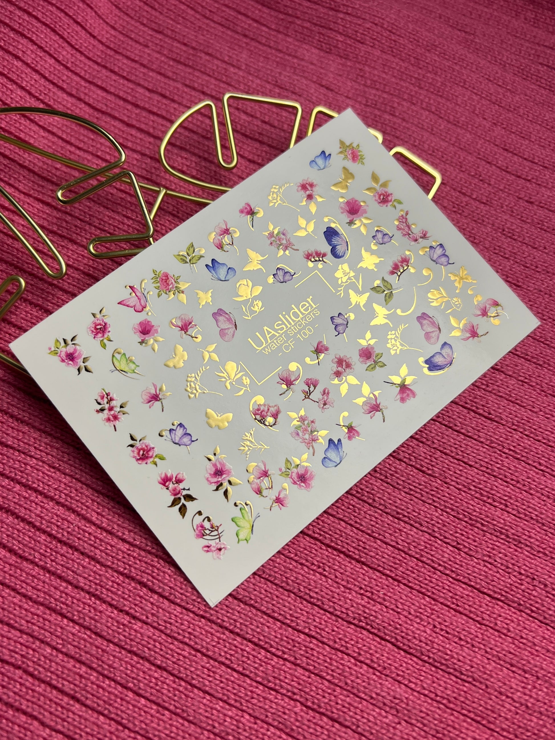 Nail Water Decal CF-100 | Floral Water Slide Nail Decals | Pink Blossoms & Butterflies with Gold AccentsCF_100