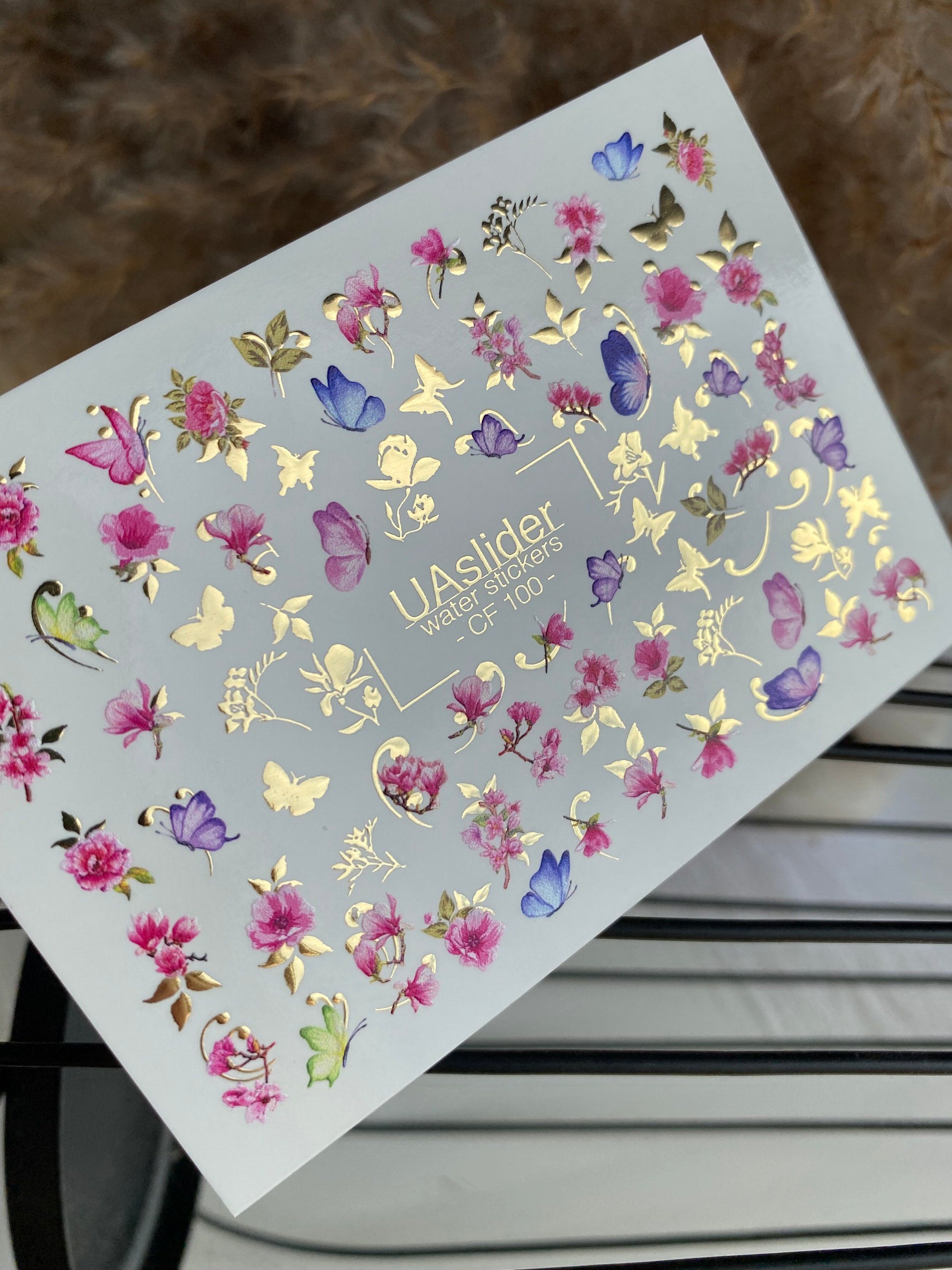 Nail Water Decal CF-100 | Floral Water Slide Nail Decals | Pink Blossoms & Butterflies with Gold Accents