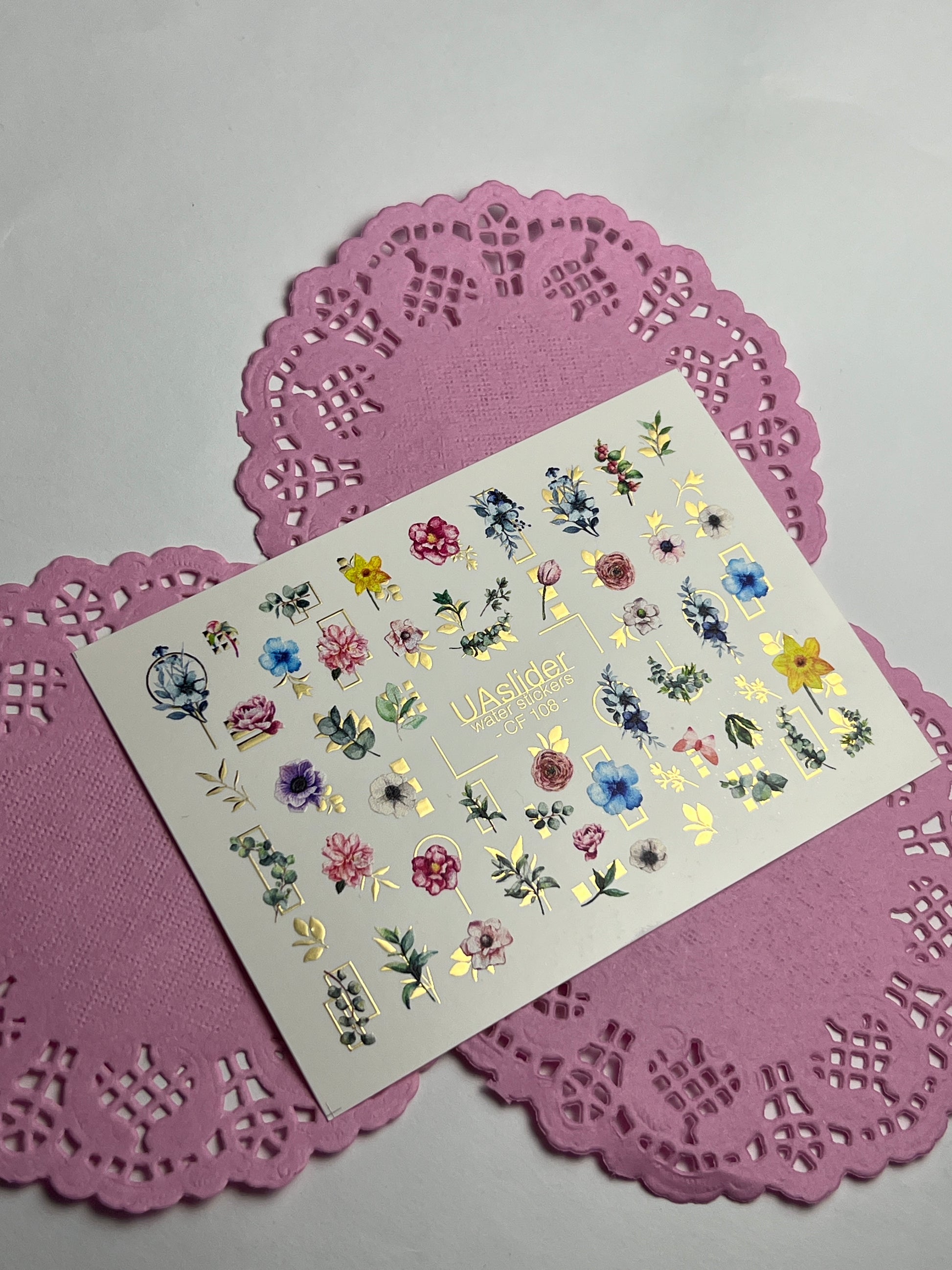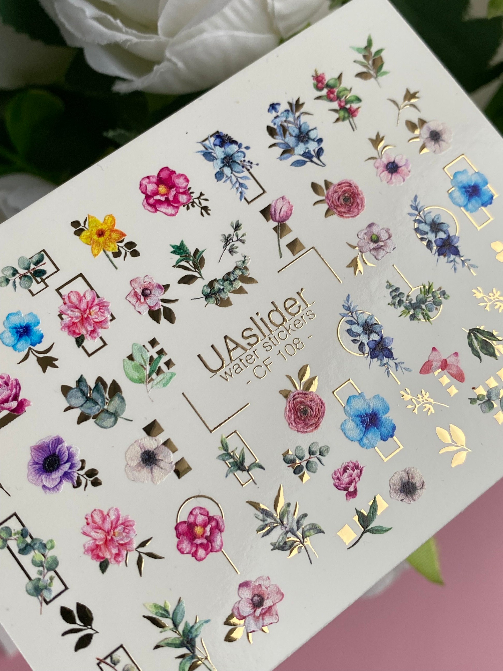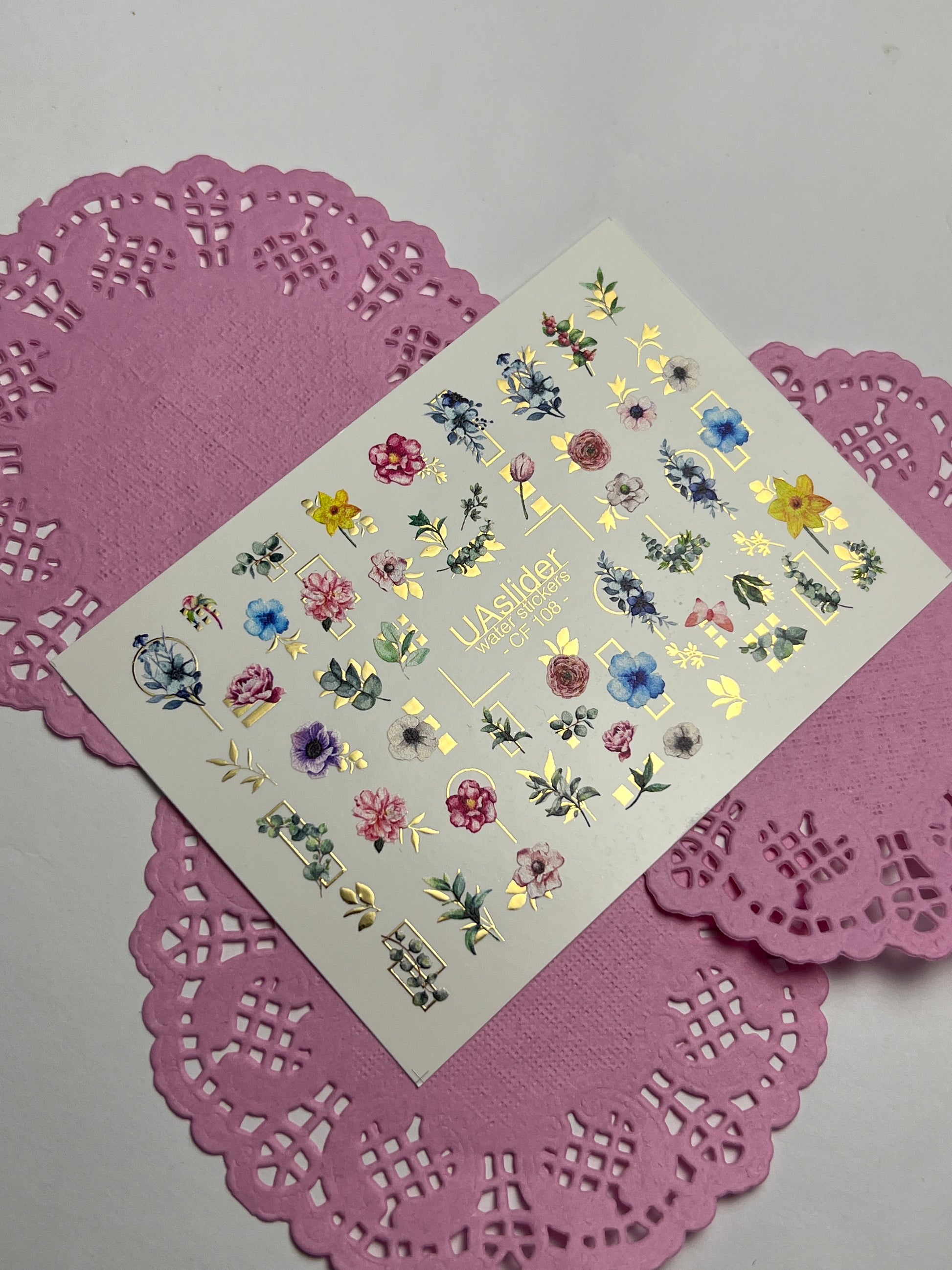 Nail Water Decal CF-108 | Floral Water Slide Nail Decals | Colorful Flowers, Greenery & Gold Frames