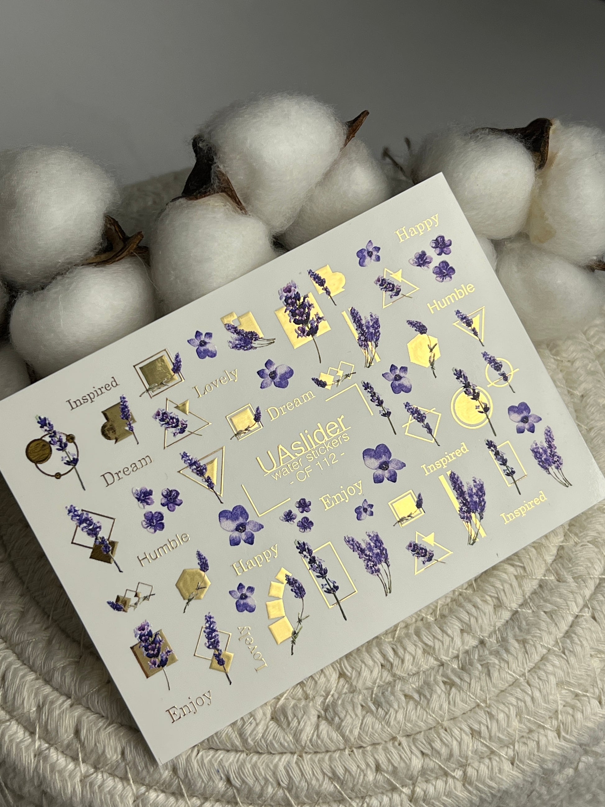 Nail Water Decal CF-112 | Floral Water Slide Nail Decals | Lavender Sprigs, Purple Flowers & Gold Geometry