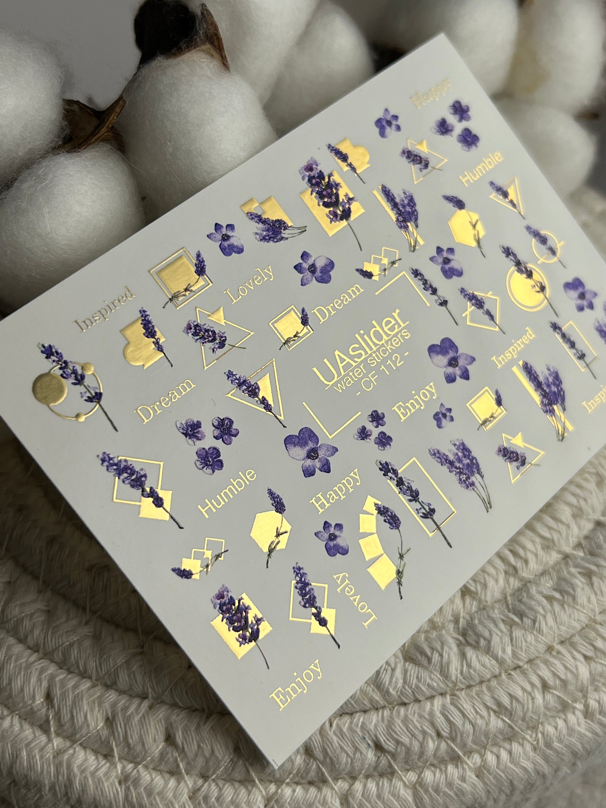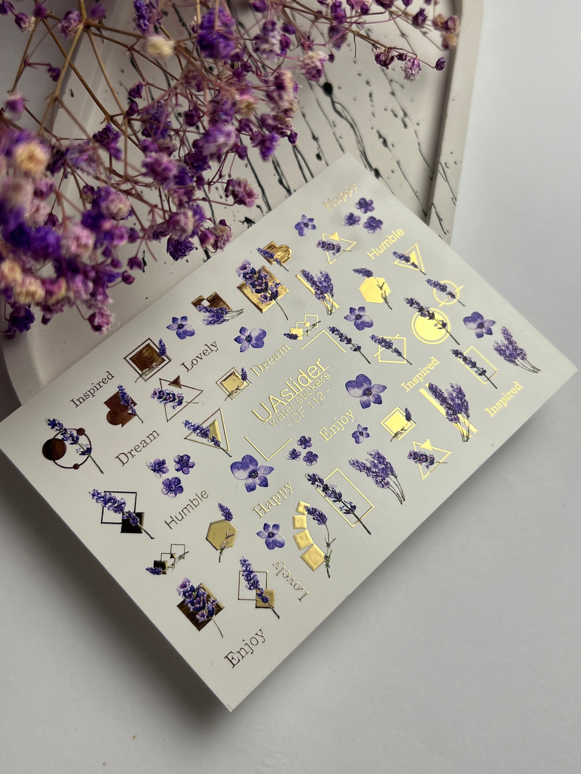 Bring elegance to your manicure with these floral water slide nail decals featuring delicate lavender sprigs, small purple blossoms, and stylish geometric gold accents with inspirational words like “Dream” and “Lovely”.
