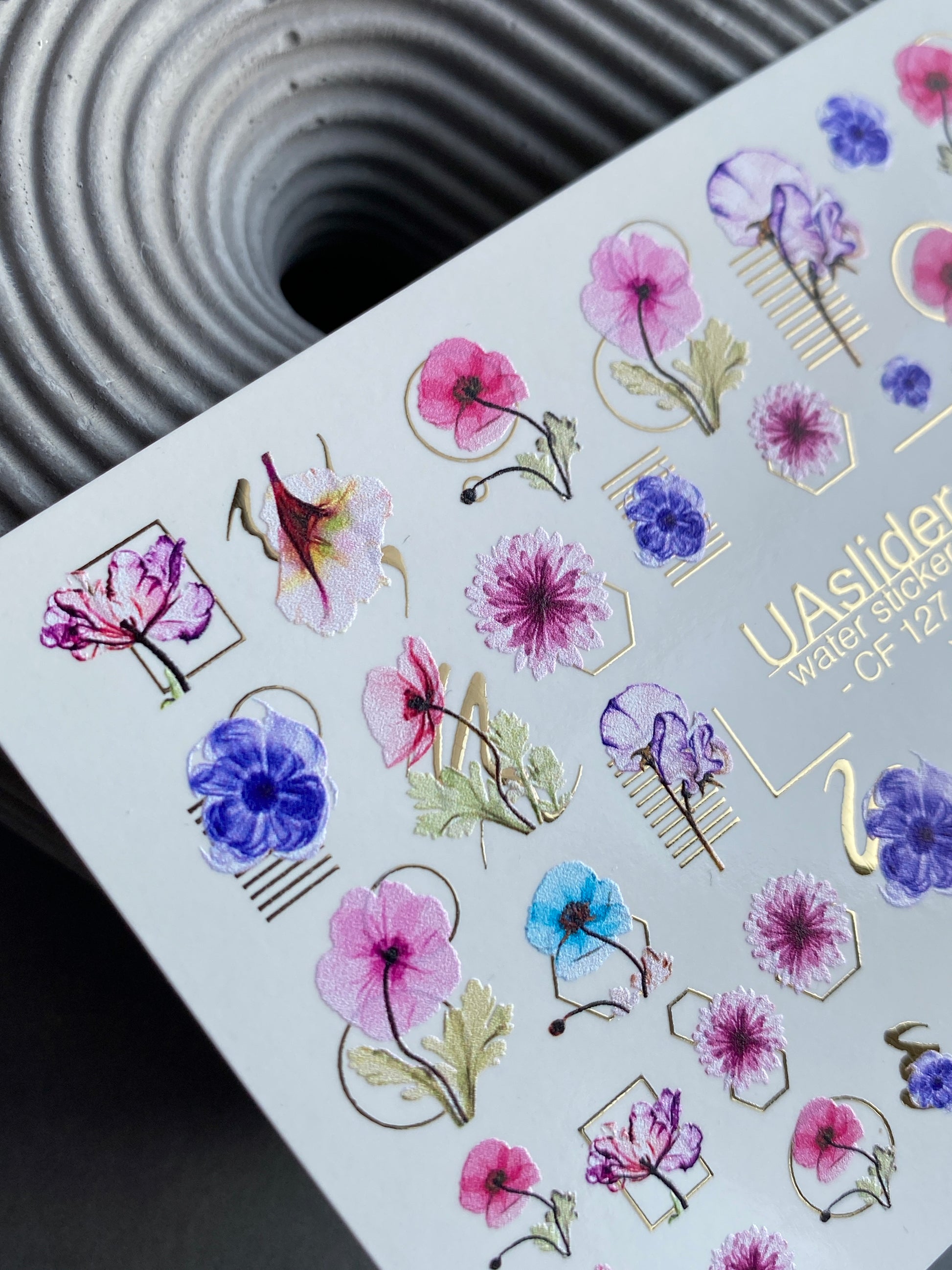 Nail Water Decal CF-127 | Floral Nail Water Decals | Pink, Blue & Purple Flowers with Geometric Gold Accents