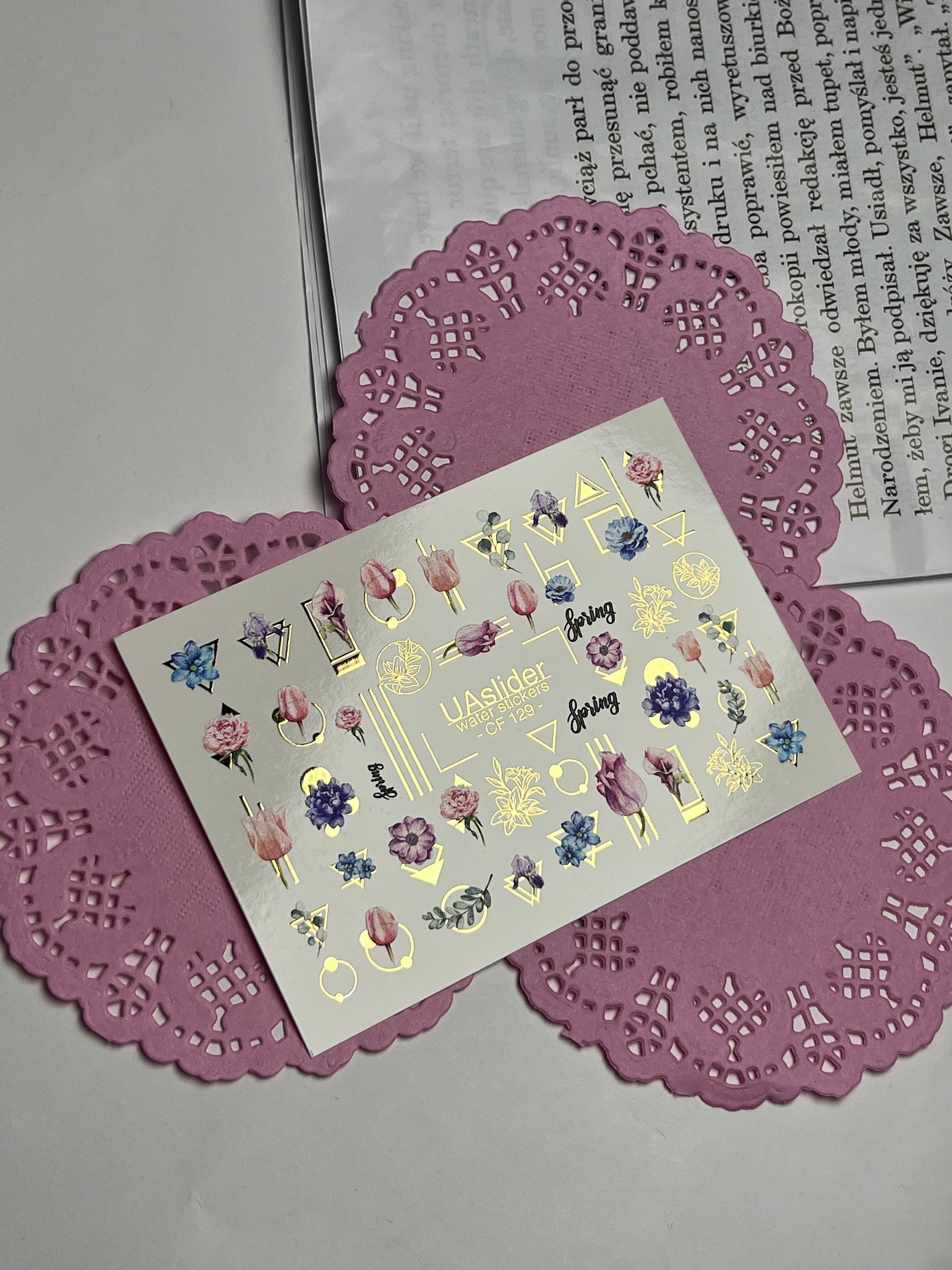 Floral water slide nail decals featuring delicate tulips, peonies, anemones, and other spring blossoms with modern geometric accents in gold.