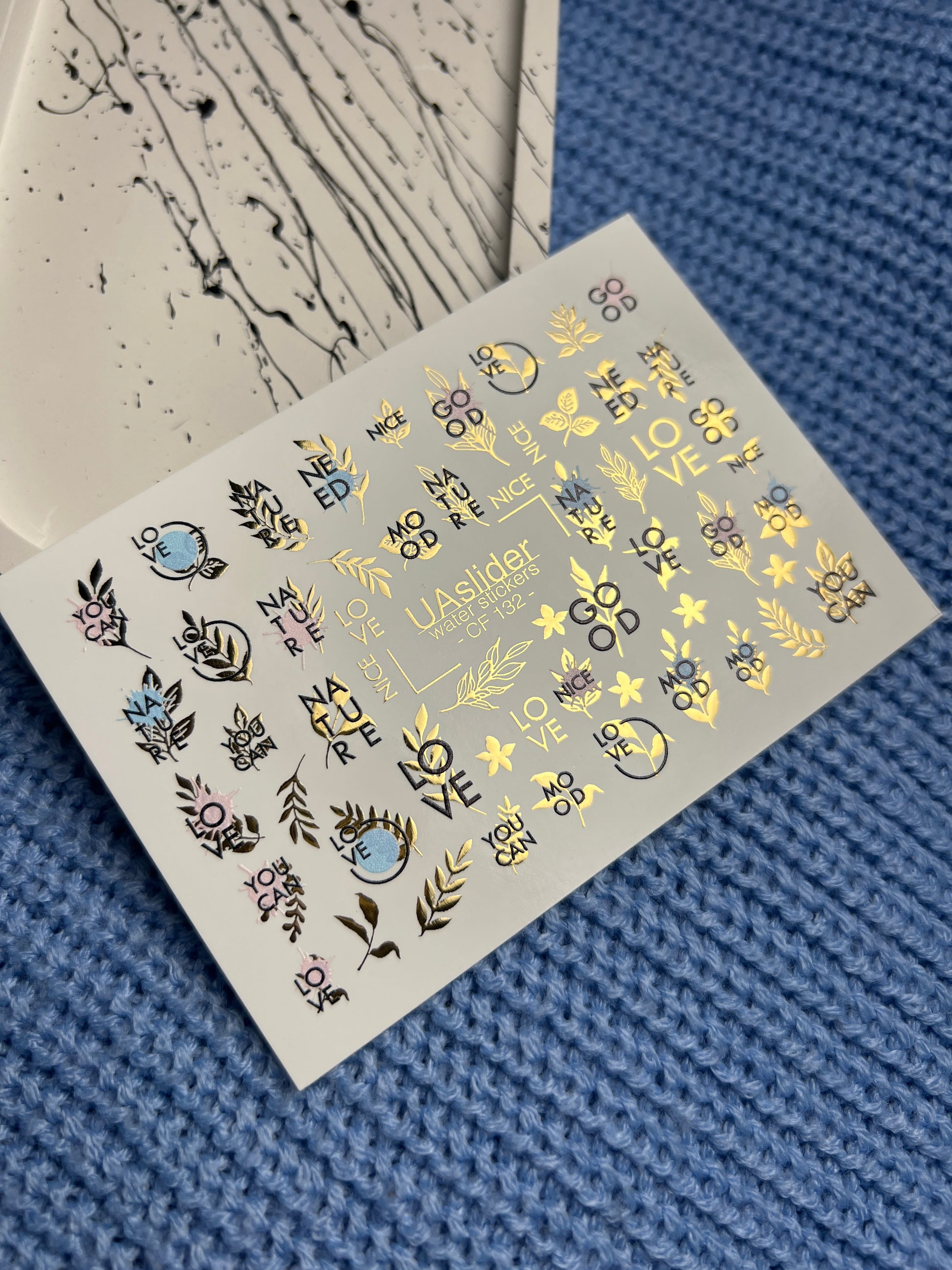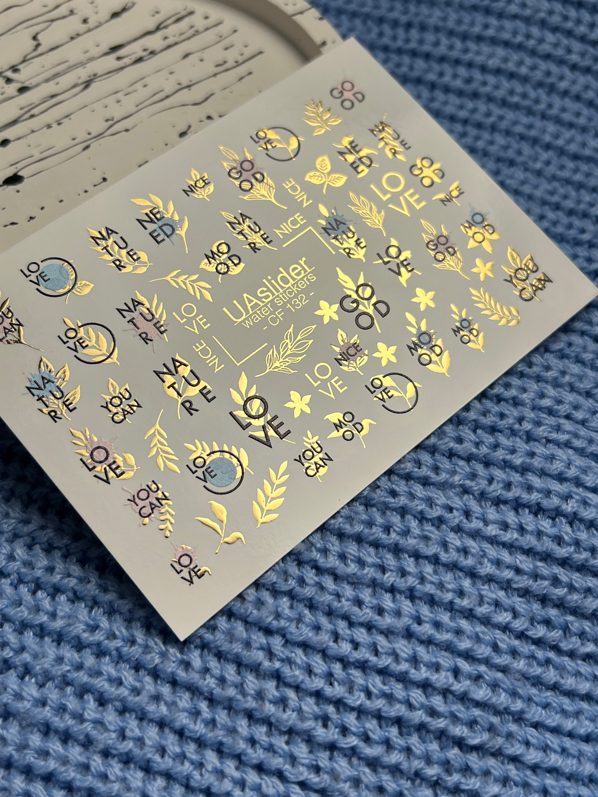 Minimalist water slide nail decals featuring inspirational words and quotes (LOVE, GOOD, NATURE, MOOD, NICE, YOU CAN) combined with golden accents and leaf motifs.