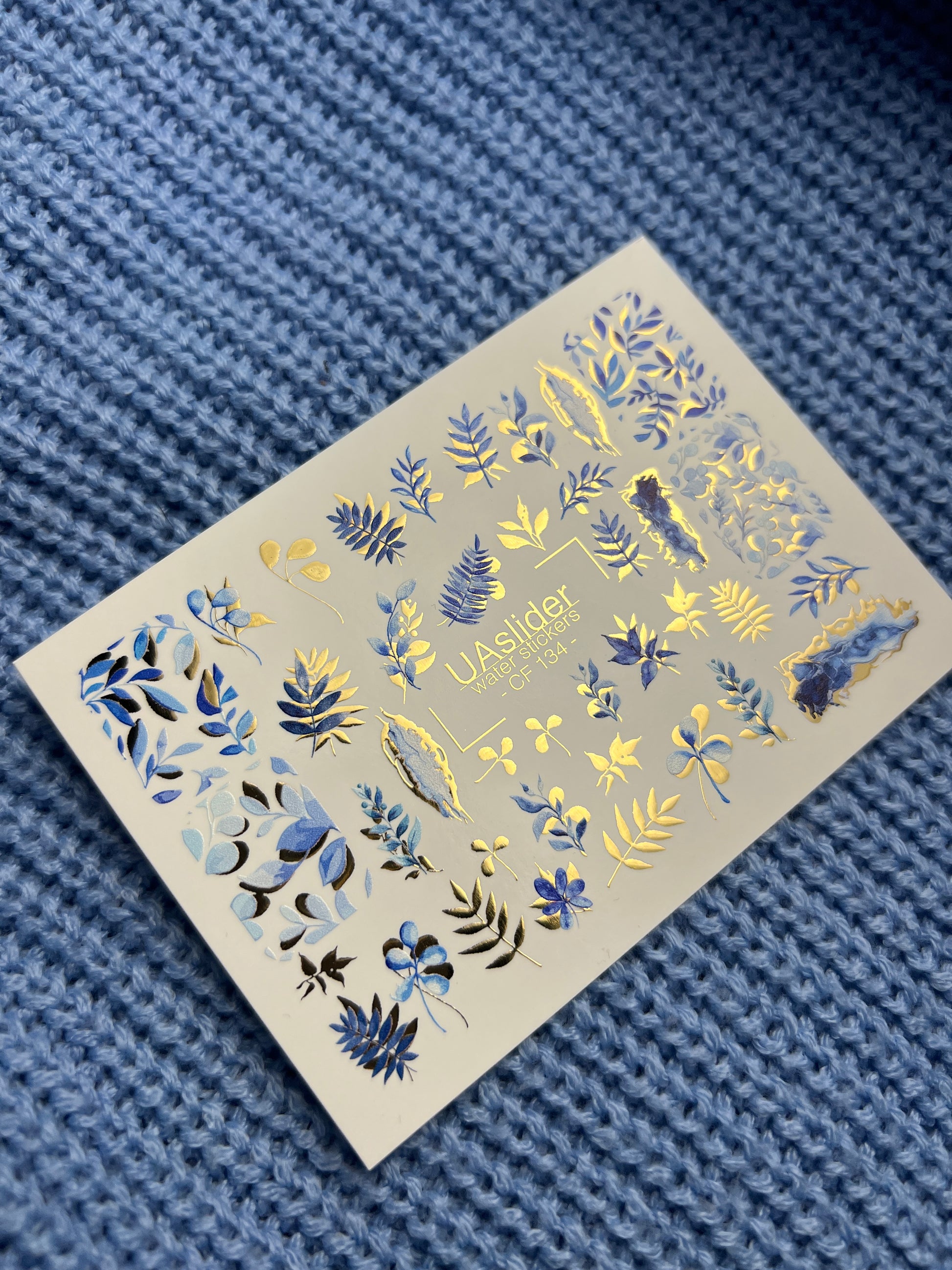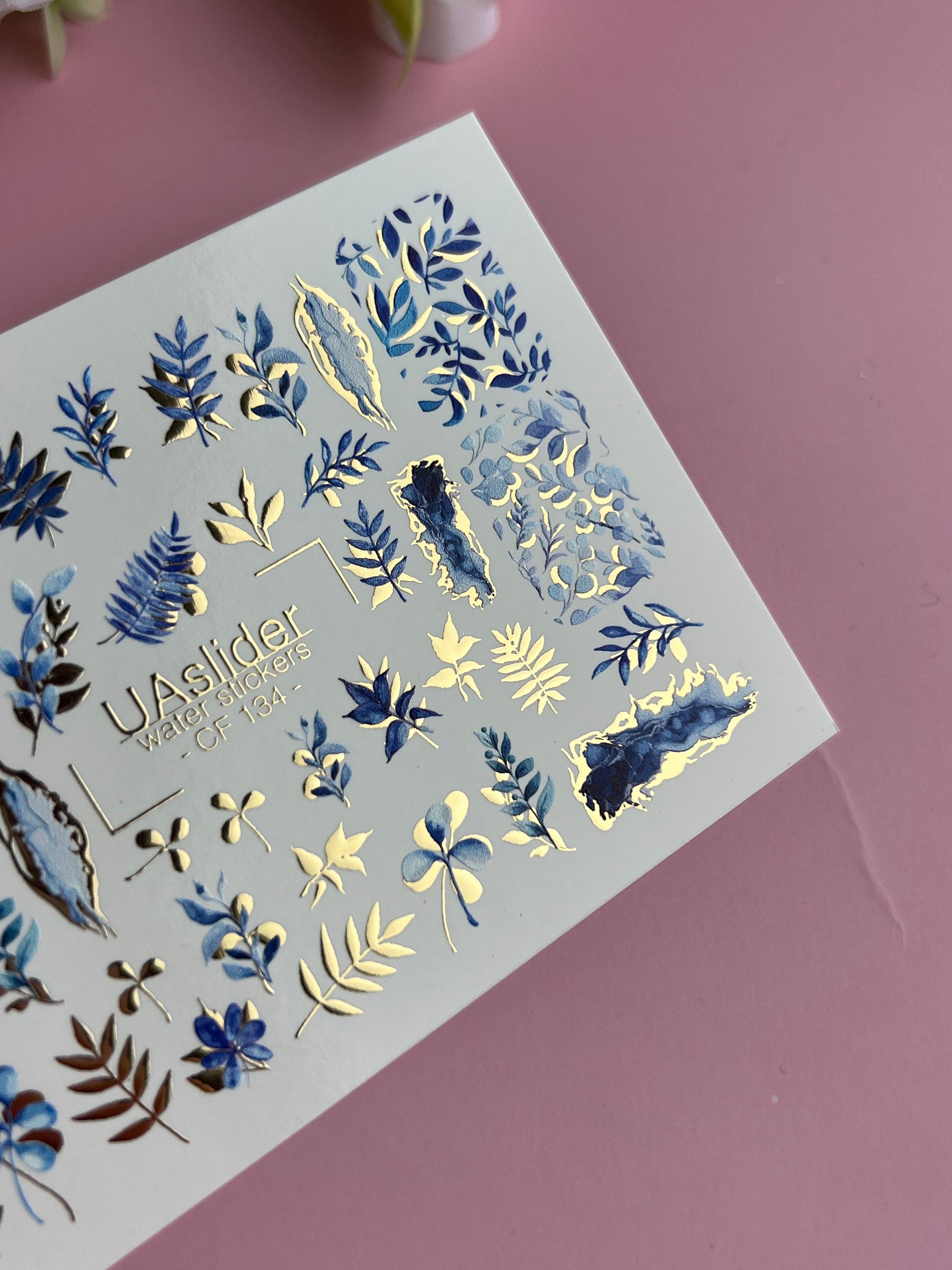 Nail Water Decal CF-134 | Blue Leaf Water Slide Nail Decals | Gold Foil Botanical DesignCF_134
