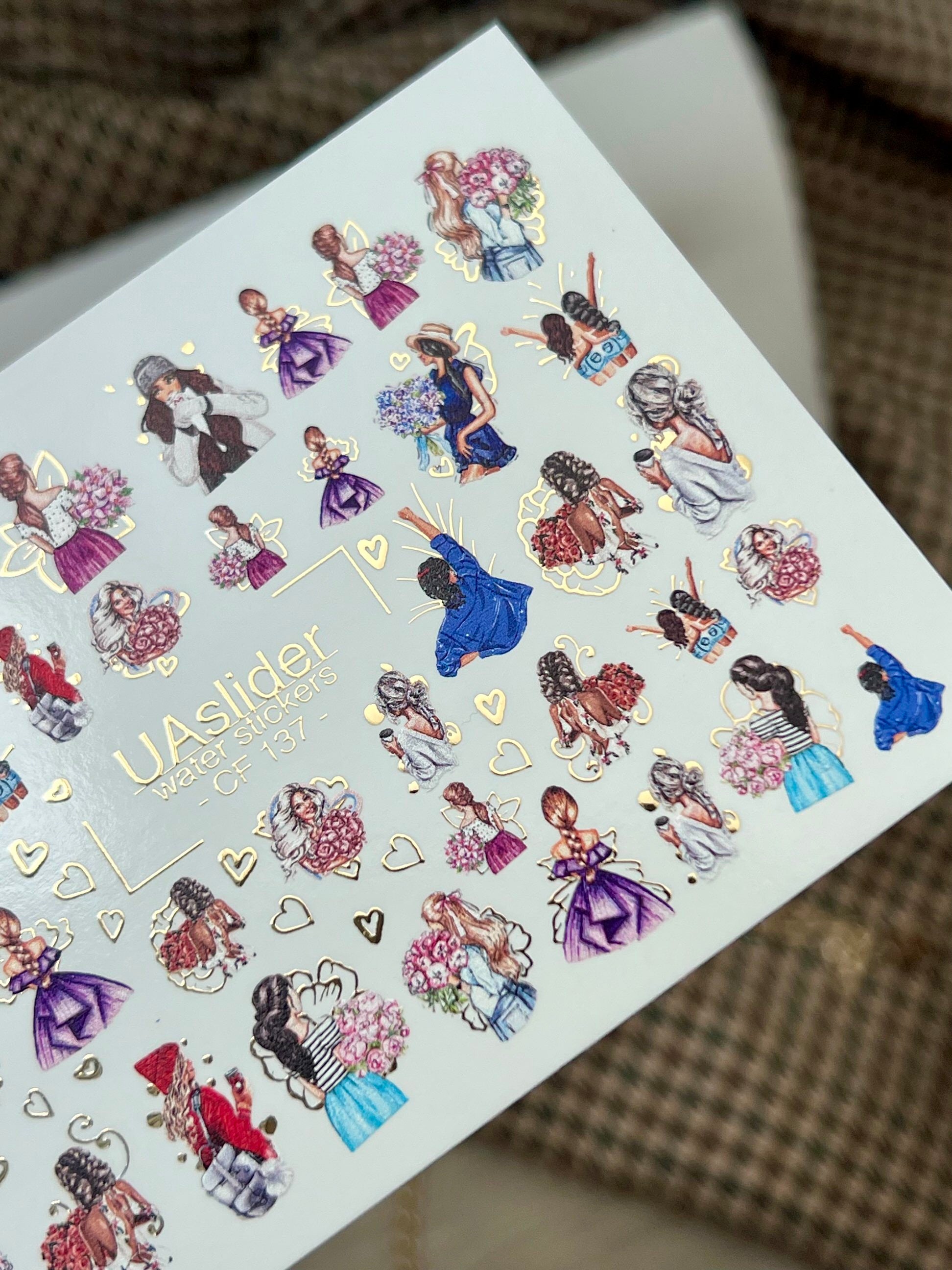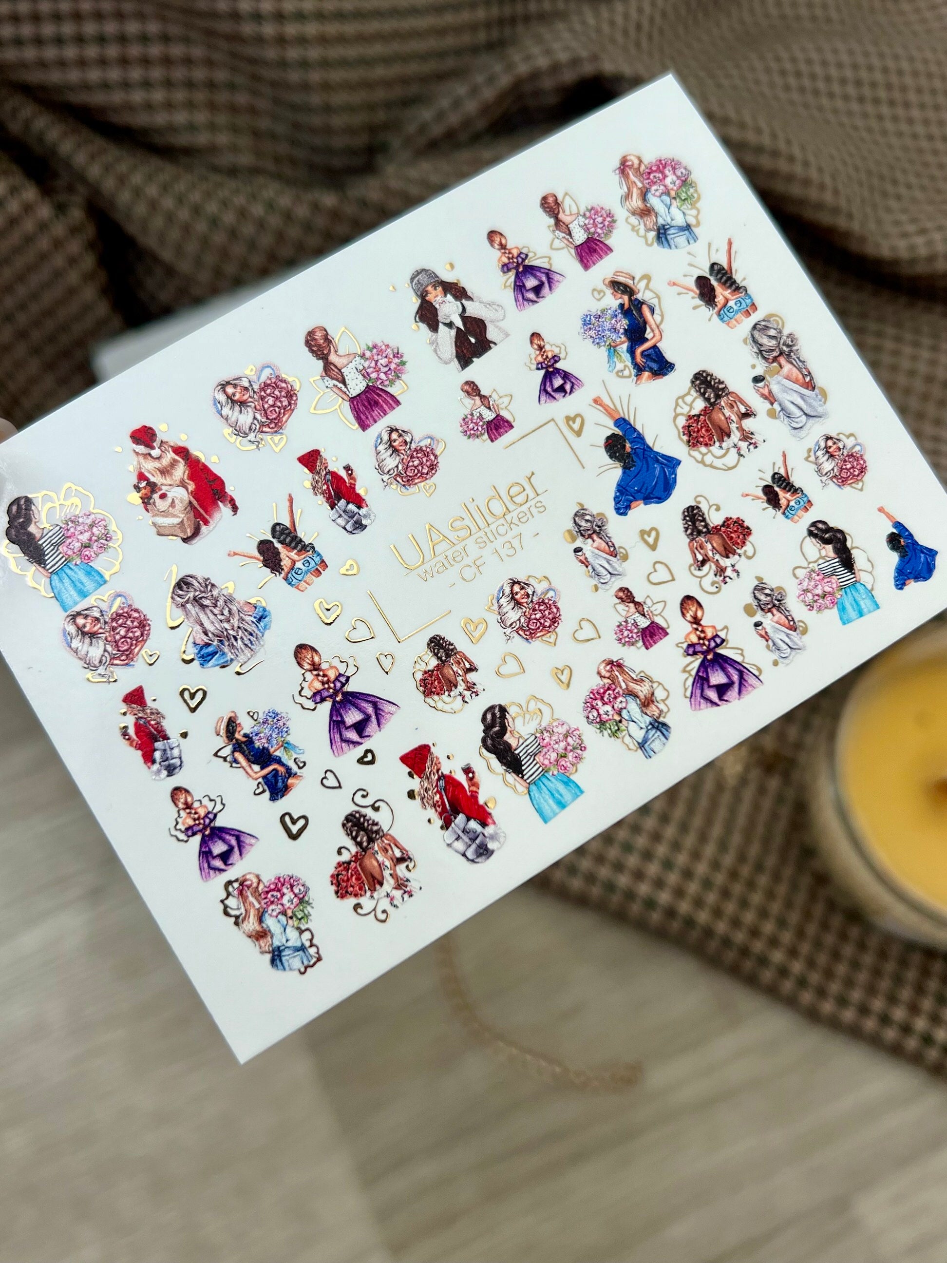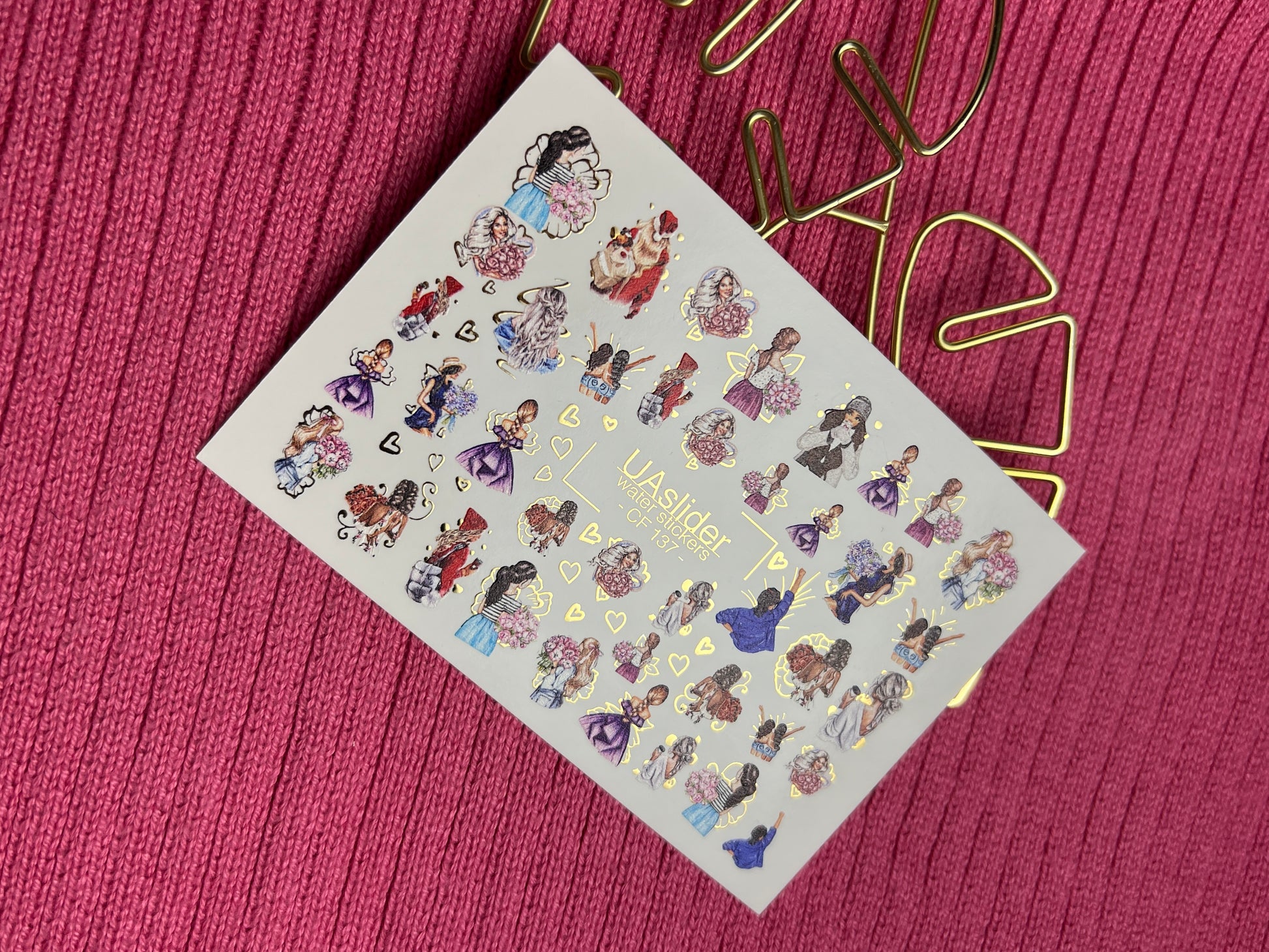 Chic fashion girl water slide nail decals featuring stylish women holding floral bouquets, detailed outfits, and shimmering gold heart accents. A perfect choice for trendy and feminine manicures.