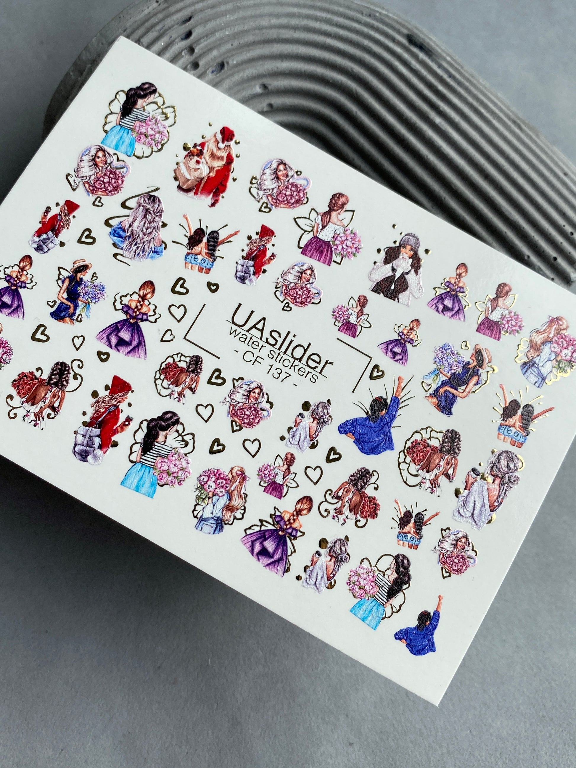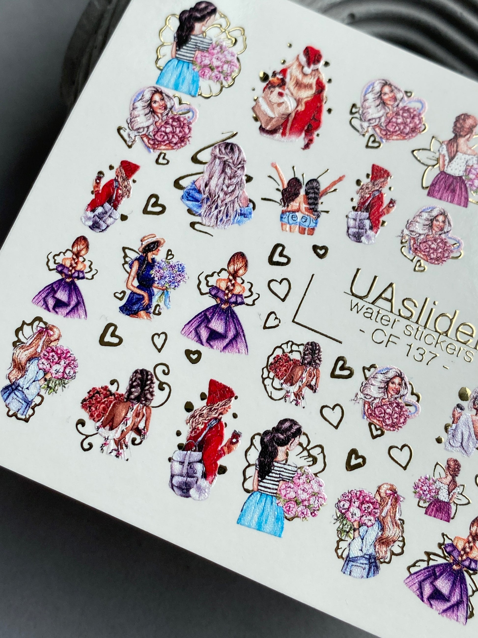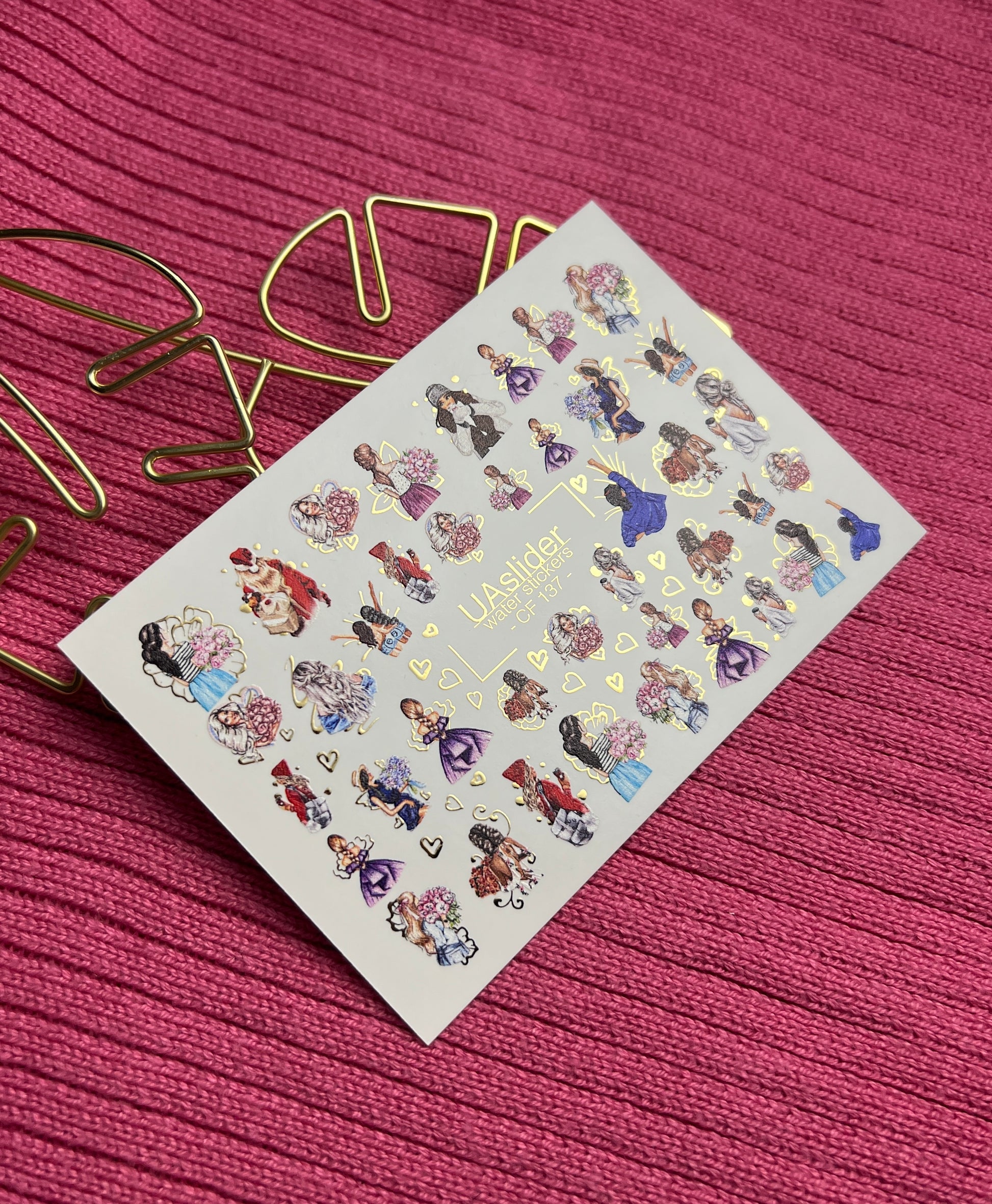 Chic fashion girl water slide nail decals featuring stylish women holding floral bouquets, detailed outfits, and shimmering gold heart accents. A perfect choice for trendy and feminine manicures.