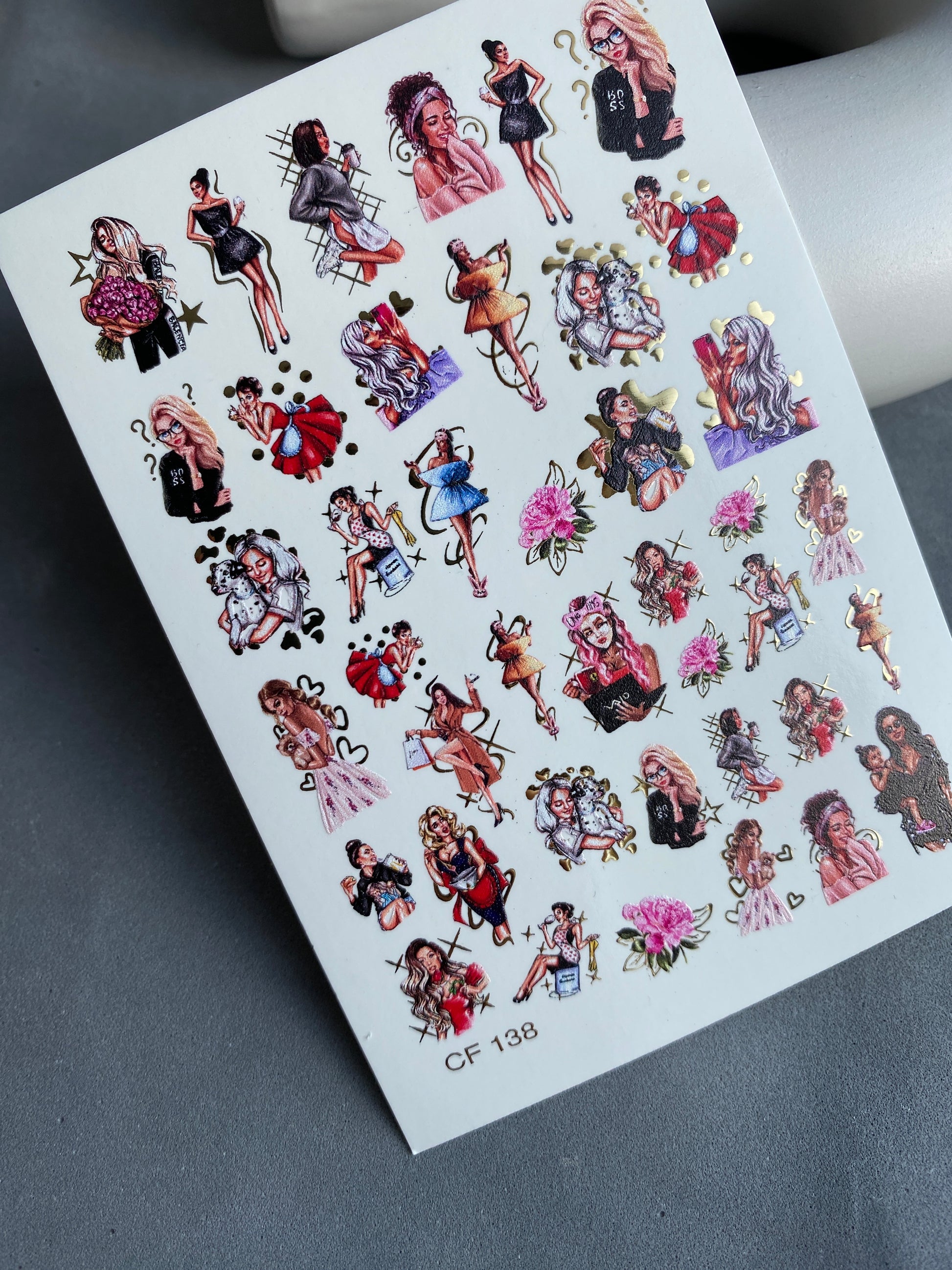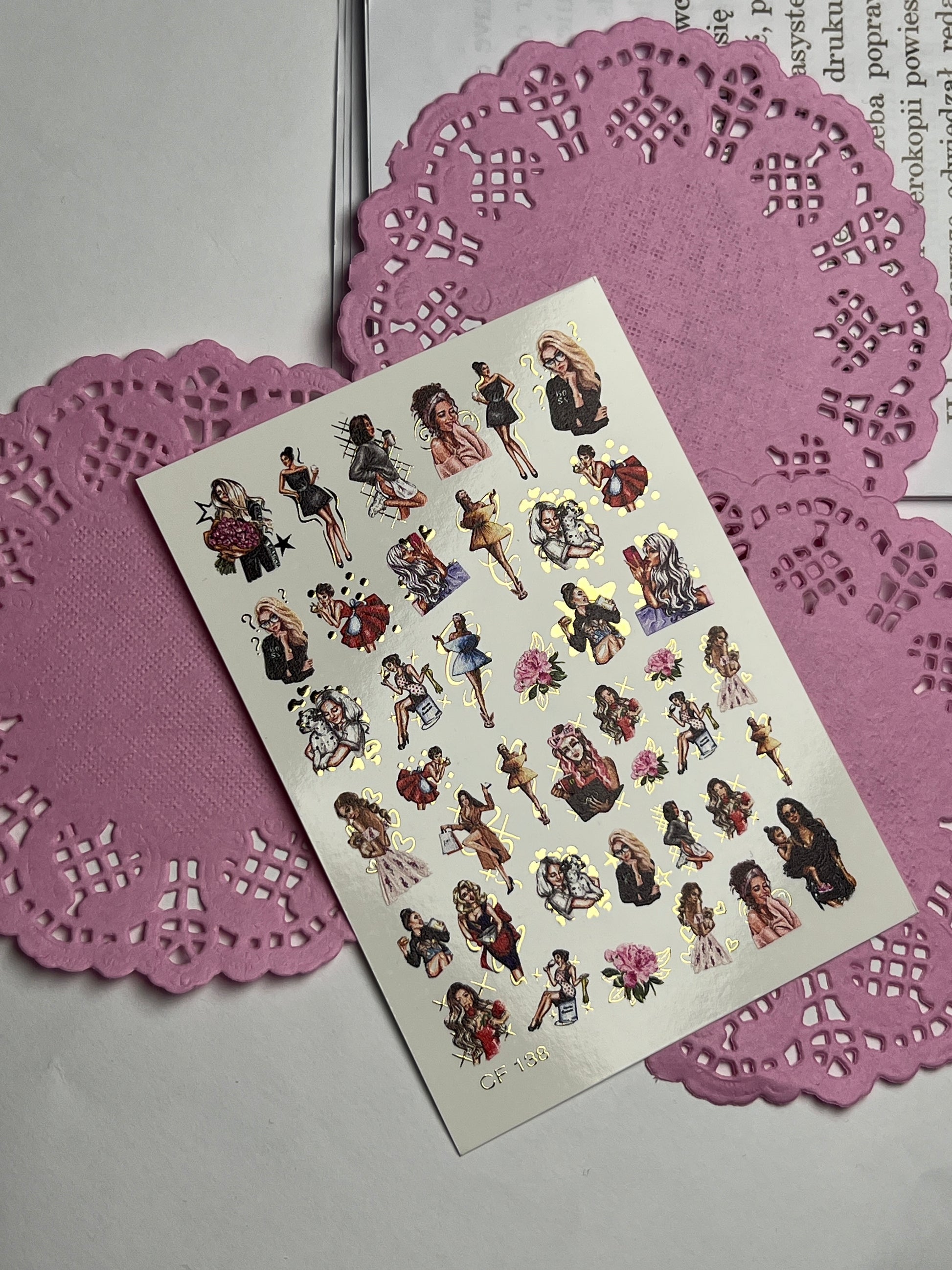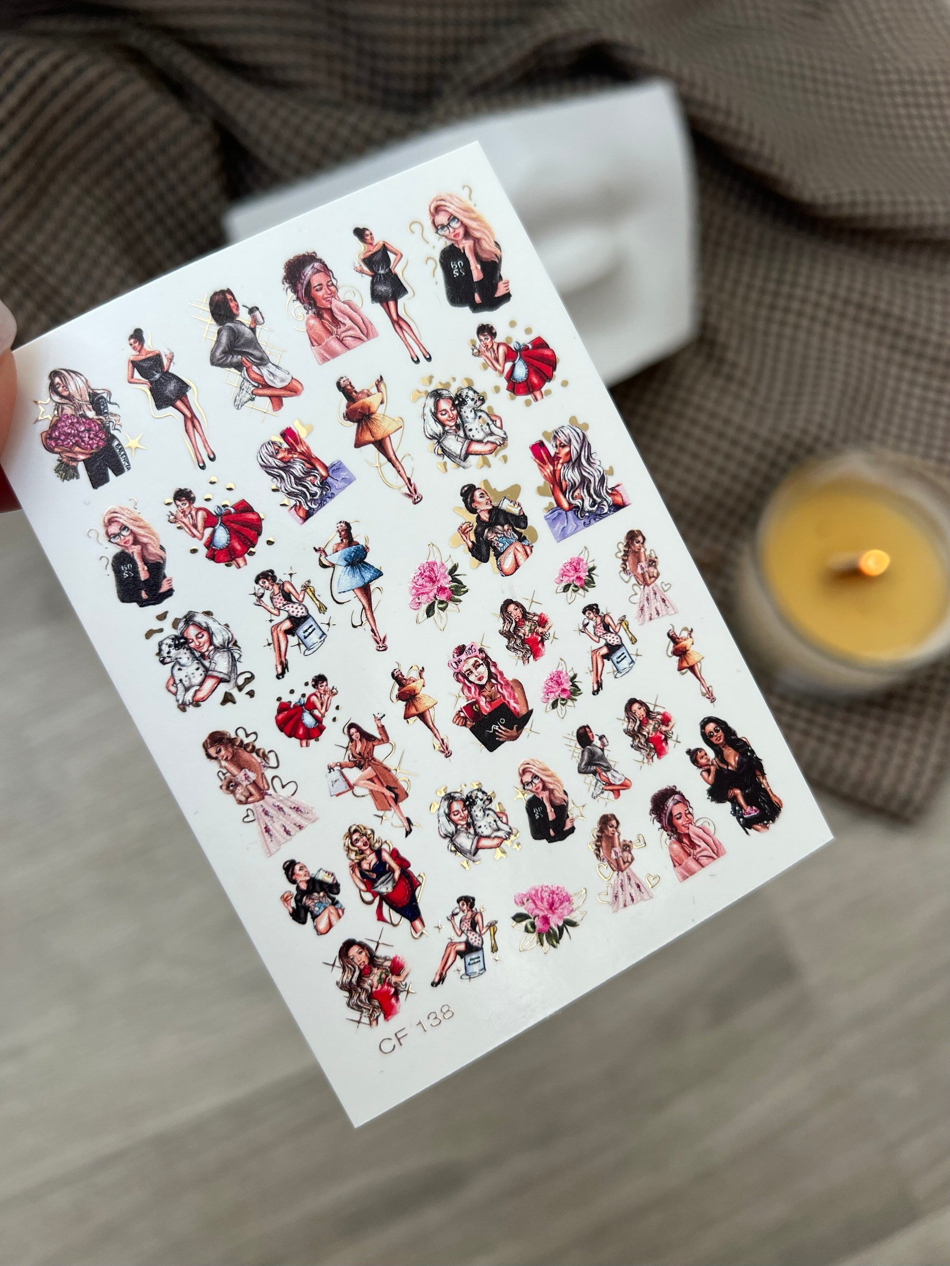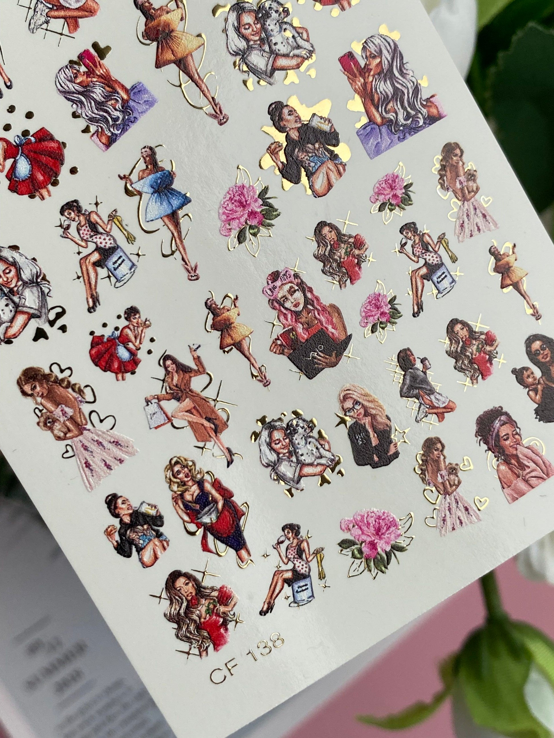 Fashion girl water slide nail decals with chic outfits, feminine poses, and elegant gold details. These stylish illustrations bring a trendy and glamorous vibe to your manicure.