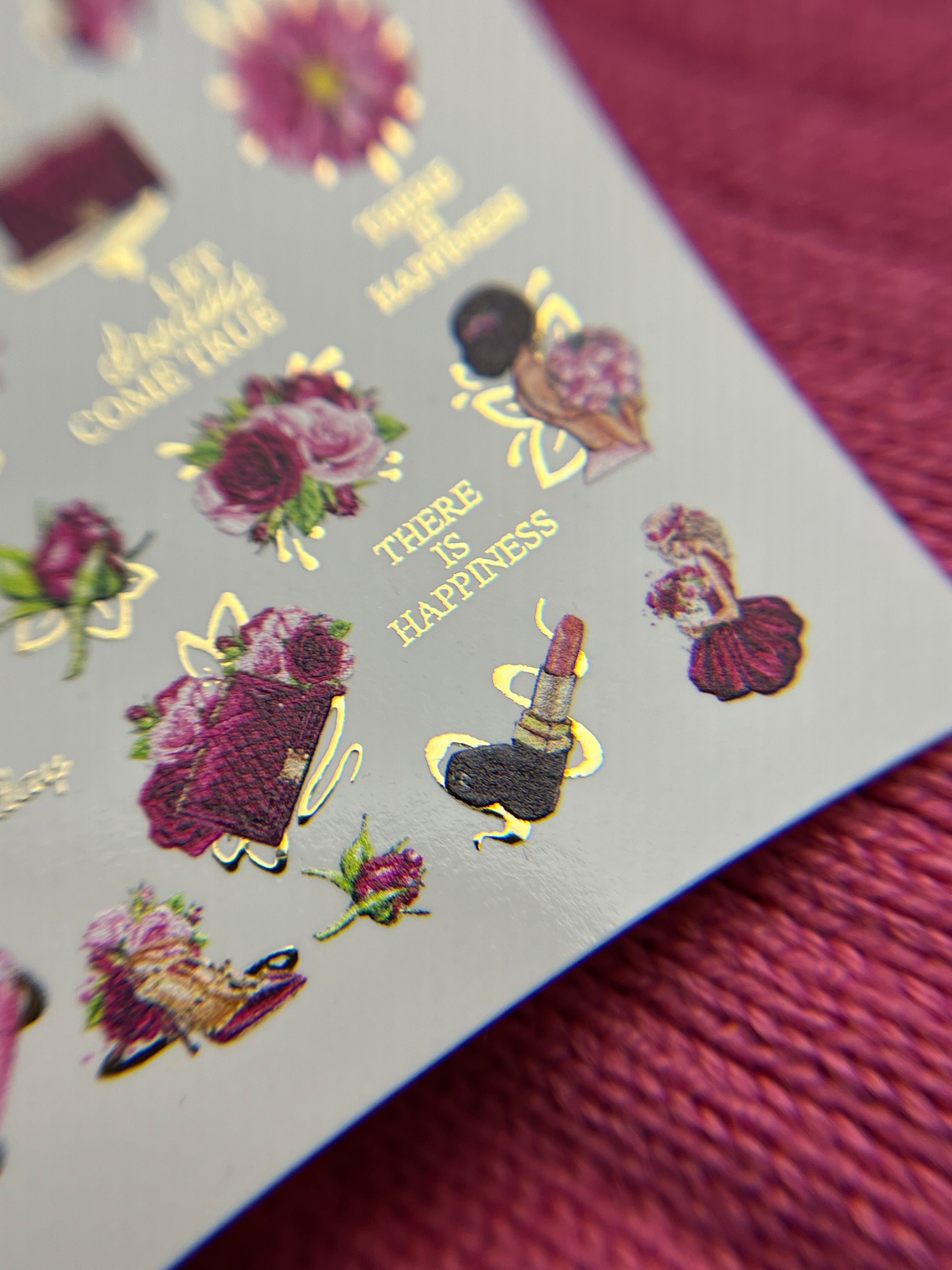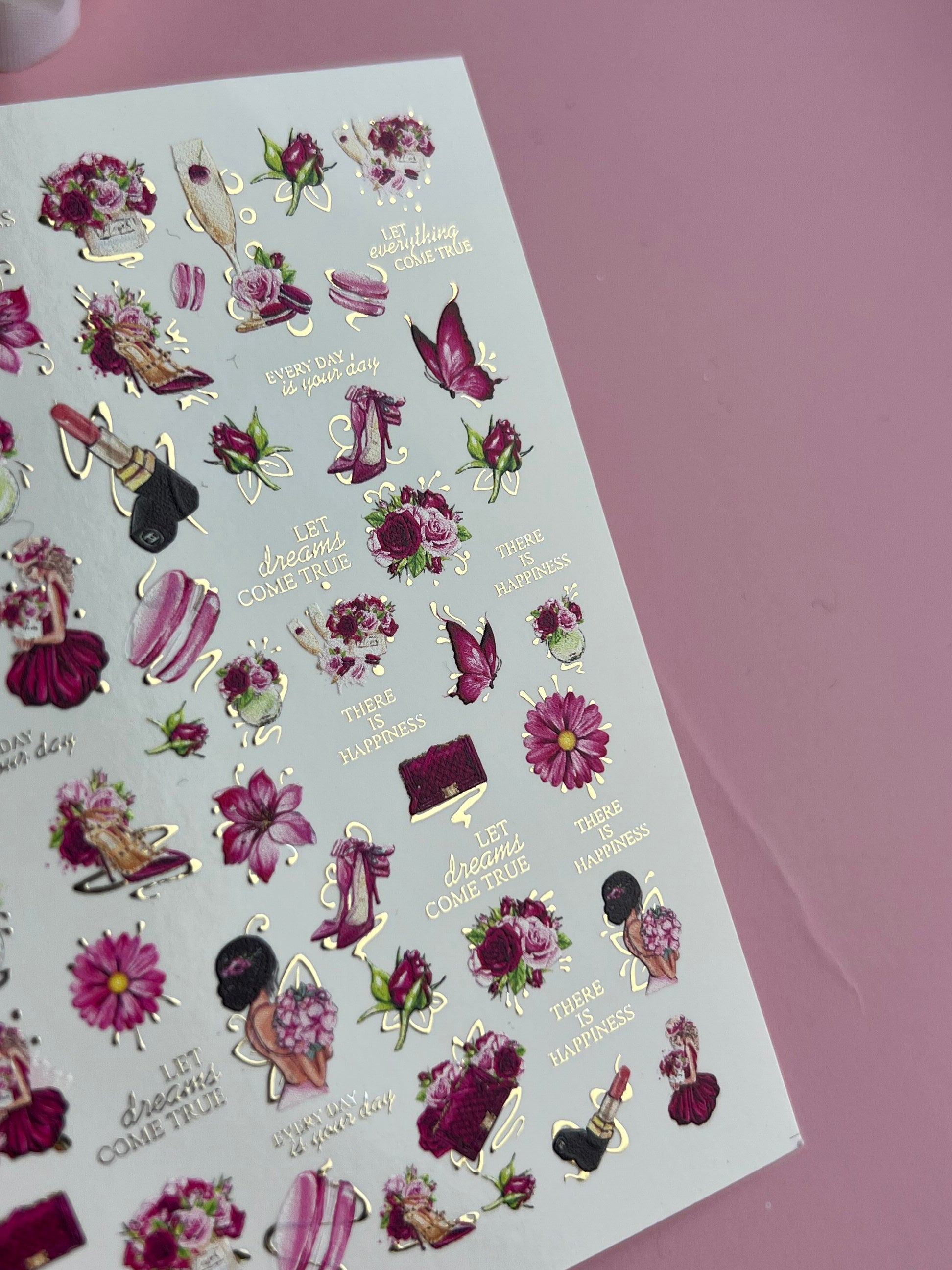 Fashion and floral water slide nail decals featuring elegant high heels, lipstick, handbags, flowers, butterflies, and inspiring quotes. Golden foil accents add a glamorous shine, making your manicure stylish and unique.