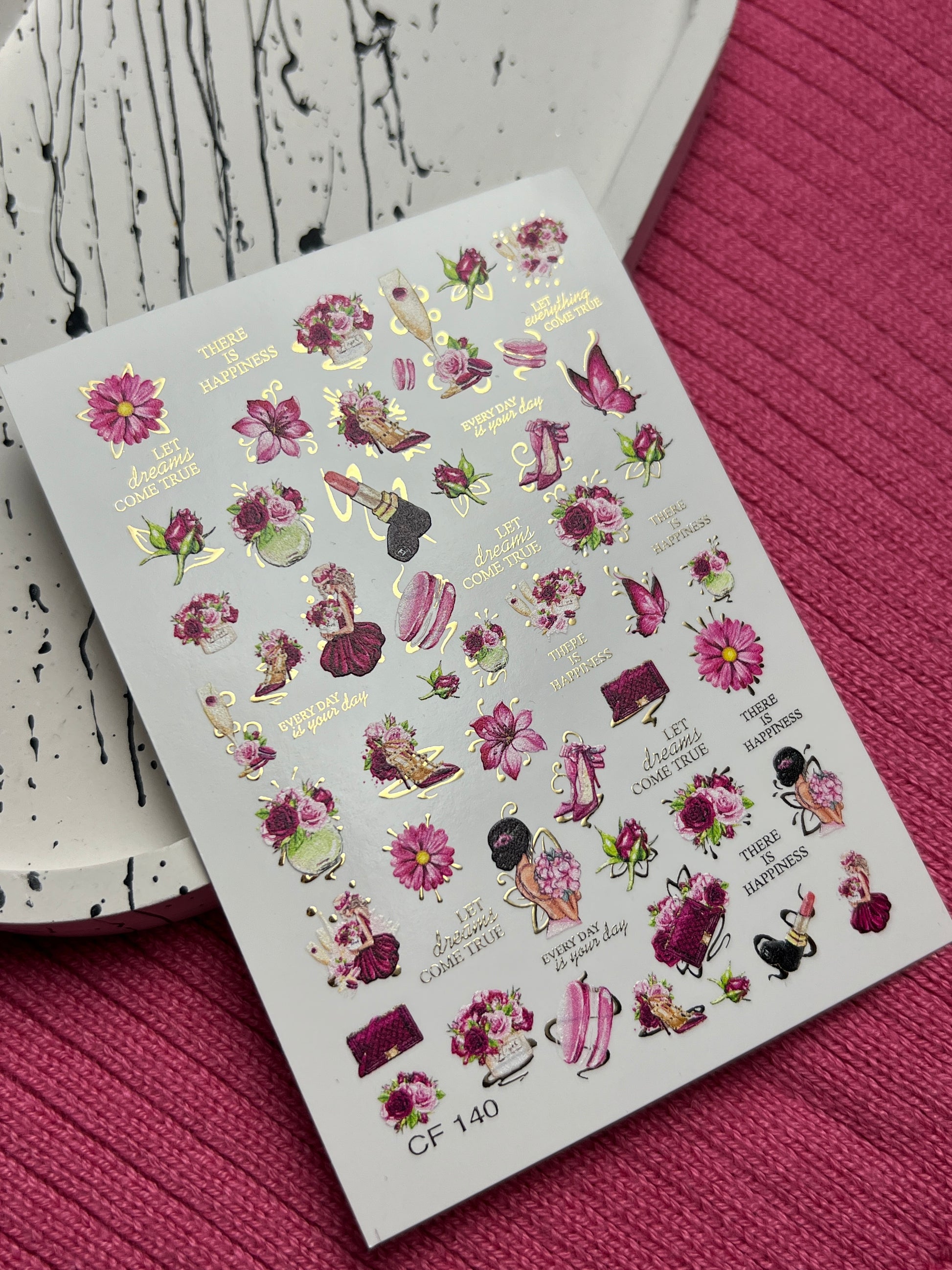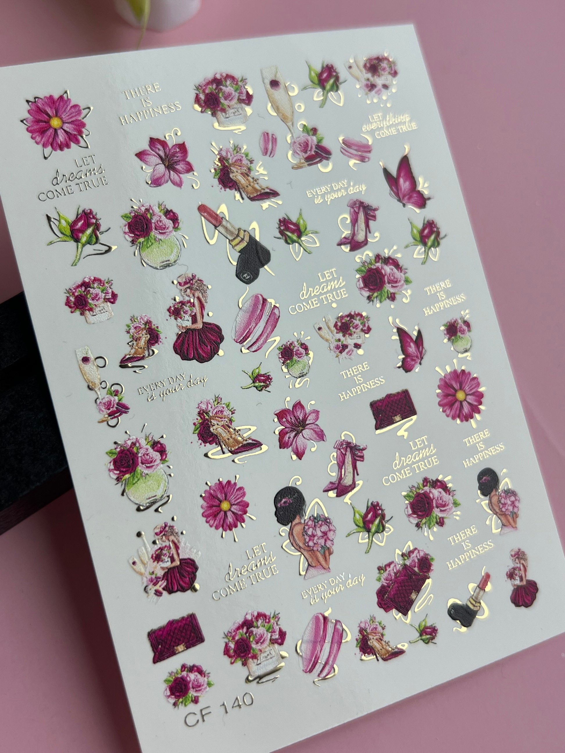 Nail Water Decal CF-140 | Fashion & Floral Water Slide Nail Decals | Shoes, Lipstick & Gold Foil Accents
