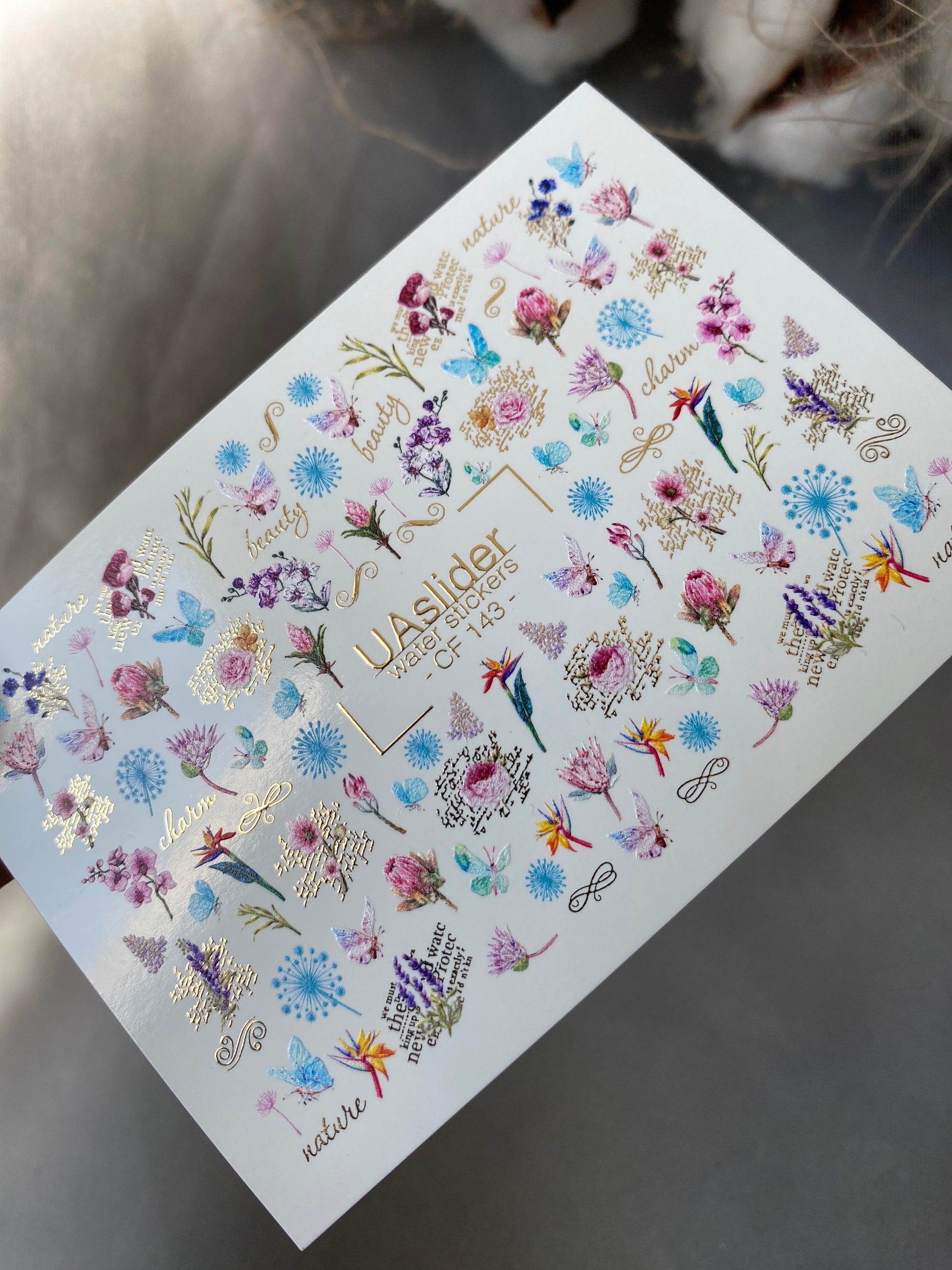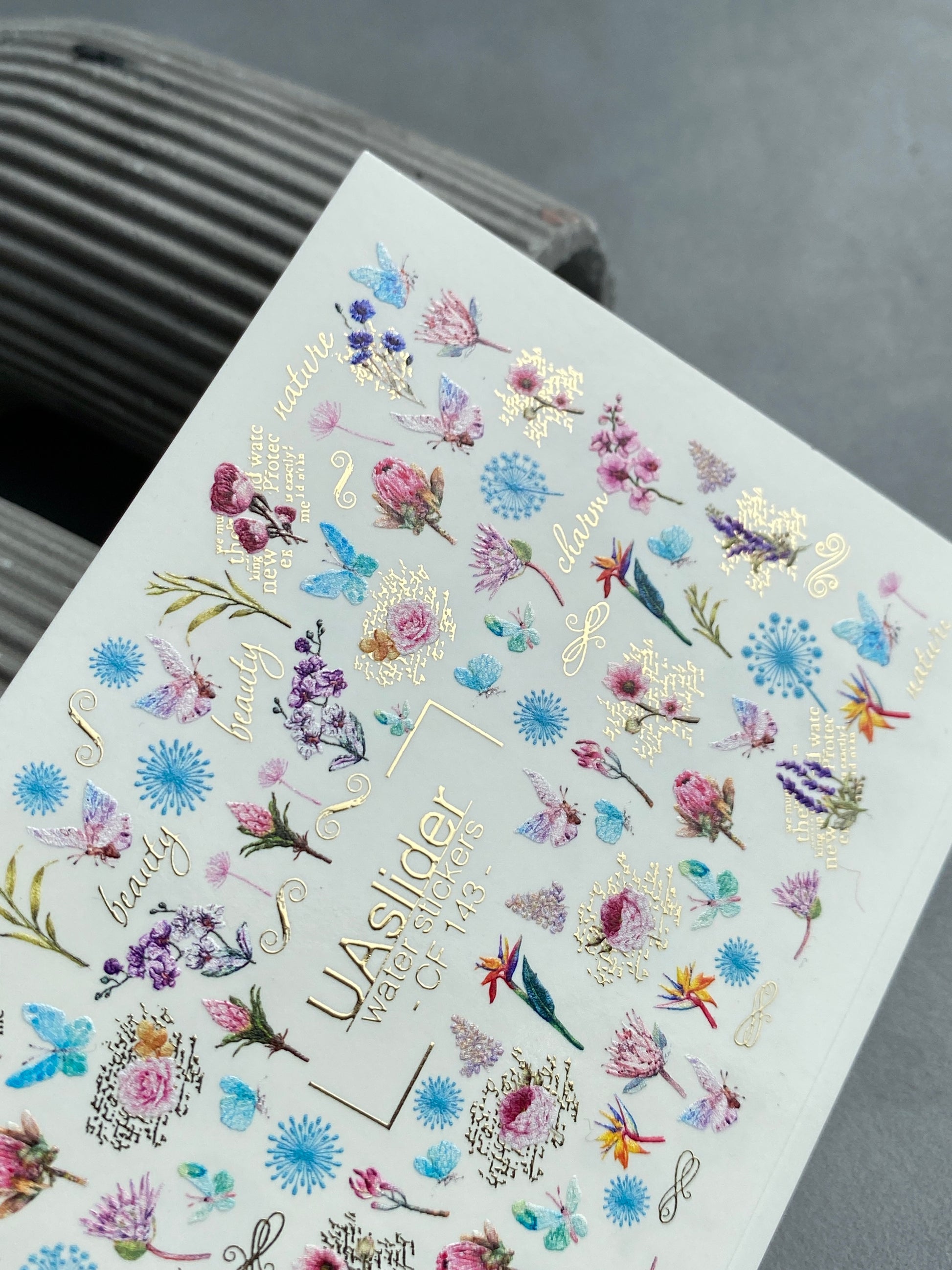 Wildflower water slide nail decals with delicate blossoms, butterflies, and elegant gold foil accents. Designs include blue florals, pink buds, lilac sprigs, and nature-inspired lettering for fresh and romantic nail art.