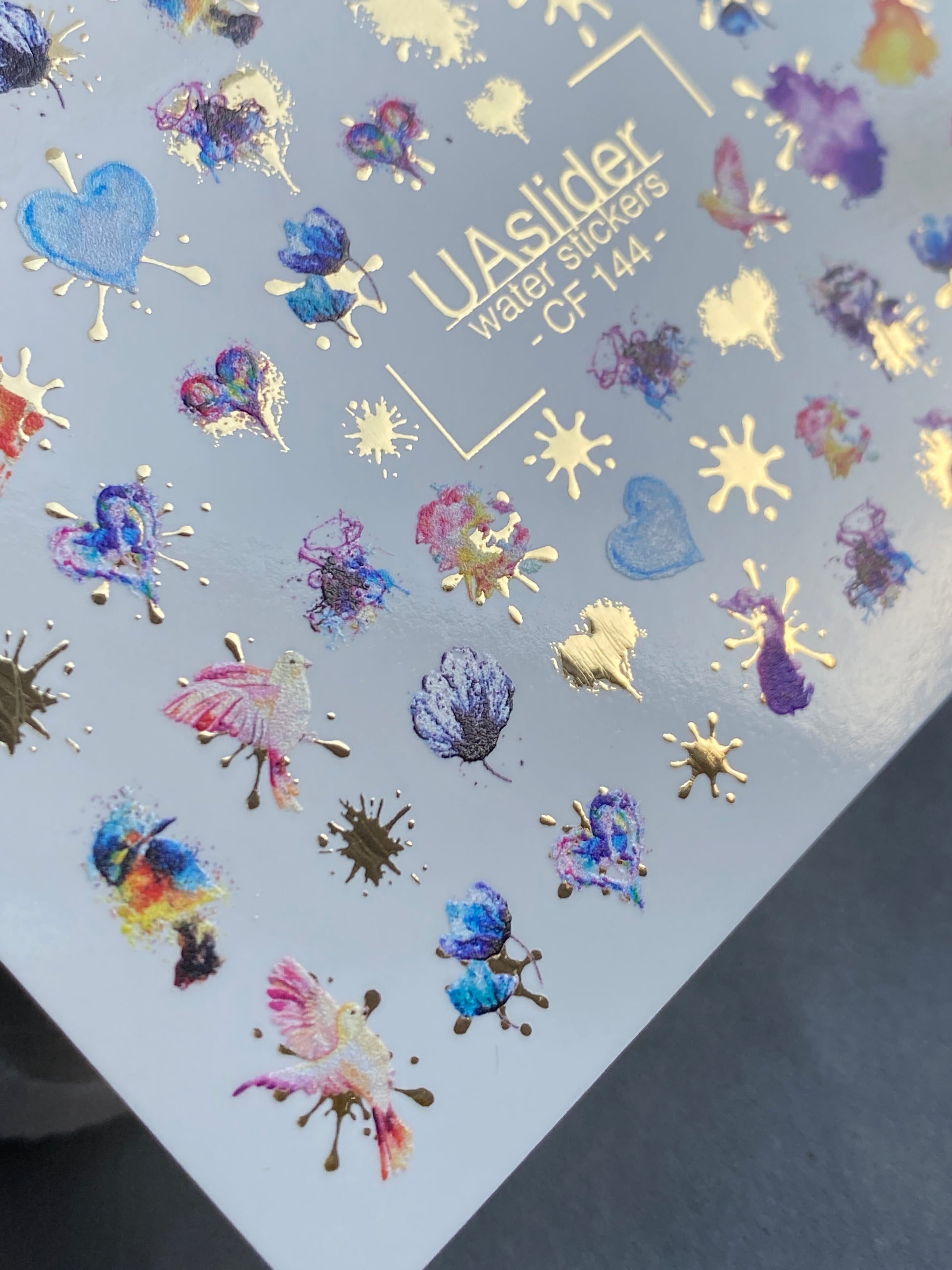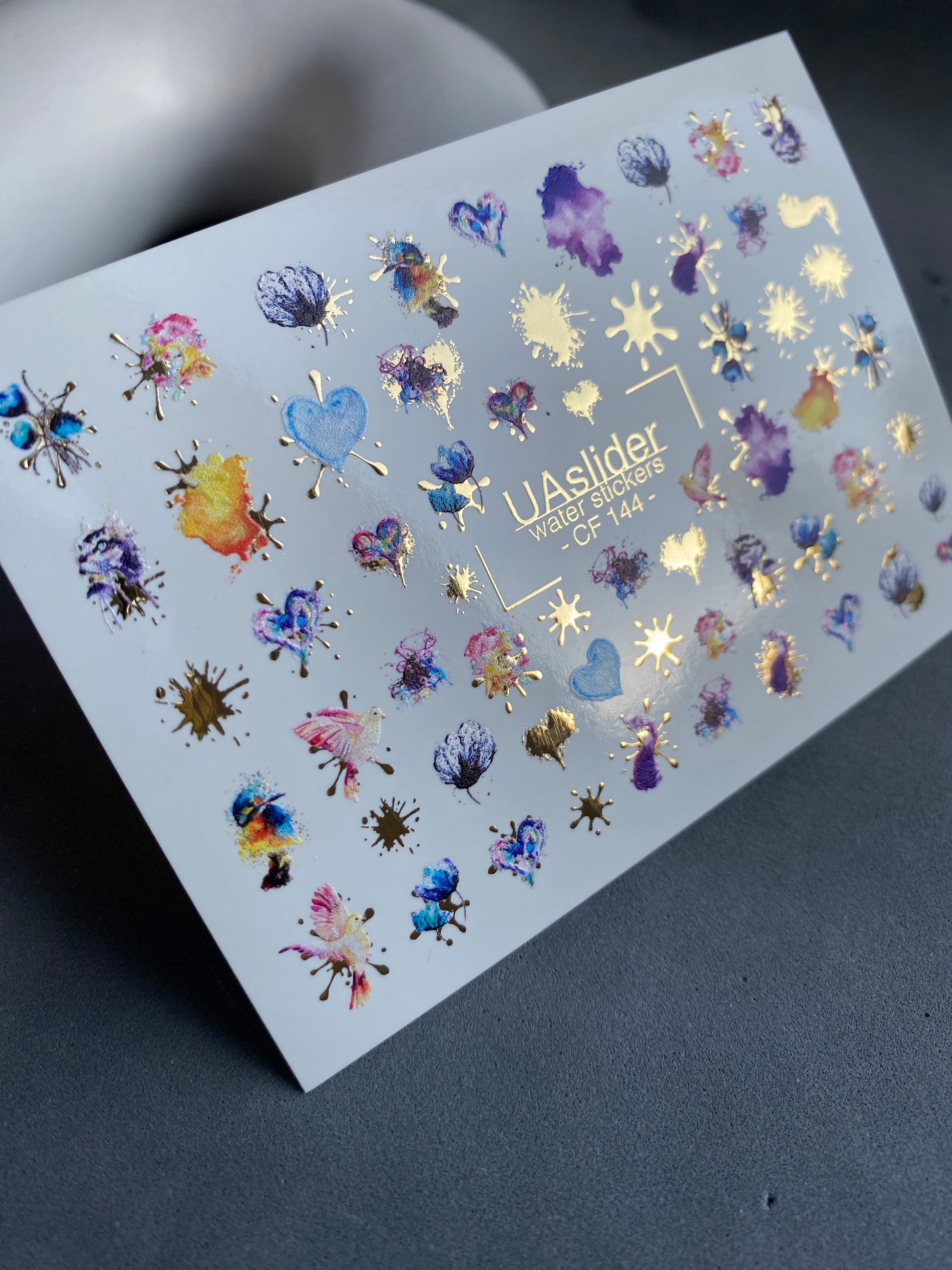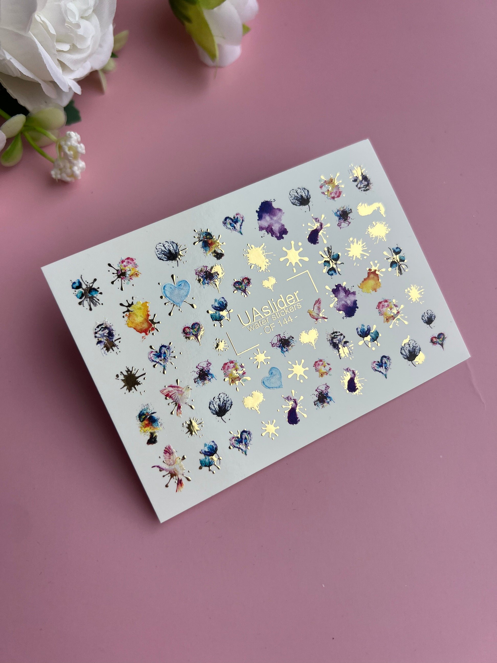Abstract water slide nail decals with colorful paint splashes, hearts, butterflies, flowers, and artistic gold foil details. A creative mix for bold and unique manicure styles.