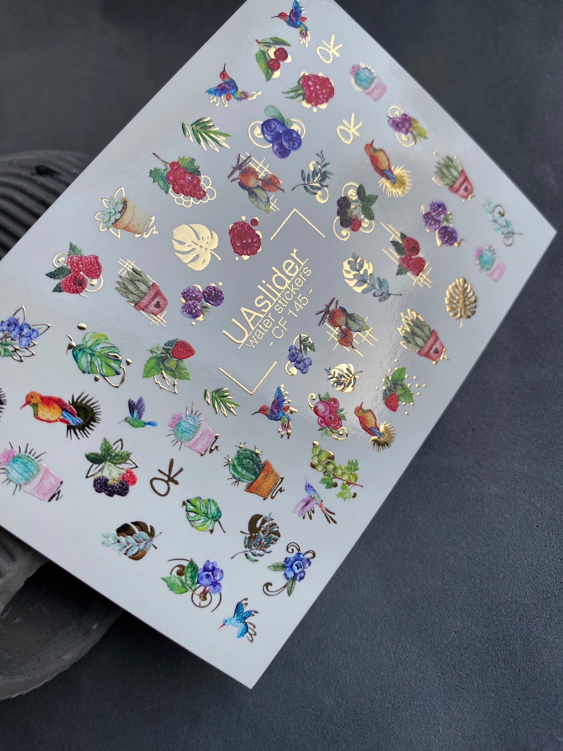 Nail Water Decal CF-145 | Fruit & Cactus Water Slide Nail Decals | Hummingbirds & Gold Foil Details