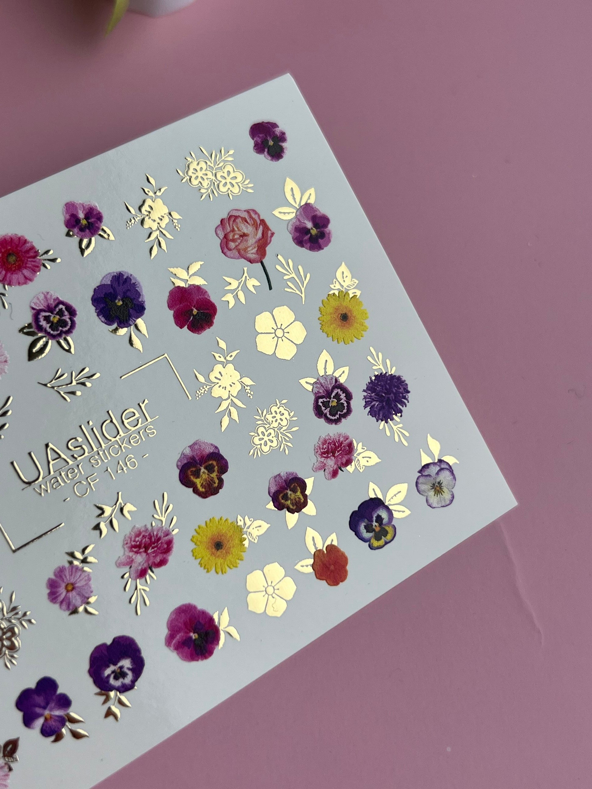 Nail Water Decal CF-146 | Colorful Floral Water Slide Nail Decals | Pansies, Daisies & Gold Foil DetailsCF_146