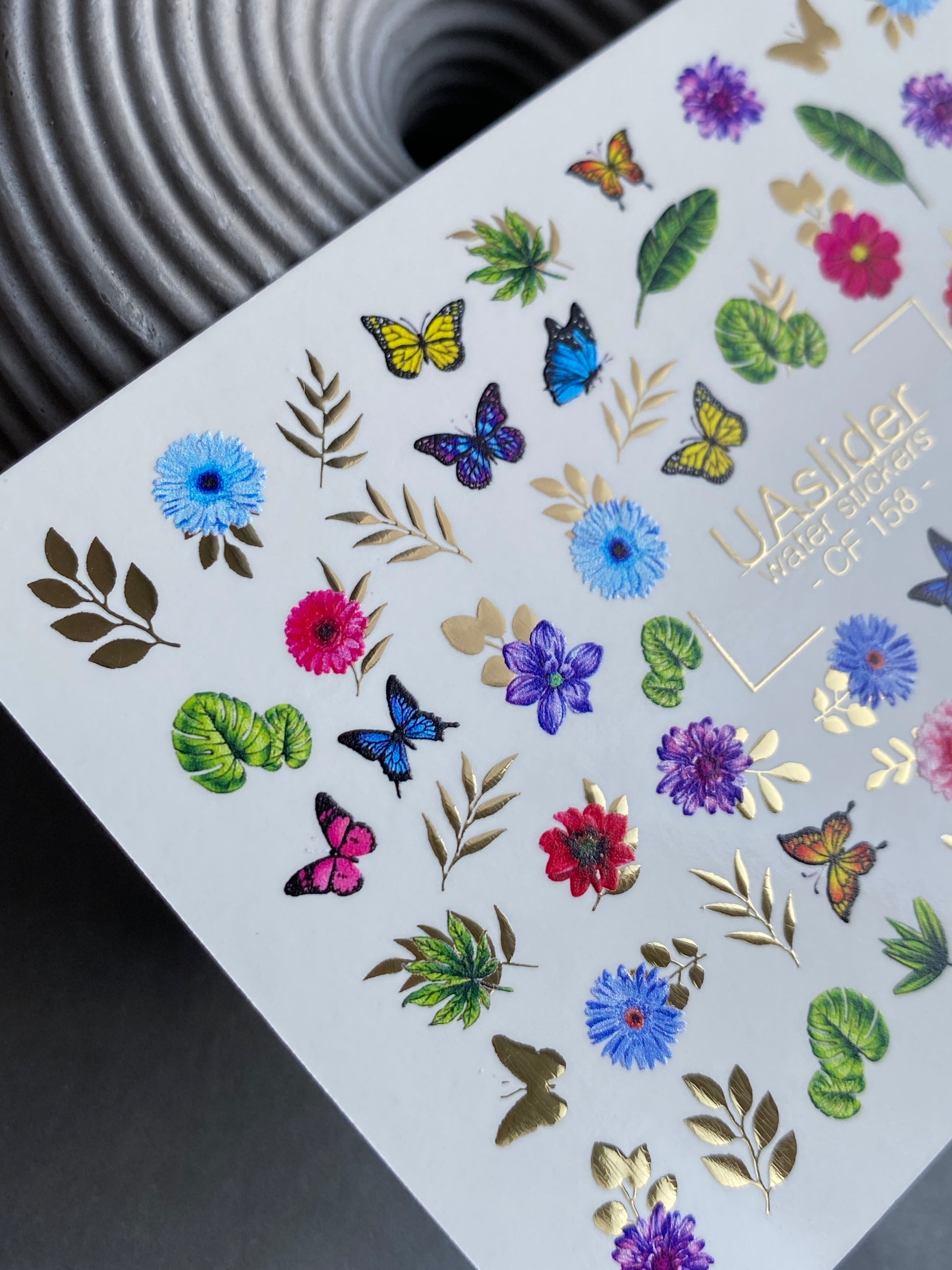 Nail Water Decal CF-158 | Butterfly & Floral Water Slide Nail Decals | Colorful Flowers, Leaves & Gold Foil Accents