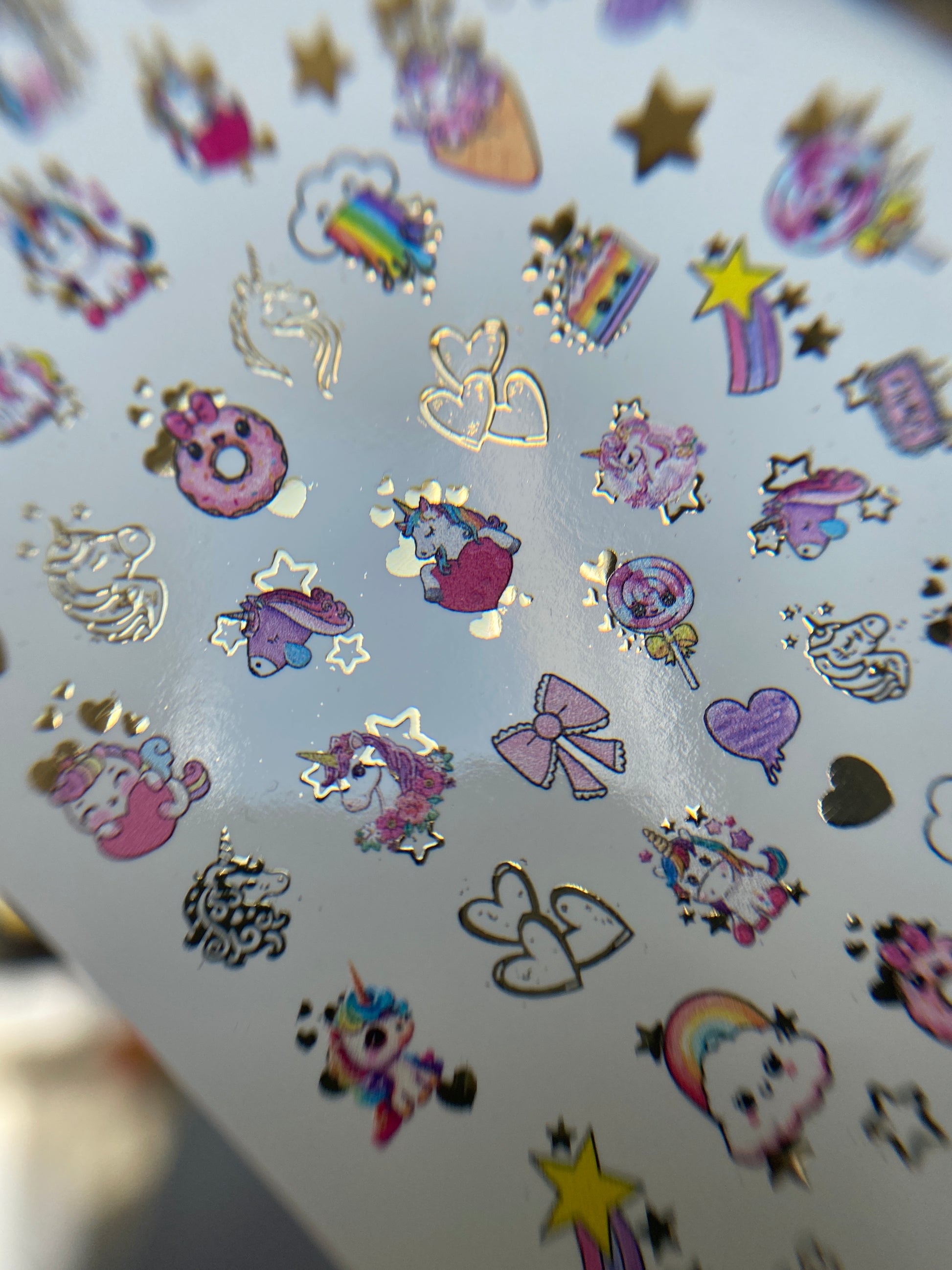 Adorable water slide nail decals featuring unicorns, rainbows, candy, lollipops, hearts, bows, and shiny golden stars. Perfect for fun manicures, kids-inspired designs, or dreamy pastel nail art.