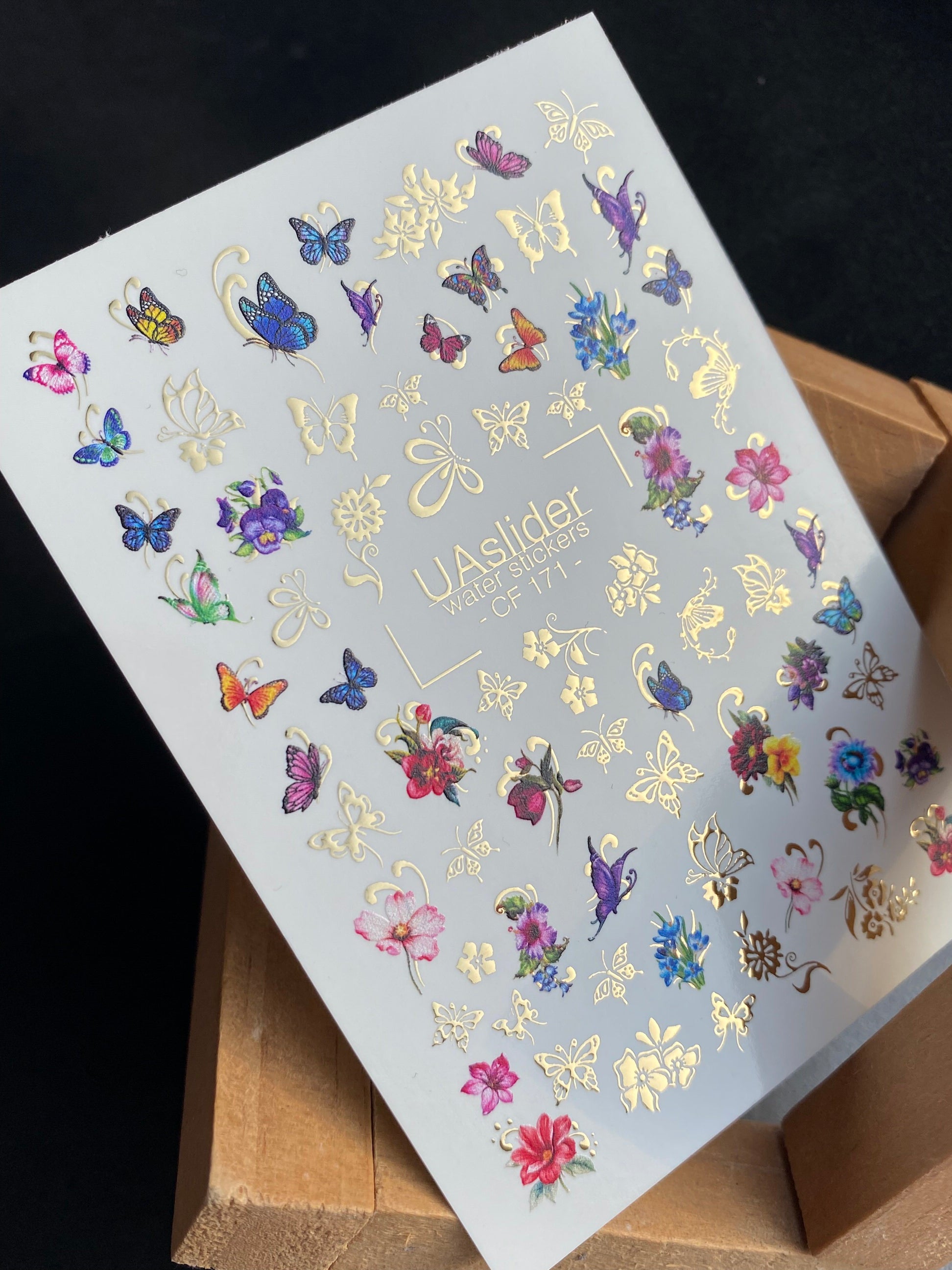 Beautiful water slide nail decals featuring delicate butterflies, colorful blossoms, and golden floral details. These water transfer nail decals are water-activated — cut out your favorite design, soak in warm water, and slide it onto the nail for a smooth application.