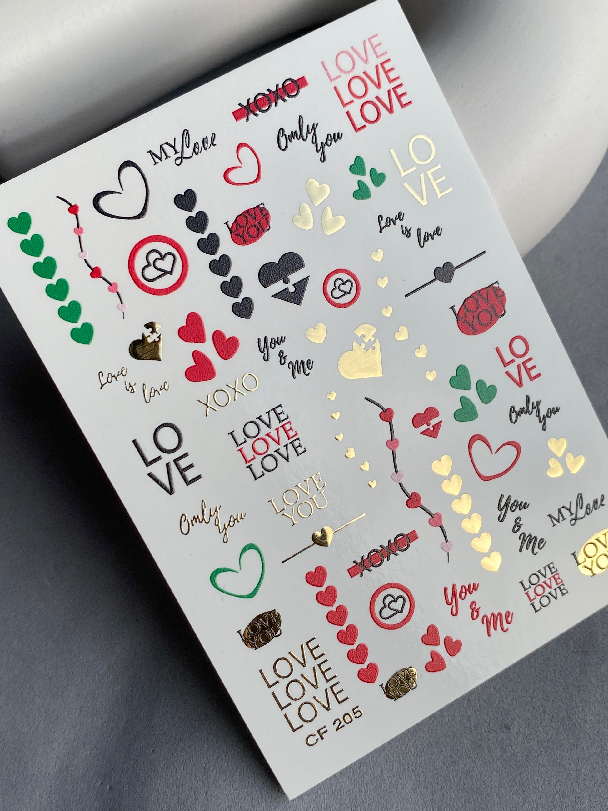 Nail Water Decal CF-205 | Nail Water Decals | Love Phrases & Hearts with Gold Accents