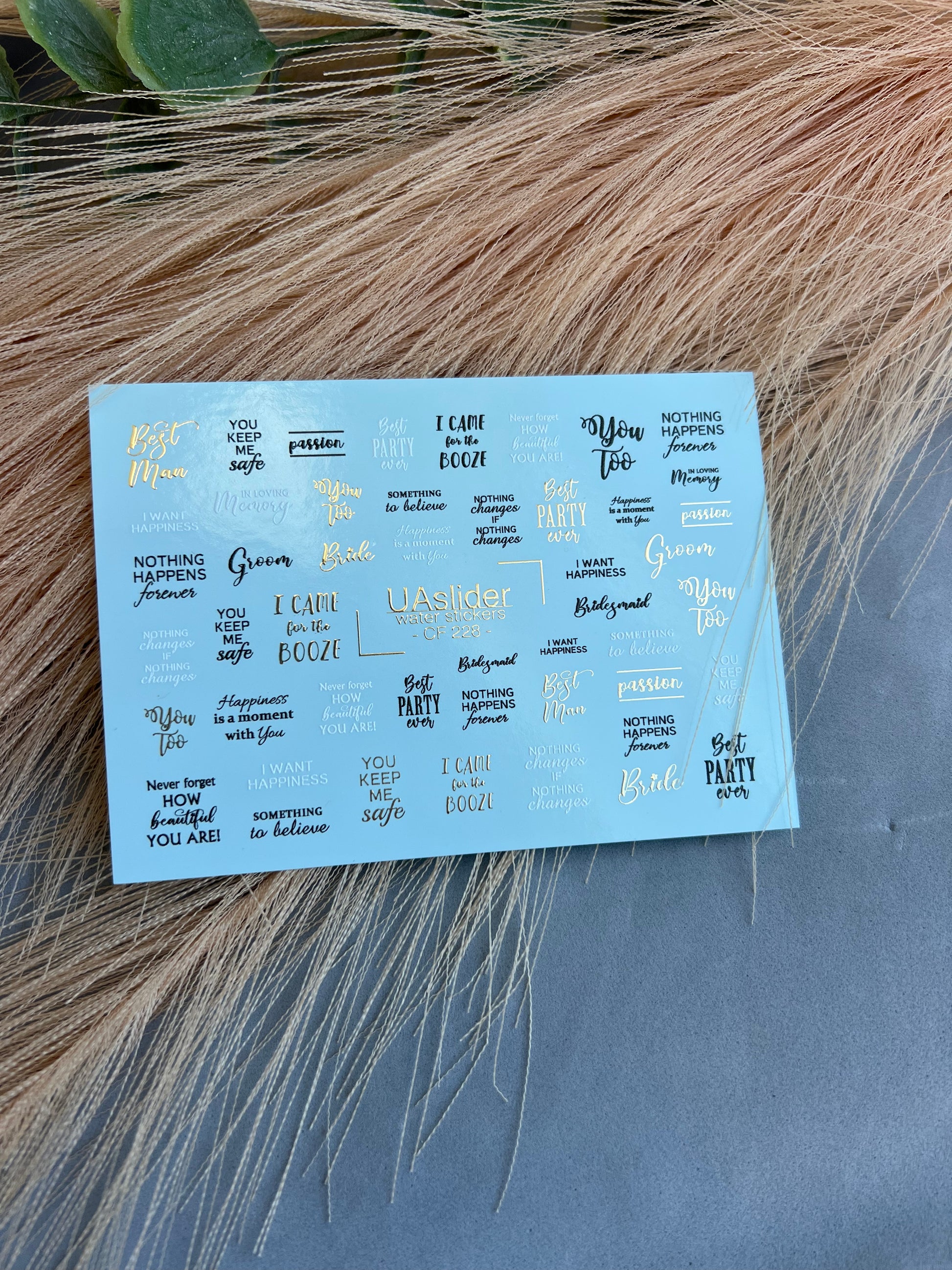Lettering water slide nail decals with playful wedding-themed phrases like “Bride”, “Groom”, “Best Man”, “Bridesmaid”, and “Best Party Ever”. The set also includes inspirational quotes with black, white, and gold details.