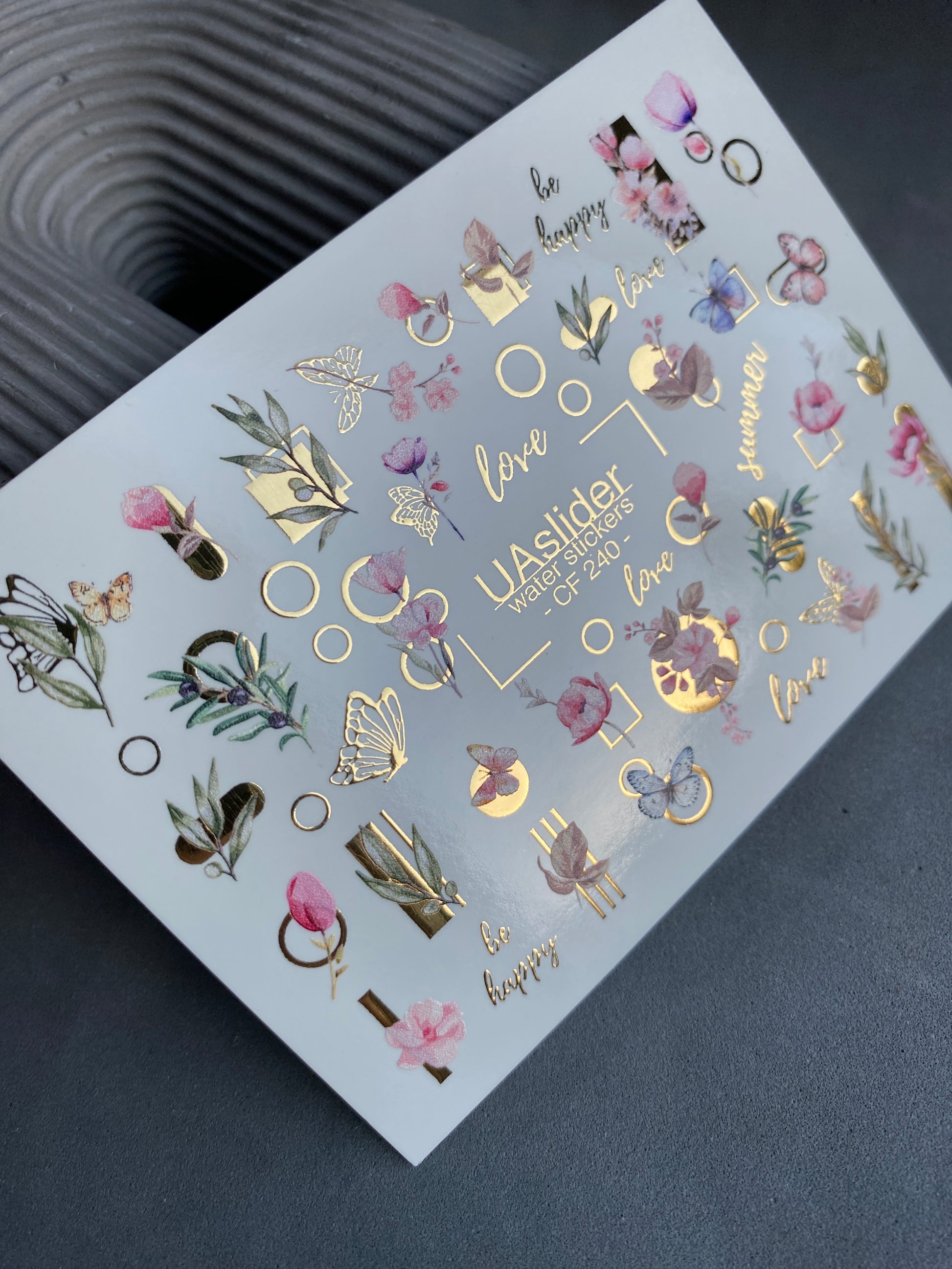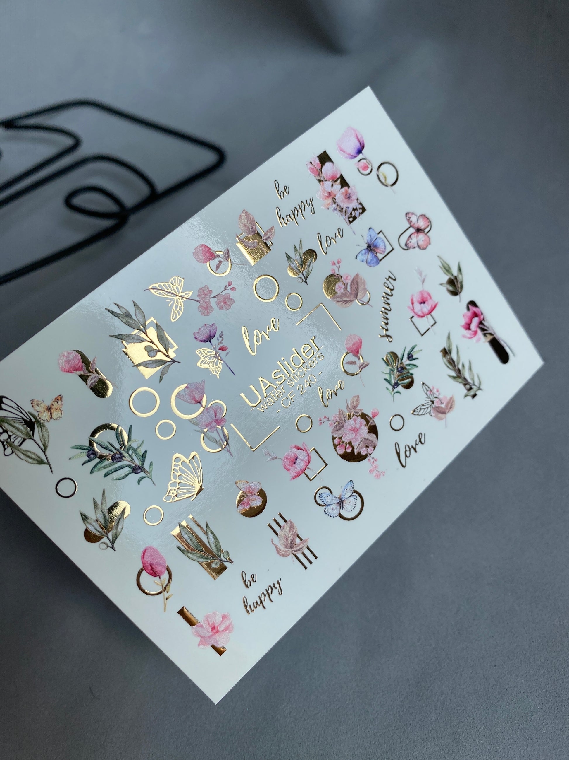 Floral water slide nail decals with delicate pink blossoms, green leaves, butterflies, and modern golden geometric shapes. Lettering such as “Be Happy” and “Love” adds an elegant and romantic accent.