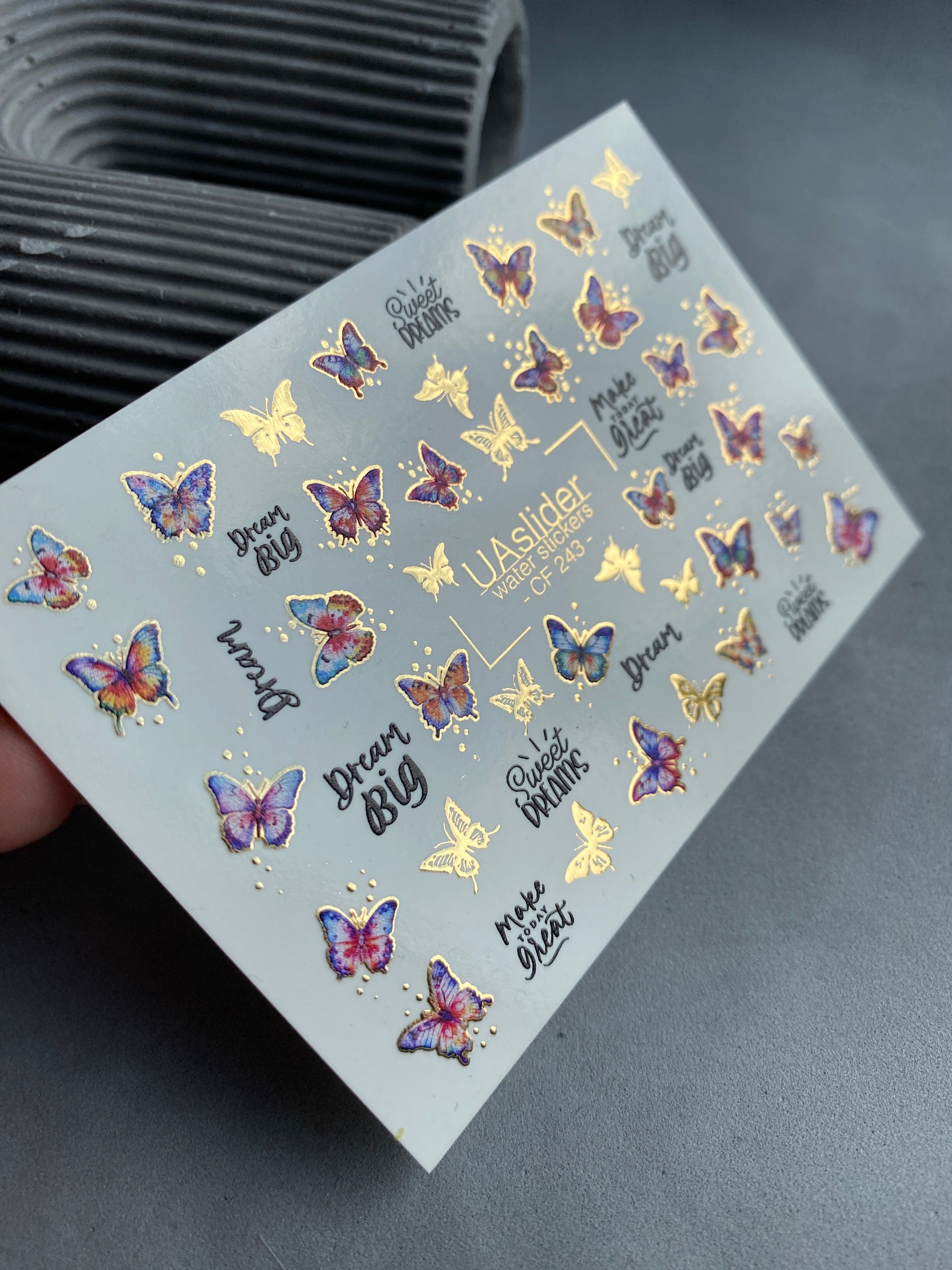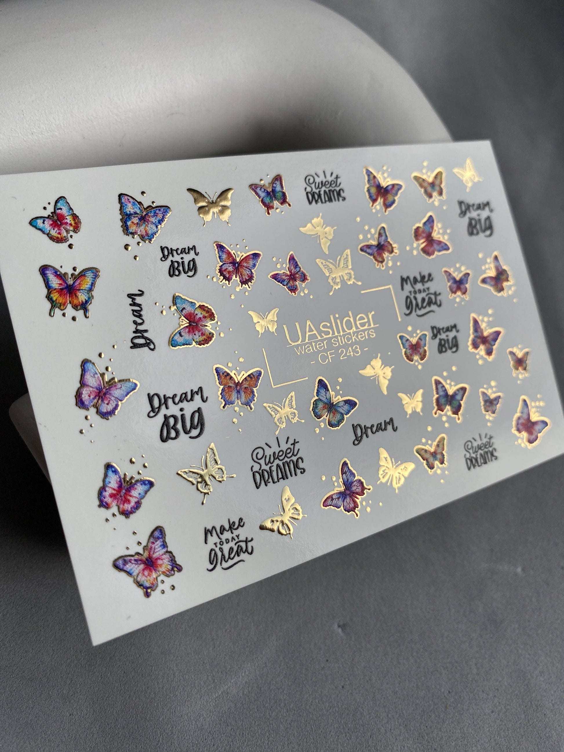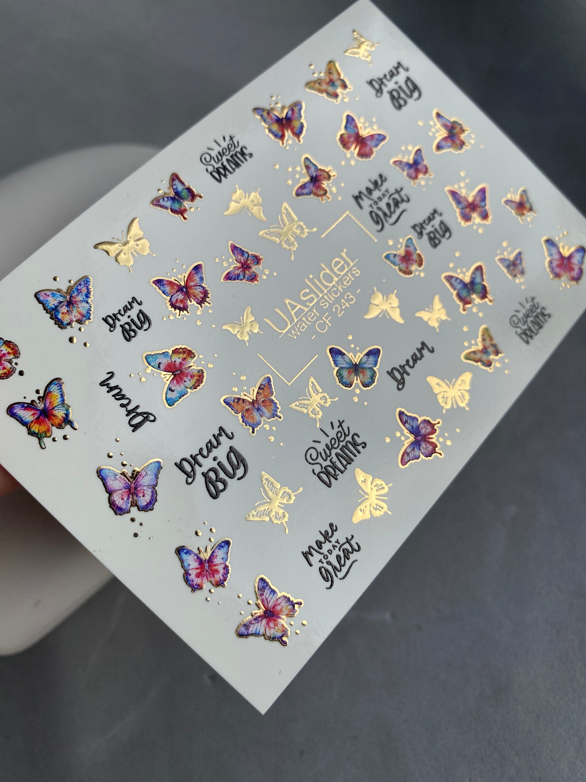 Colorful butterfly water slide nail decals featuring vibrant gradient wings in pink, purple, and blue tones with shimmering golden details. Inspirational lettering like “Dream Big” and “Make Today Great” adds a motivational touch.