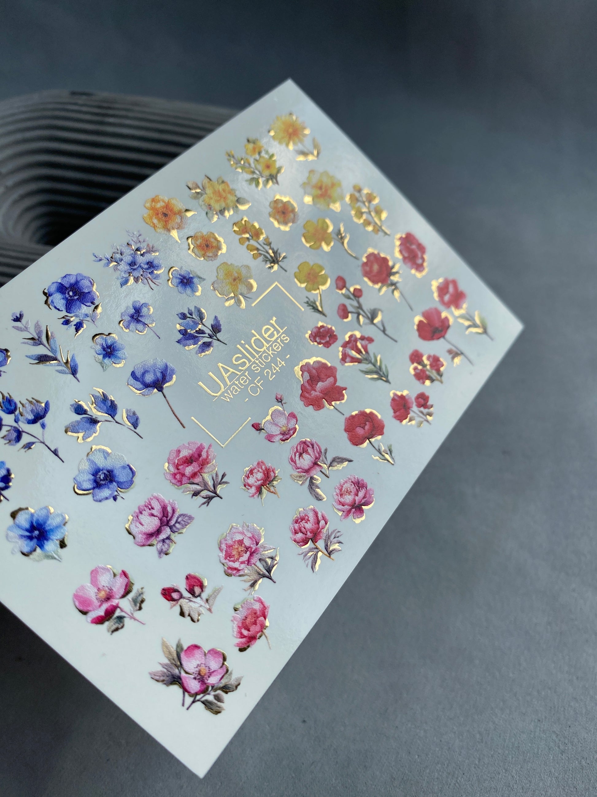 Colorful floral water slide nail decals with a variety of blossoms in red, blue, pink, and yellow shades, highlighted with shimmering golden details. A versatile set to create romantic, bright, and stylish manicures.